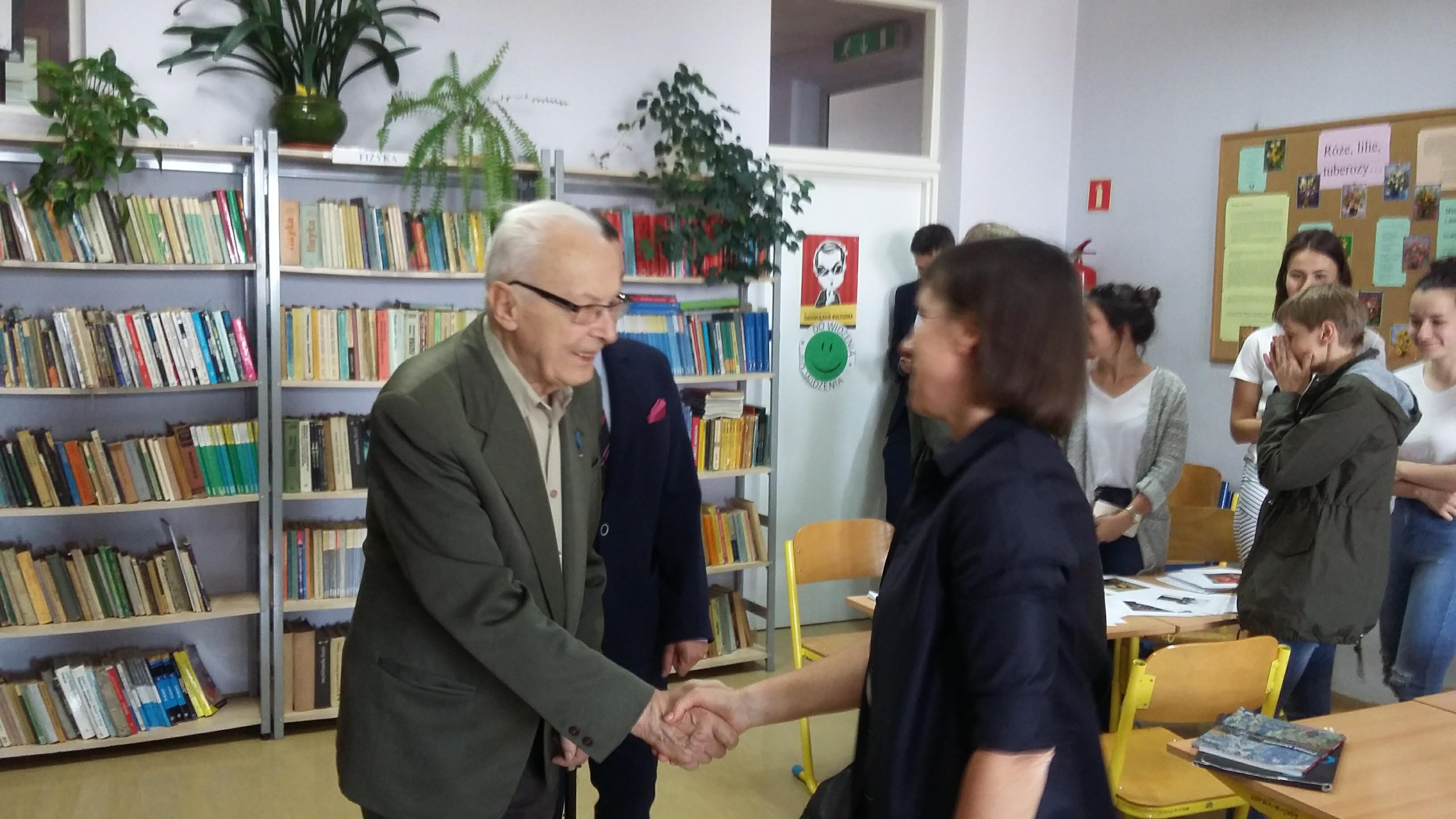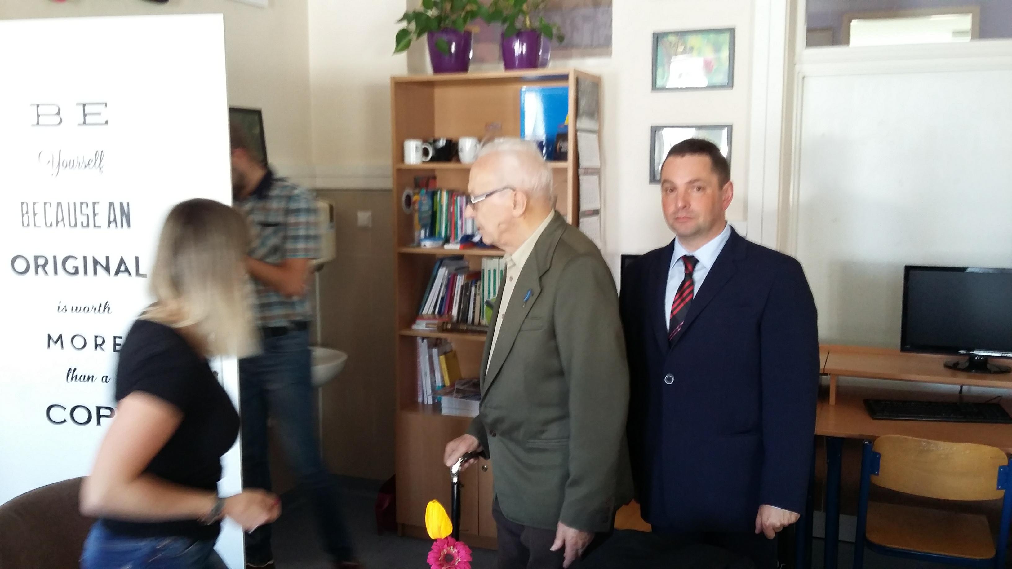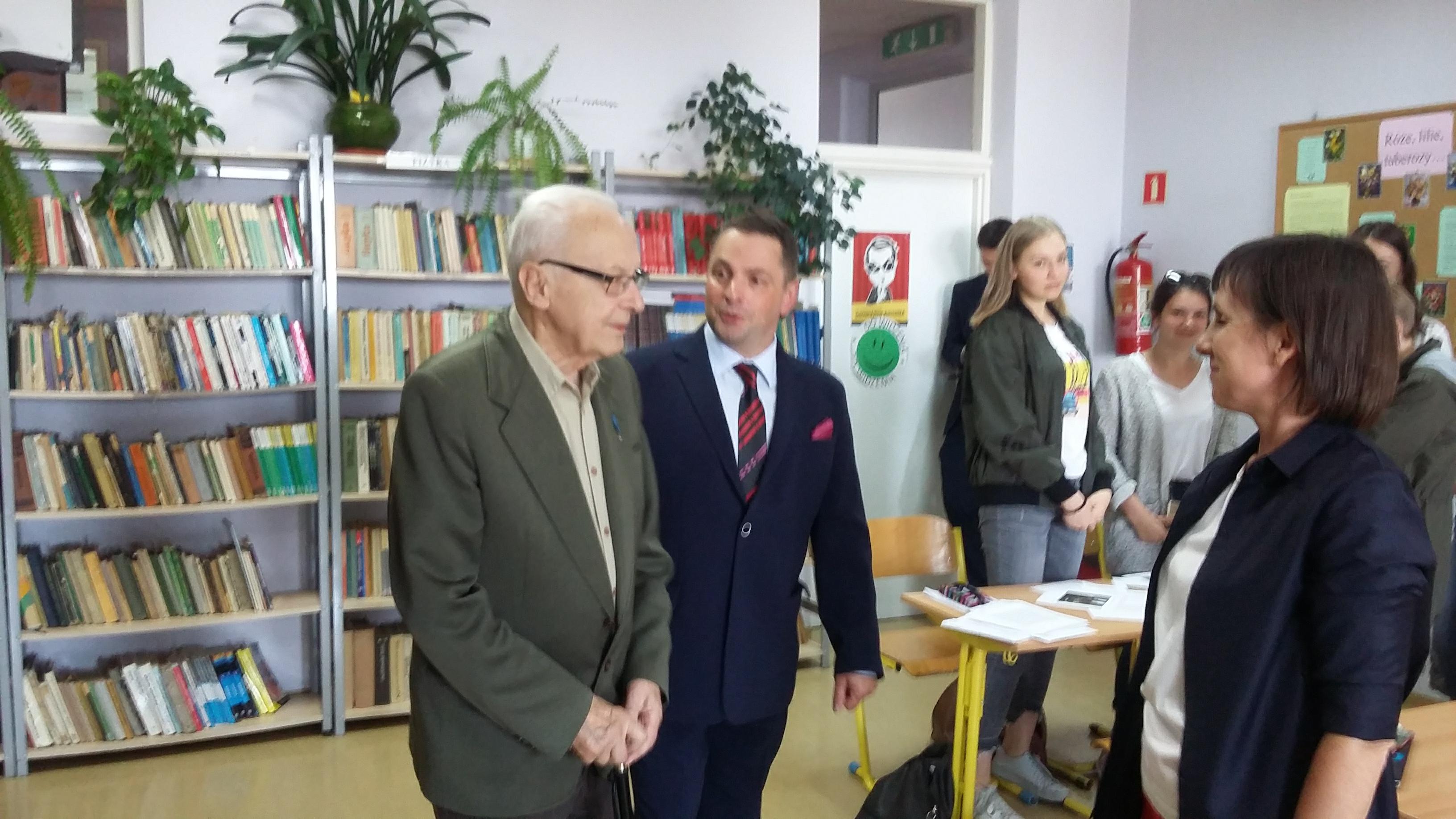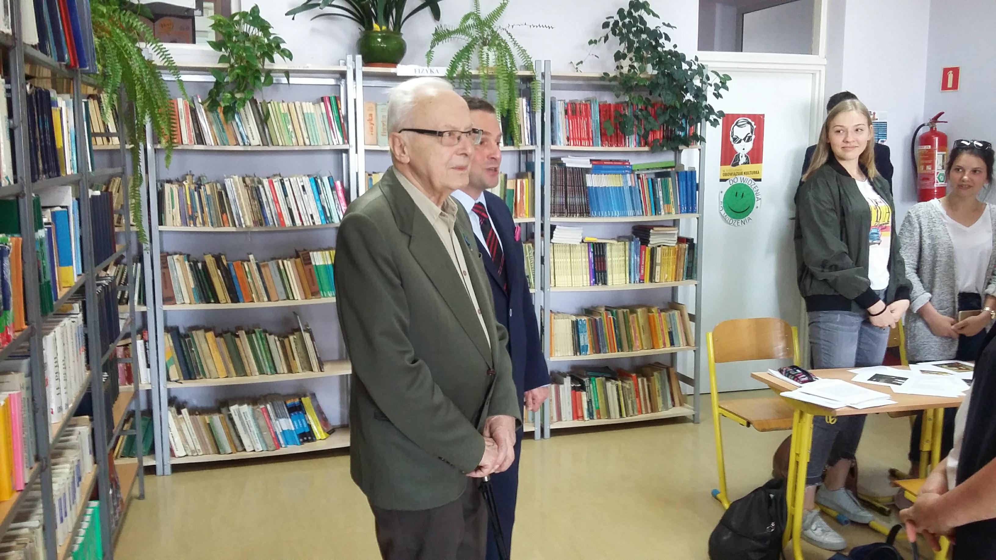 Po blisko półtoragodzinnym spotkaniu z uczniami naszej szkoły oraz grupą historyczną „Żołnierze Niezłomni, Niepokorni, Wyklęci – Pamiętamy!” prowadzoną przez Barbarę Marię Górczewską z Publicznej Szkoły Podstawowej nr 2 nasz szanowny gość z młodzieńczą wręcz werwą w otoczeniu gospodarzy spotkania dr. Piotrem Dudą oraz uczniami 3g Rafałem Kargolem i Kacprem Putem zwiedził naszą szkołę. Zawitał m.in. do studia filmowego, pracowni reklamy, biblioteki oraz jednej z sal historycznych, stwierdzając m.in., że w tak dobrze wyposażonej szkole jeszcze nie był, a zapraszano go do wielu placówek.