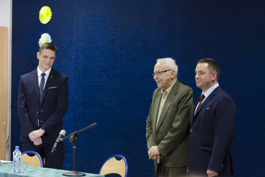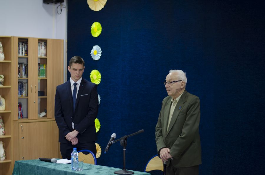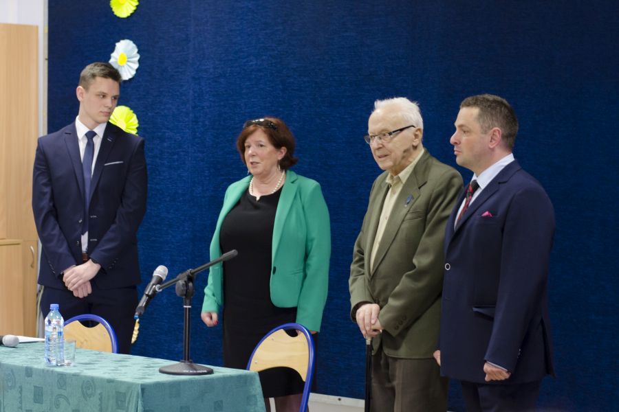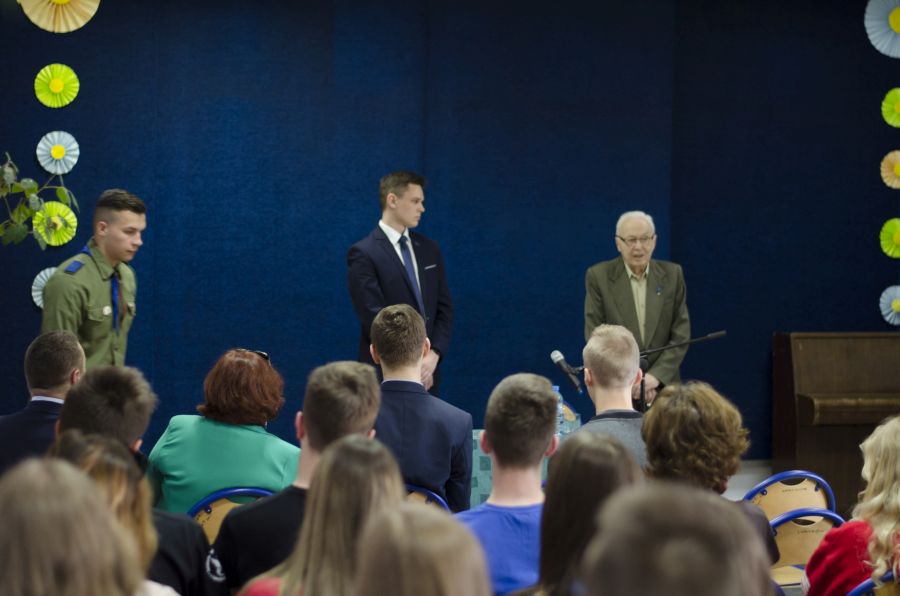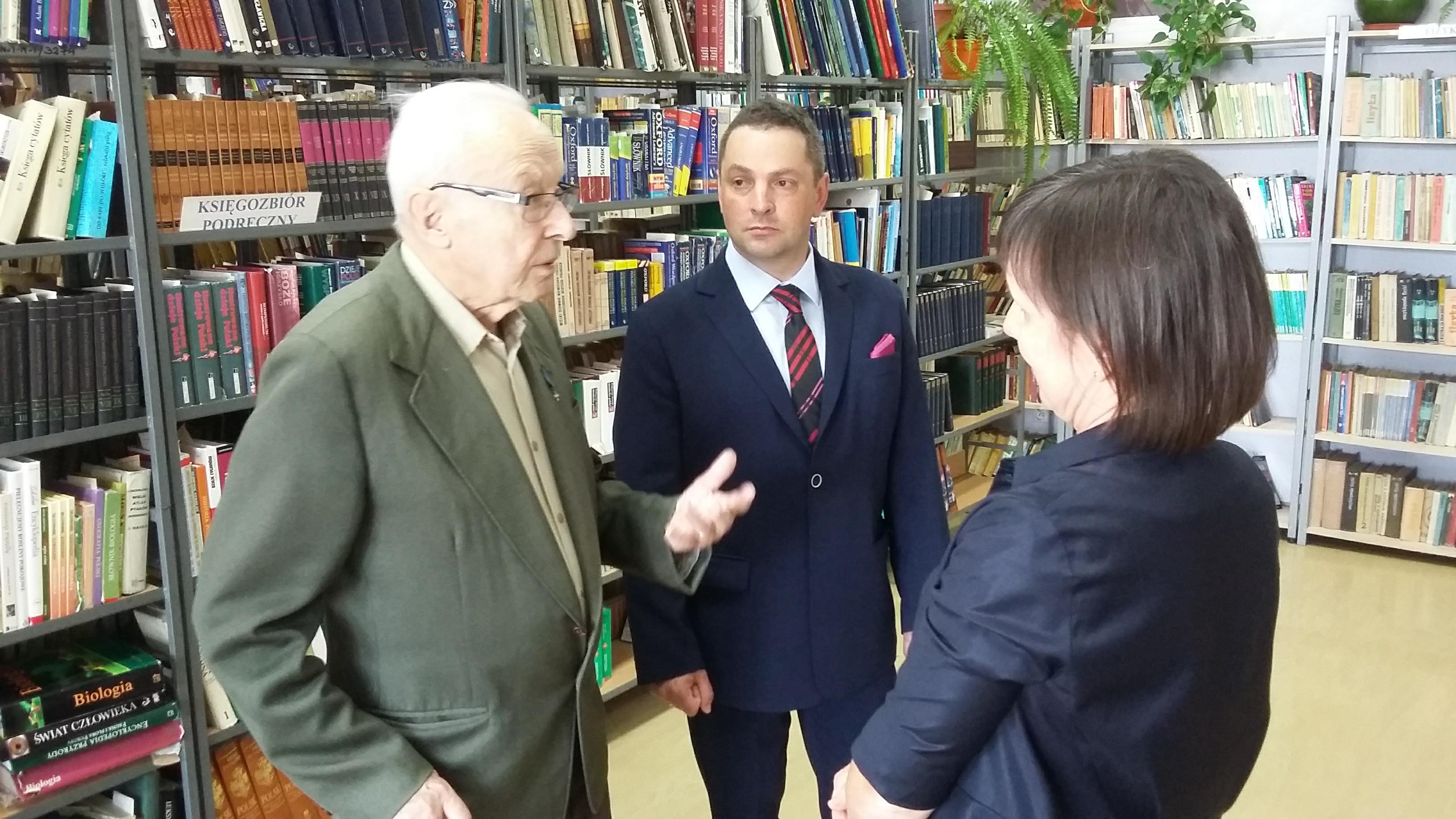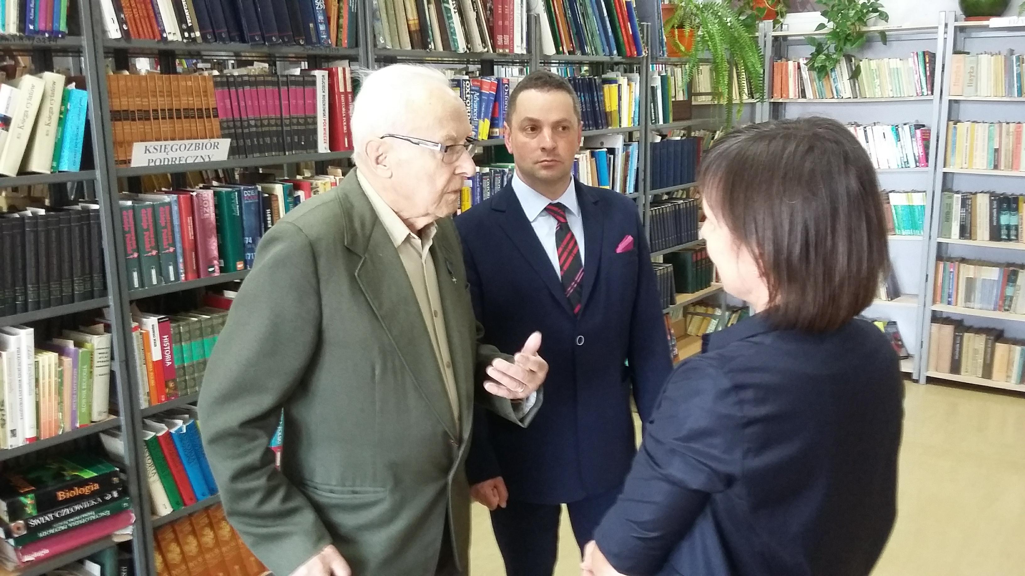 Po blisko półtoragodzinnym spotkaniu z uczniami naszej szkoły oraz grupą historyczną „Żołnierze Niezłomni, Niepokorni, Wyklęci – Pamiętamy!” prowadzoną przez Barbarę Marię Górczewską z Publicznej Szkoły Podstawowej nr 2 nasz szanowny gość z młodzieńczą wręcz werwą w otoczeniu gospodarzy spotkania dr. Piotrem Dudą oraz uczniami 3g Rafałem Kargolem i Kacprem Putem zwiedził naszą szkołę. Zawitał m.in. do studia filmowego, pracowni reklamy, biblioteki oraz jednej z sal historycznych, stwierdzając m.in., że w tak dobrze wyposażonej szkole jeszcze nie był, a zapraszano go do wielu placówek.