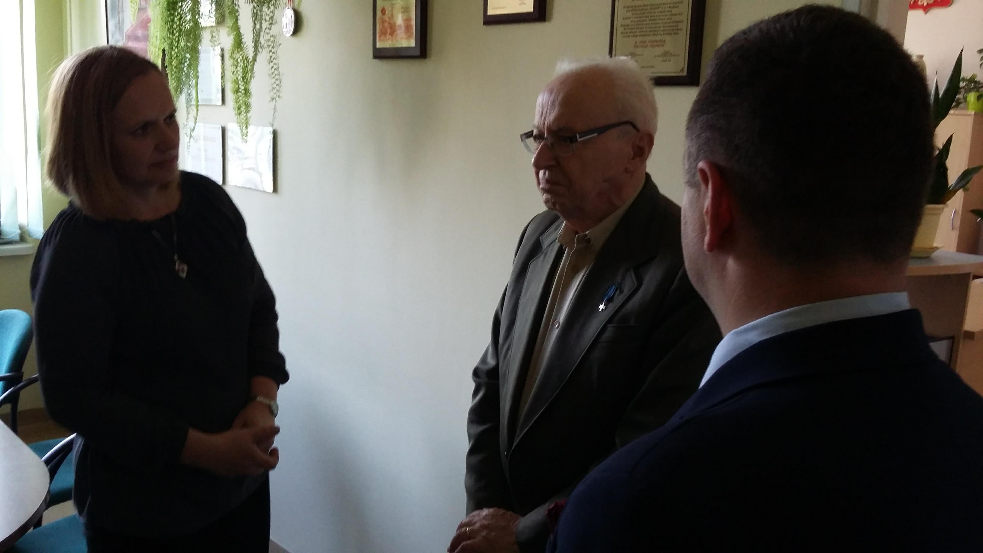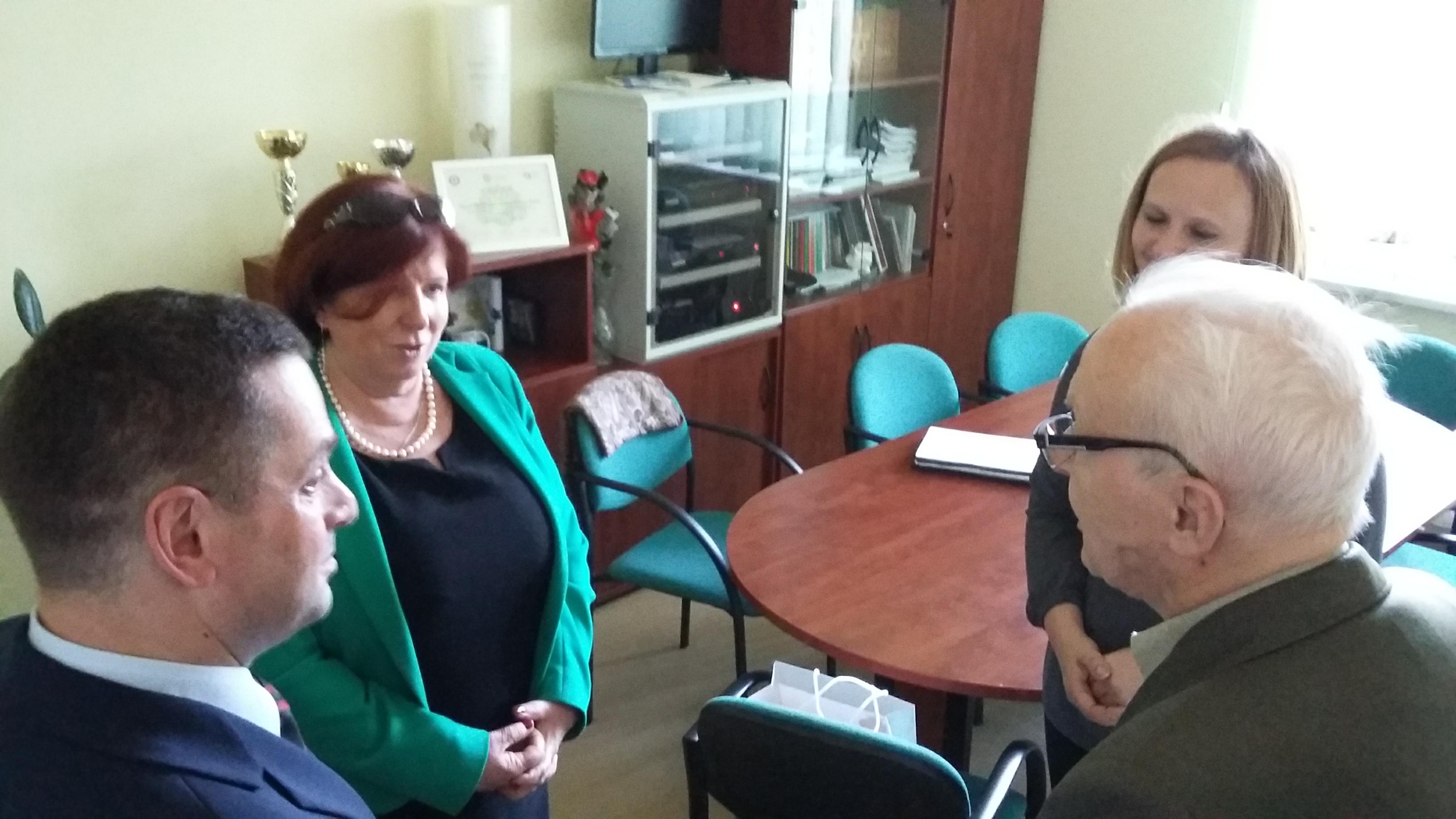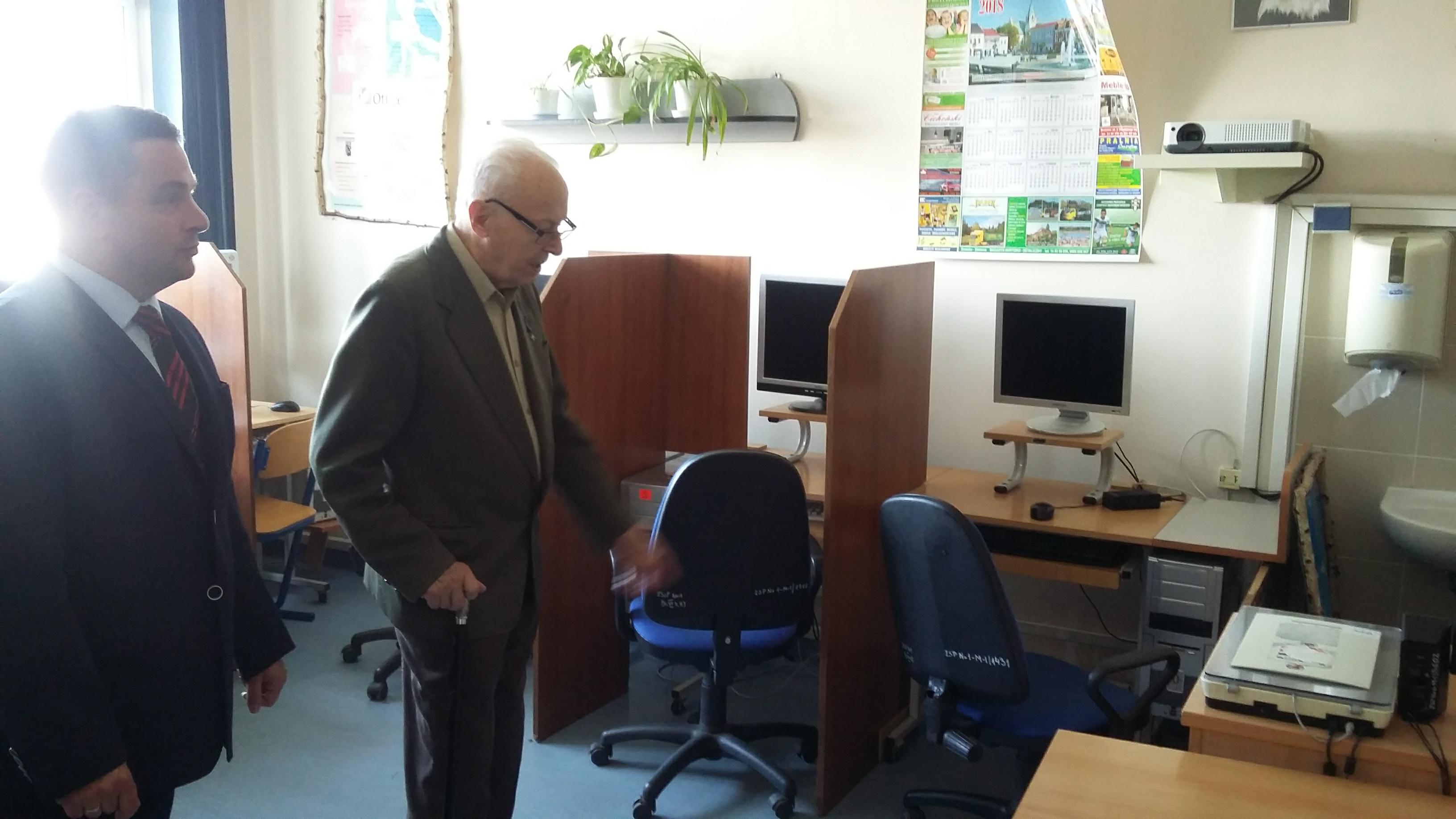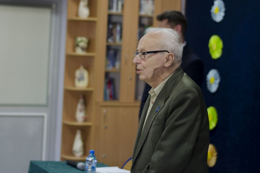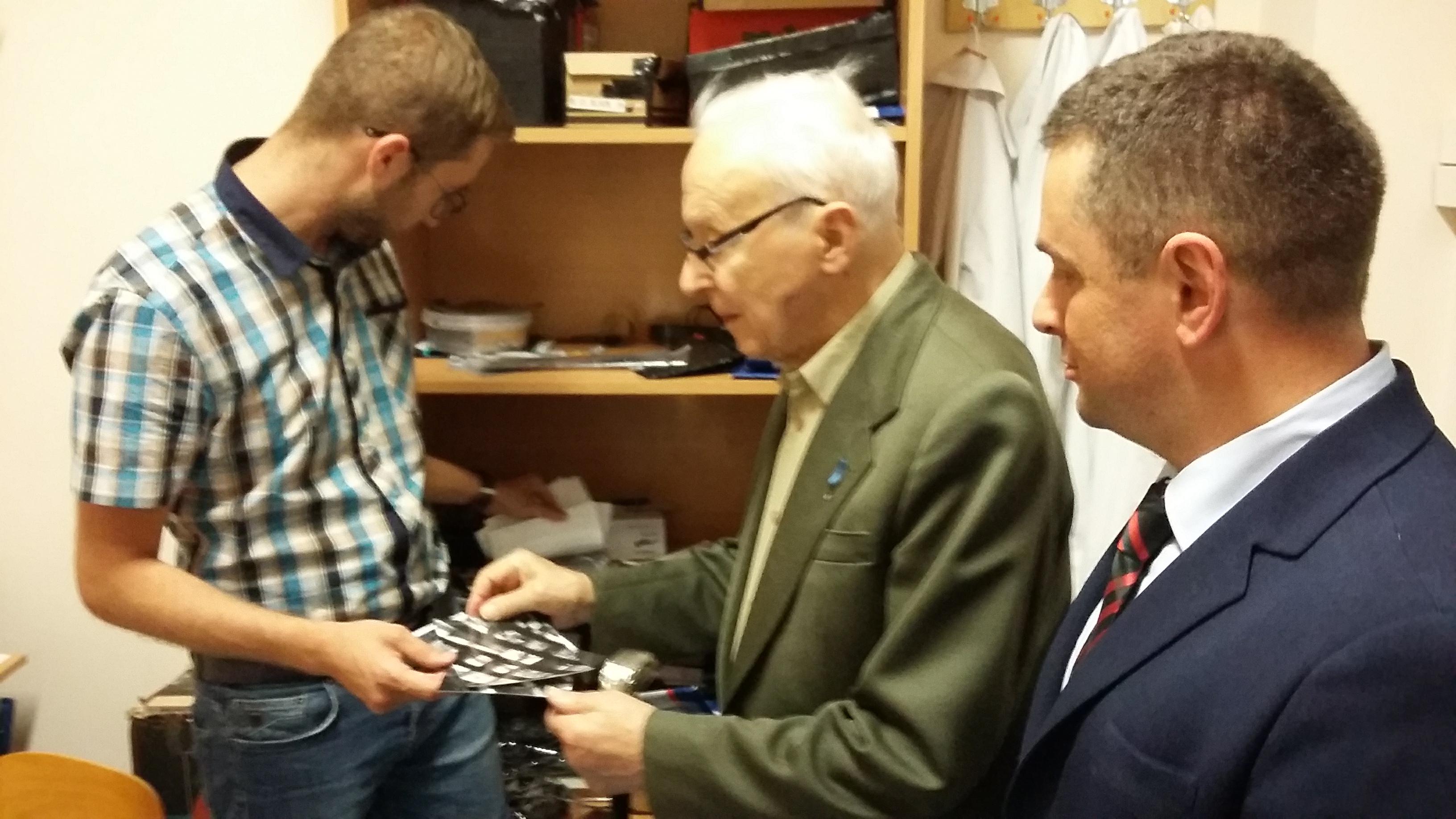 Po blisko półtoragodzinnym spotkaniu z uczniami naszej szkoły oraz grupą historyczną „Żołnierze Niezłomni, Niepokorni, Wyklęci – Pamiętamy!” prowadzoną przez Barbarę Marię Górczewską z Publicznej Szkoły Podstawowej nr 2 nasz szanowny gość z młodzieńczą wręcz werwą w otoczeniu gospodarzy spotkania dr. Piotrem Dudą oraz uczniami 3g Rafałem Kargolem i Kacprem Putem zwiedził naszą szkołę. Zawitał m.in. do studia filmowego, pracowni reklamy, biblioteki oraz jednej z sal historycznych, stwierdzając m.in., że w tak dobrze wyposażonej szkole jeszcze nie był, a zapraszano go do wielu placówek.
