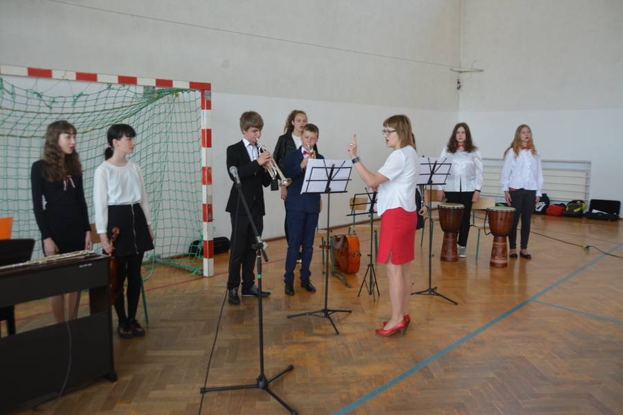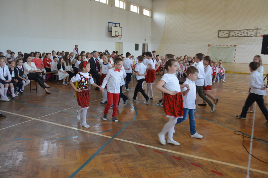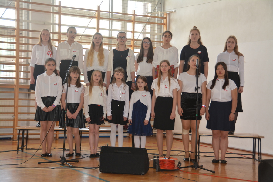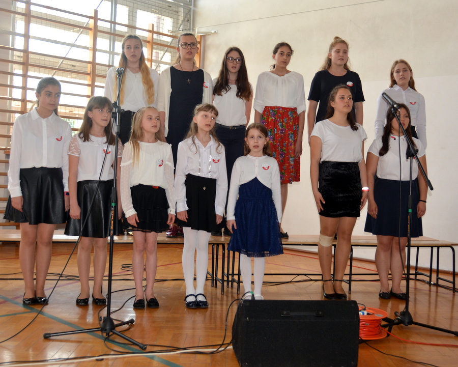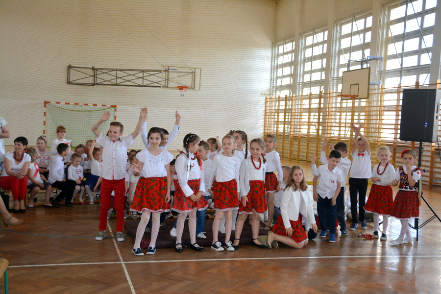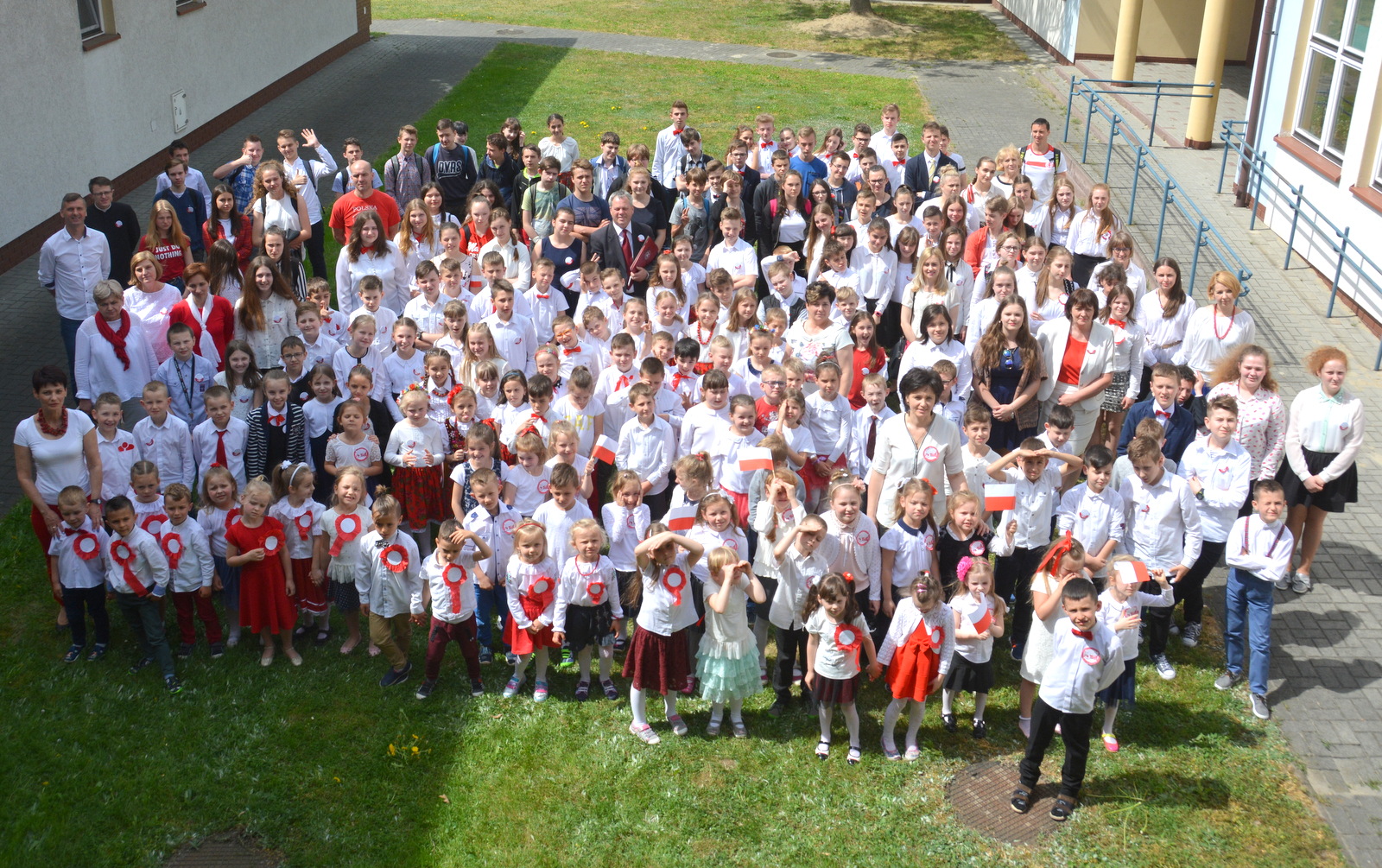 Uczniowie i nauczyciele w strojach biało-czerwonych lub z elementami tych barw zaprezentowali się bardzo uroczyście i pomysłowo sami będąc świadectwem osobistego przeżywania i świętowania ważnych polskich świąt. Uroczystości zakończyło wspólne pamiątkowe zdjęcie wszystkich klas na dziedzińcu szkolnym.