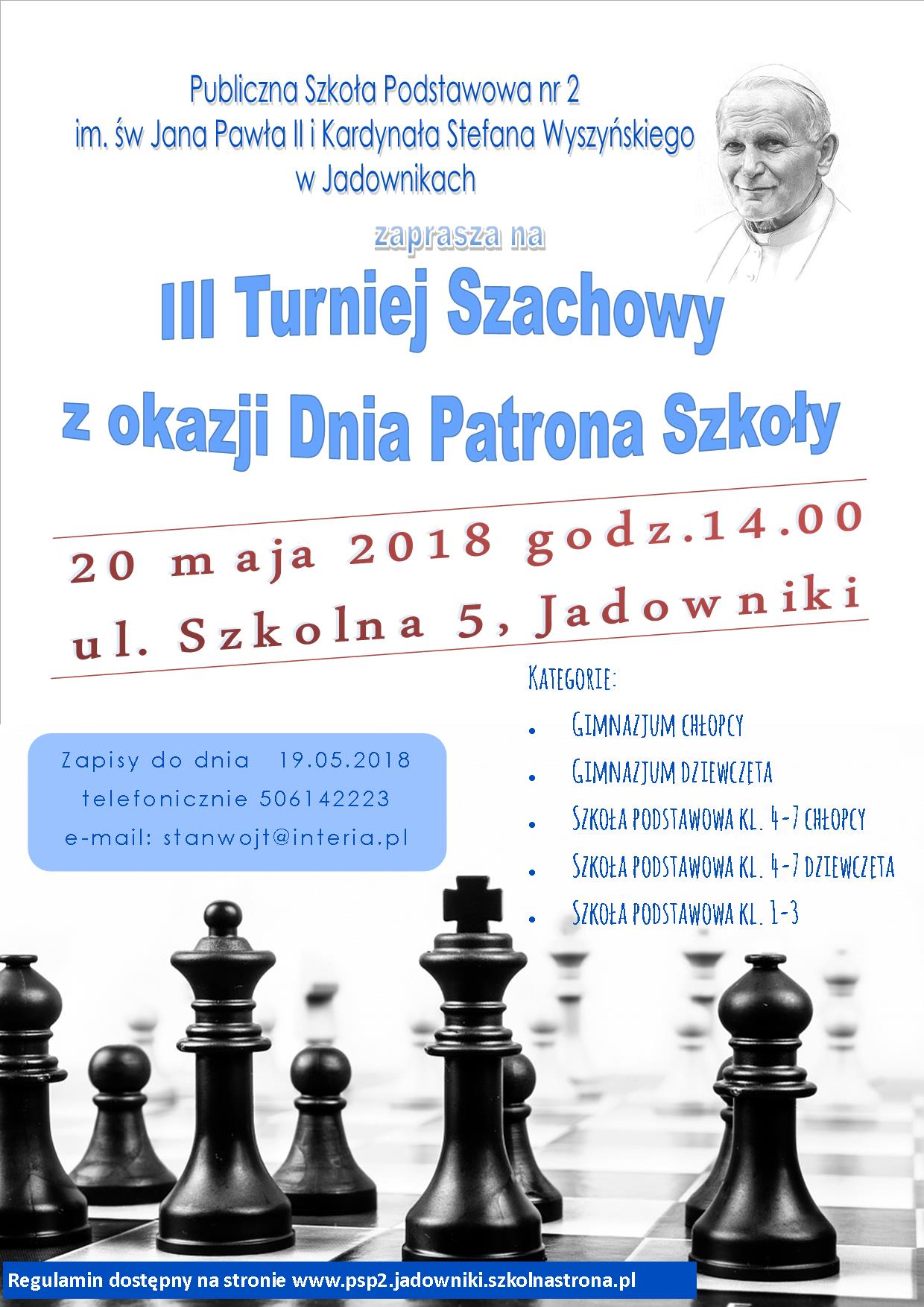 Tego samego dnia w szkole odbywać się będzie turniej szachowy przygotowany z okazji Dnia Patrona Szkoły. Rozgrywany będzie w kilku kategoriach wiekowych, jego początek zaplanowano na godzinę 14.00. Zapisy do turnieju trwać będą do 19 maja pod numerem telefonu 506 142 223 lub pod adresem stanwojt@interia.pl