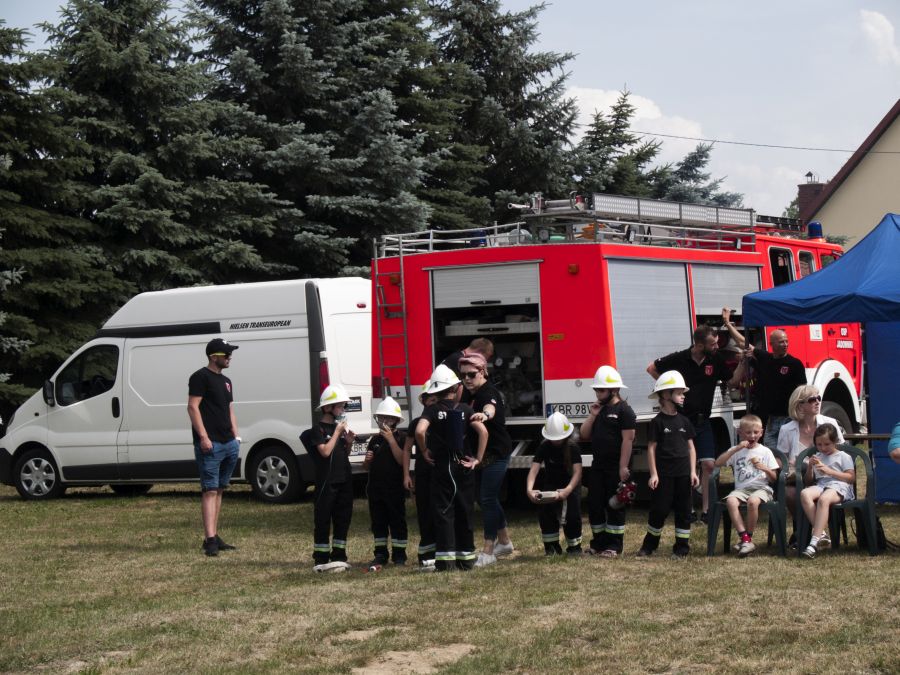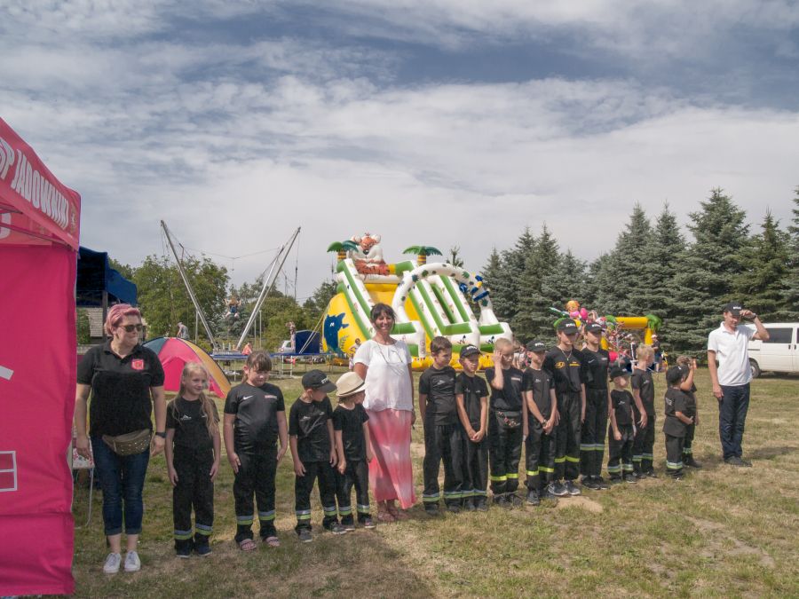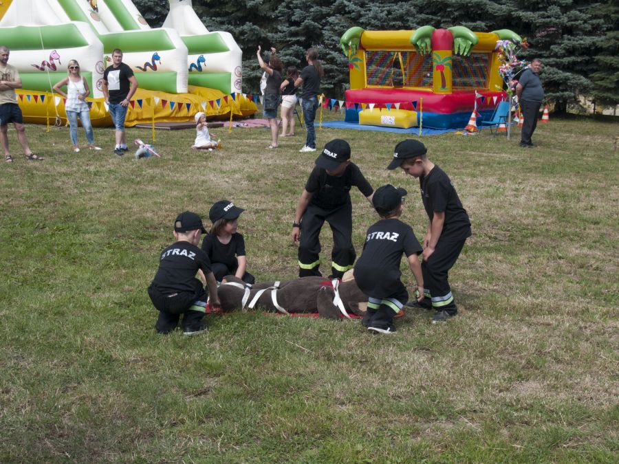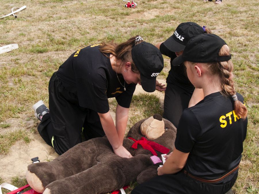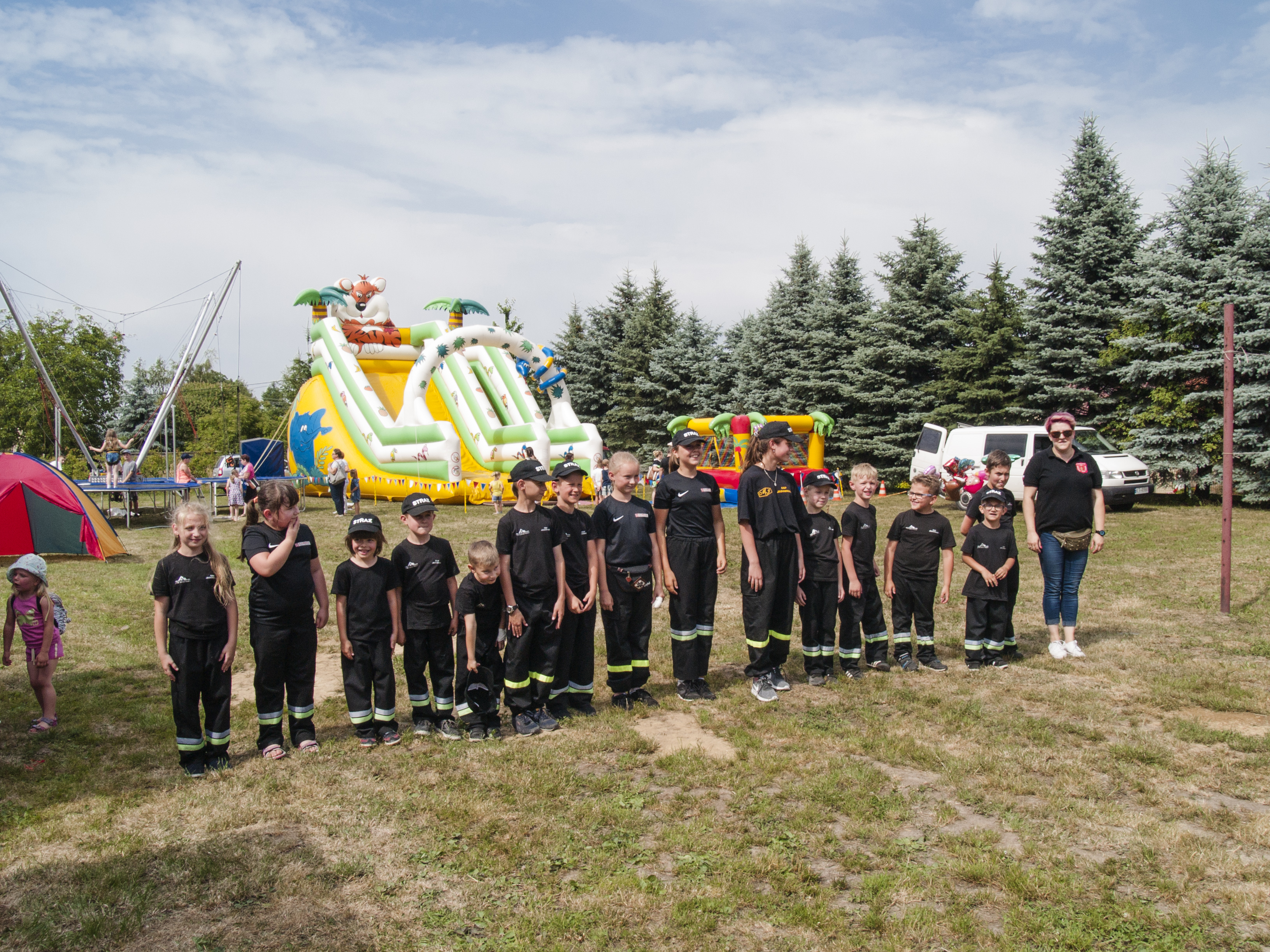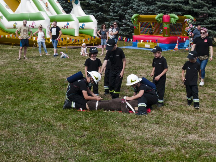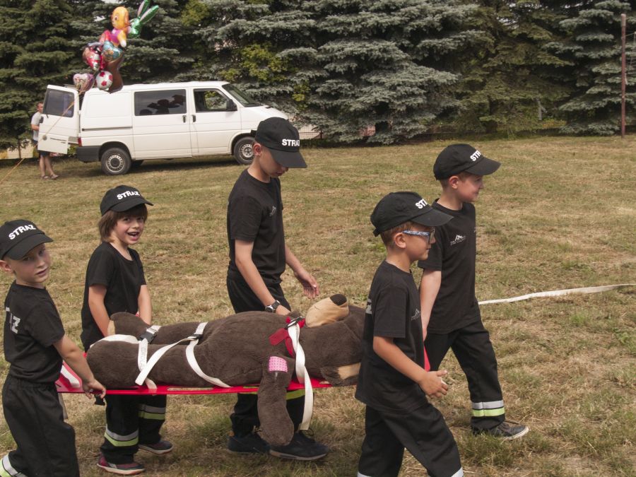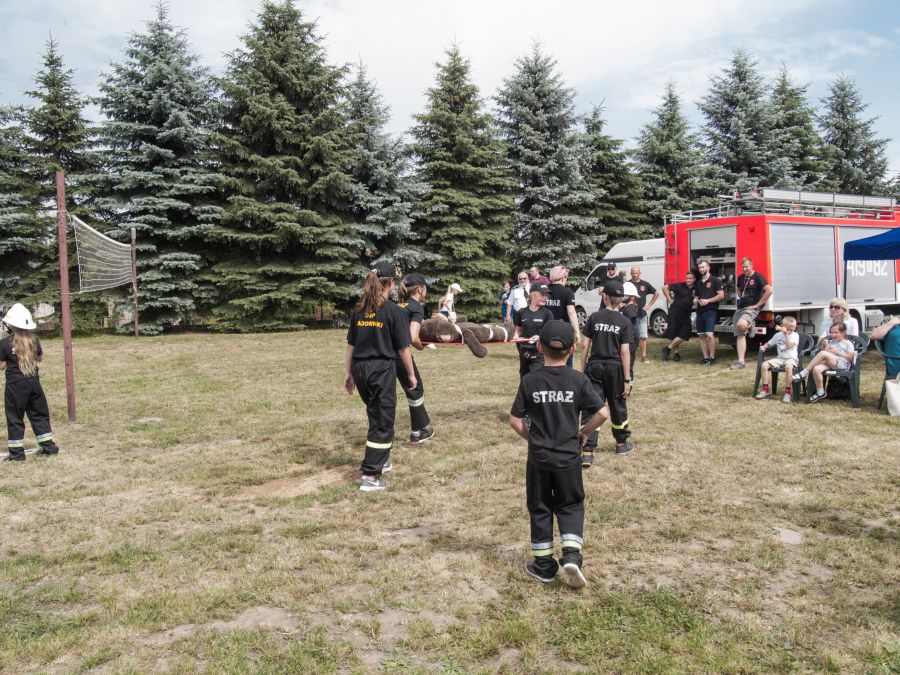 Swoje umiejętności zaprezentowały także dzieci z Dziecięcej Drużyny Pożarniczej, pokazały akcję gaszenia i reanimację poszkodowanego miśka. Na zakończenie, razem z prowadzącymi dzieci zaprezentowały znakomity pokaz musztry.