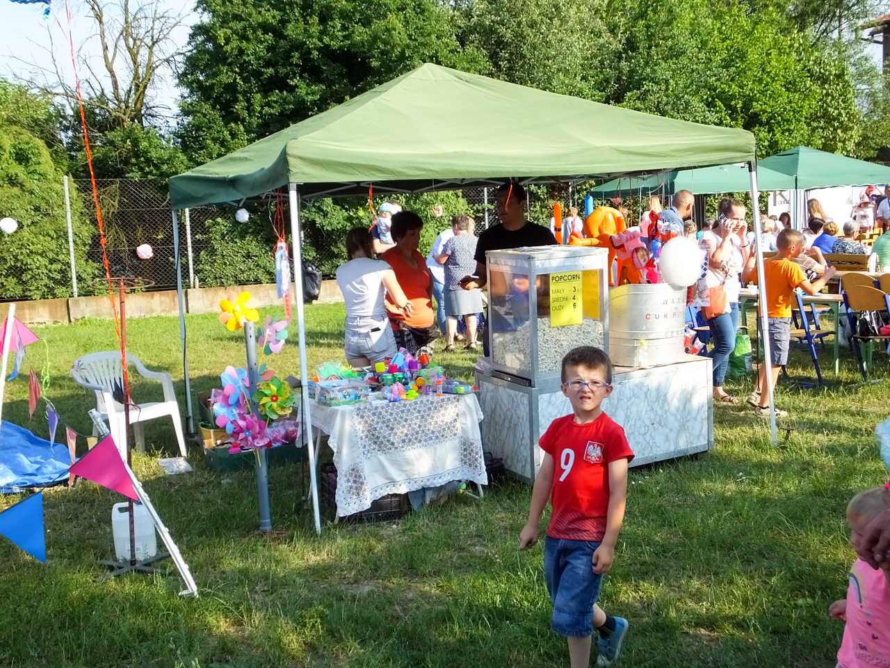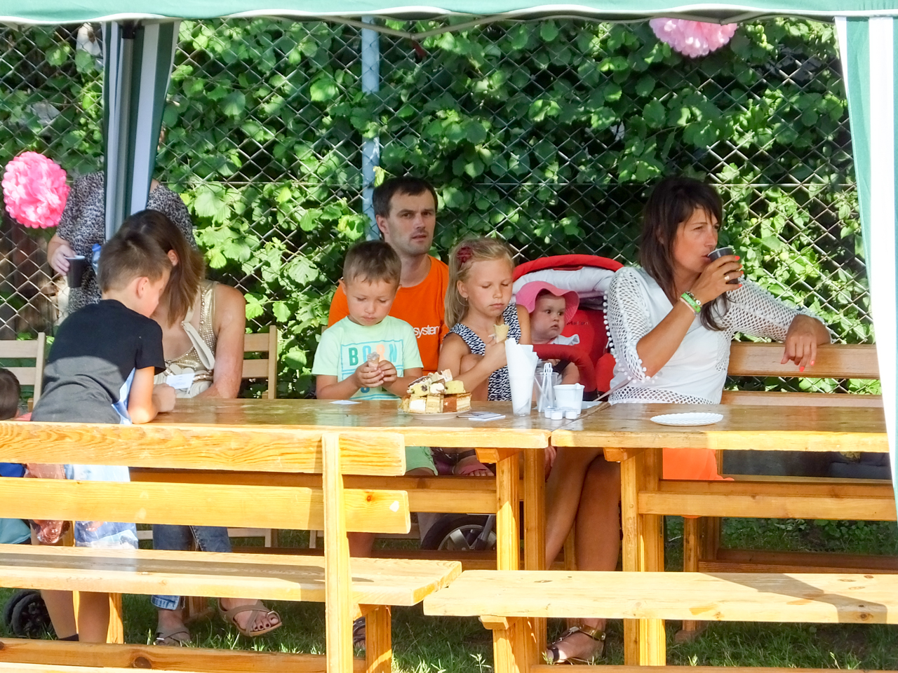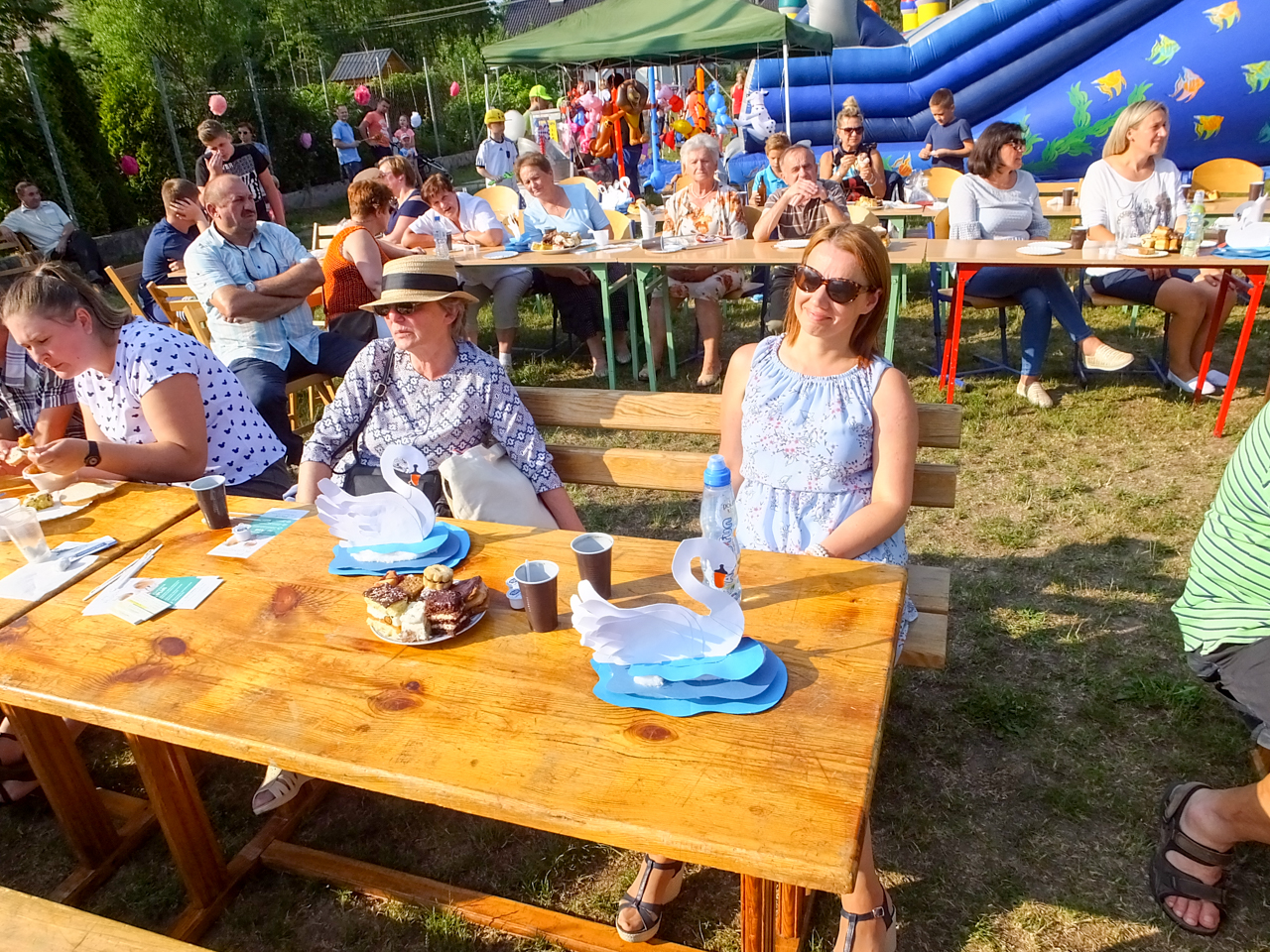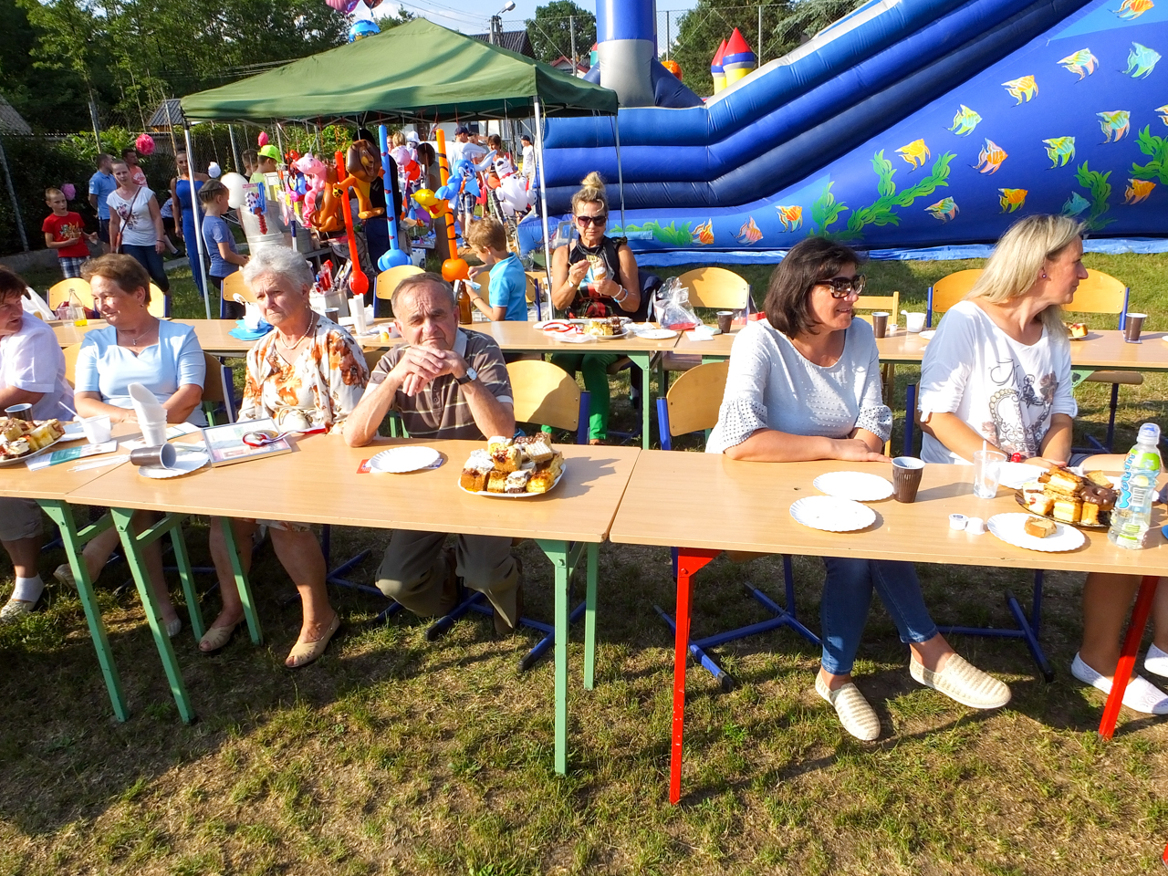 Nawet ci, którzy na nasz piknik zjeżdżali z innych miejscowości, nie mieli problemu z dotarciem na miejsce – szlak wyznaczały dmuchane atrakcje widoczne już z daleka, jak również rozchodzące się zapachy pieczonych kiełbasek z grilla, pysznego bigosu i popcornu. Wsparciem dla podniebienia były również lody, wata cukrowa, kawa i herbata. Bezpłatnie można było posilić się wiejską pajdą chleba ze smalcem i ogórkiem oraz pysznymi domowymi wypiekami.