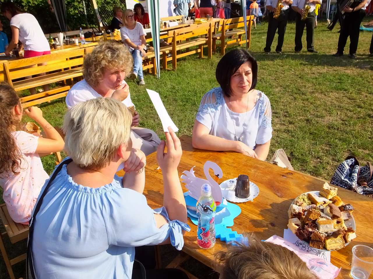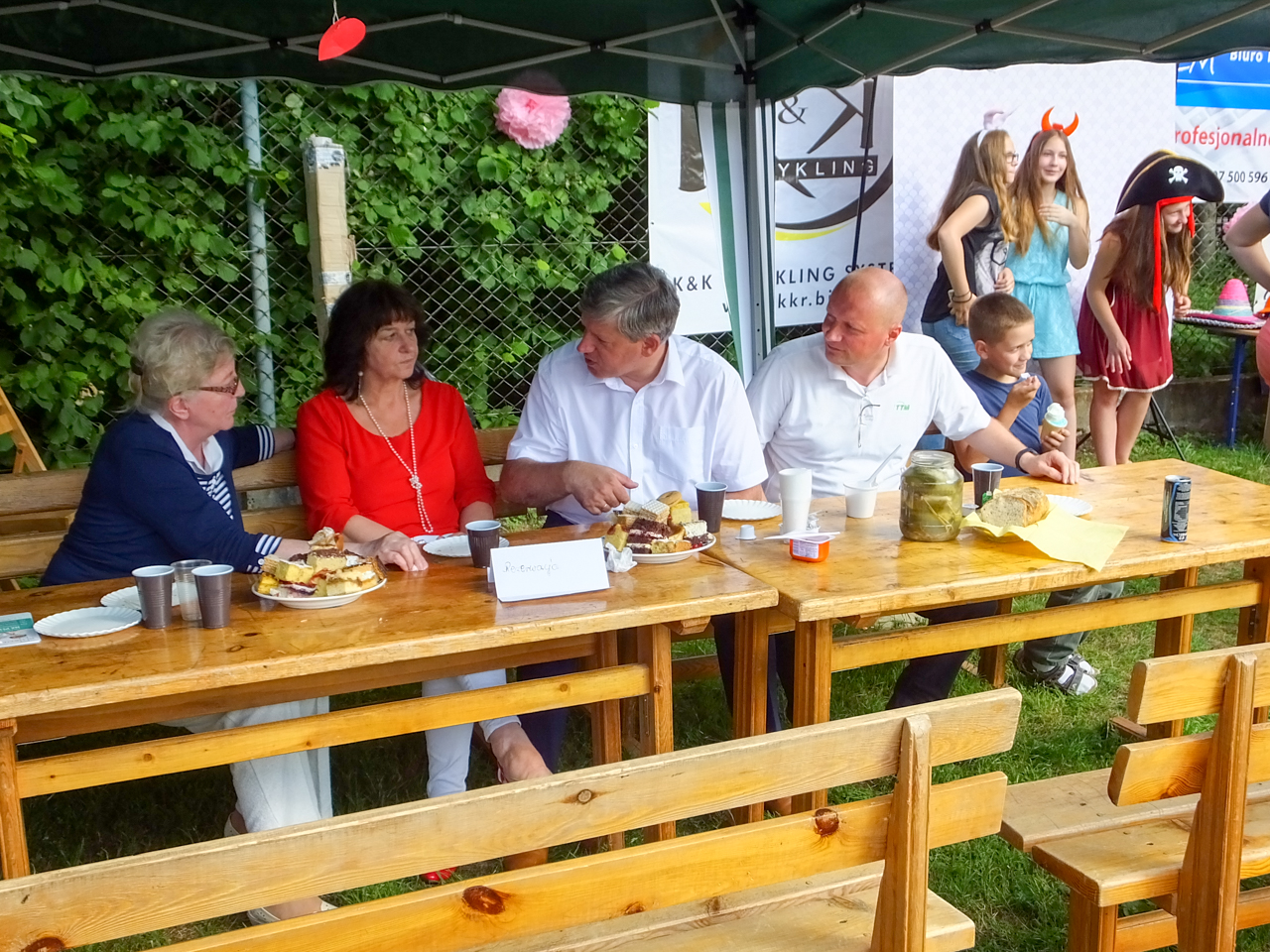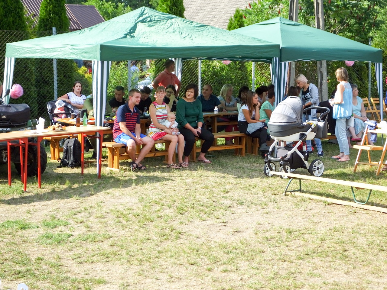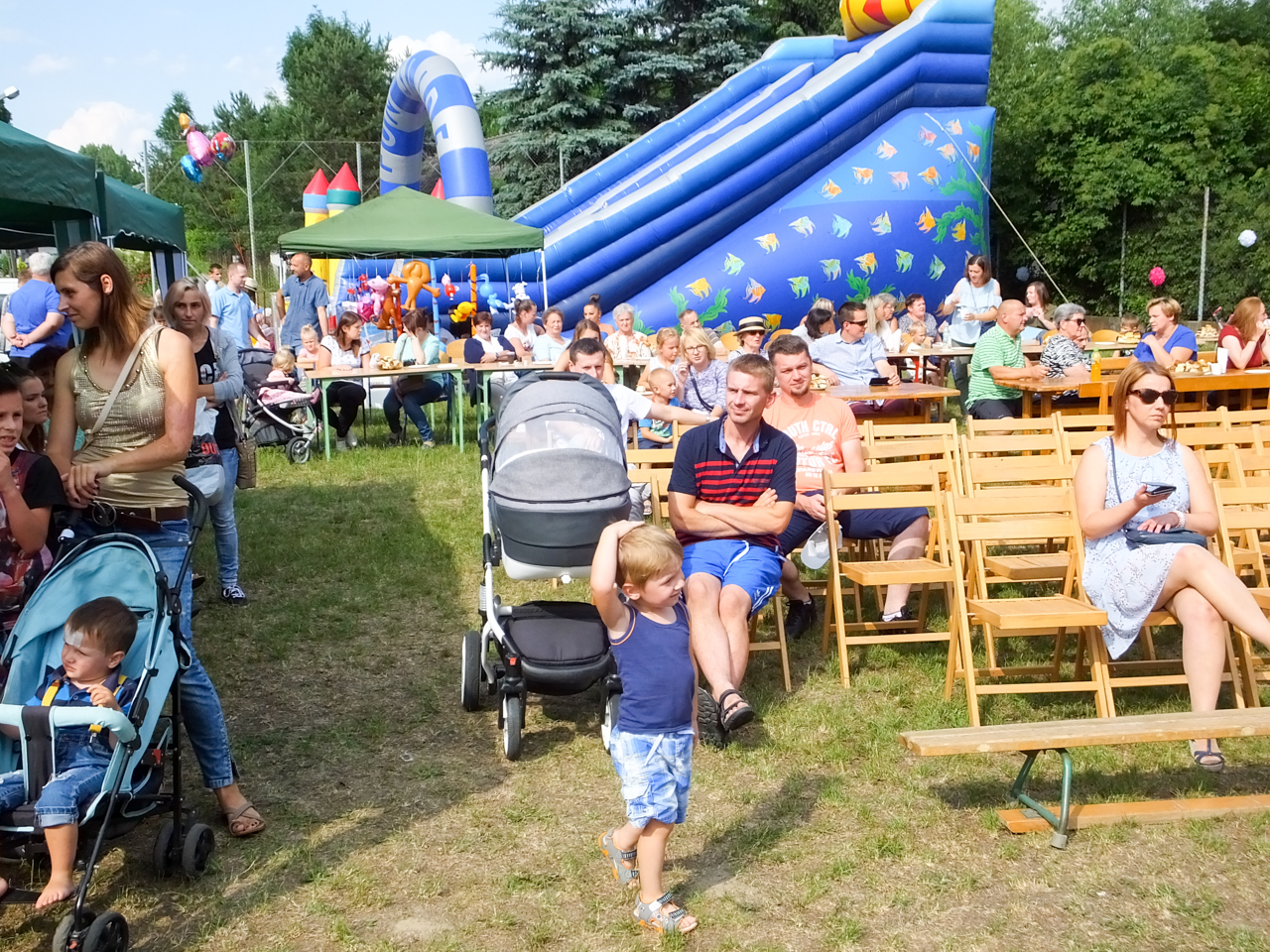 Nawet ci, którzy na nasz piknik zjeżdżali z innych miejscowości, nie mieli problemu z dotarciem na miejsce – szlak wyznaczały dmuchane atrakcje widoczne już z daleka, jak również rozchodzące się zapachy pieczonych kiełbasek z grilla, pysznego bigosu i popcornu. Wsparciem dla podniebienia były również lody, wata cukrowa, kawa i herbata. Bezpłatnie można było posilić się wiejską pajdą chleba ze smalcem i ogórkiem oraz pysznymi domowymi wypiekami.