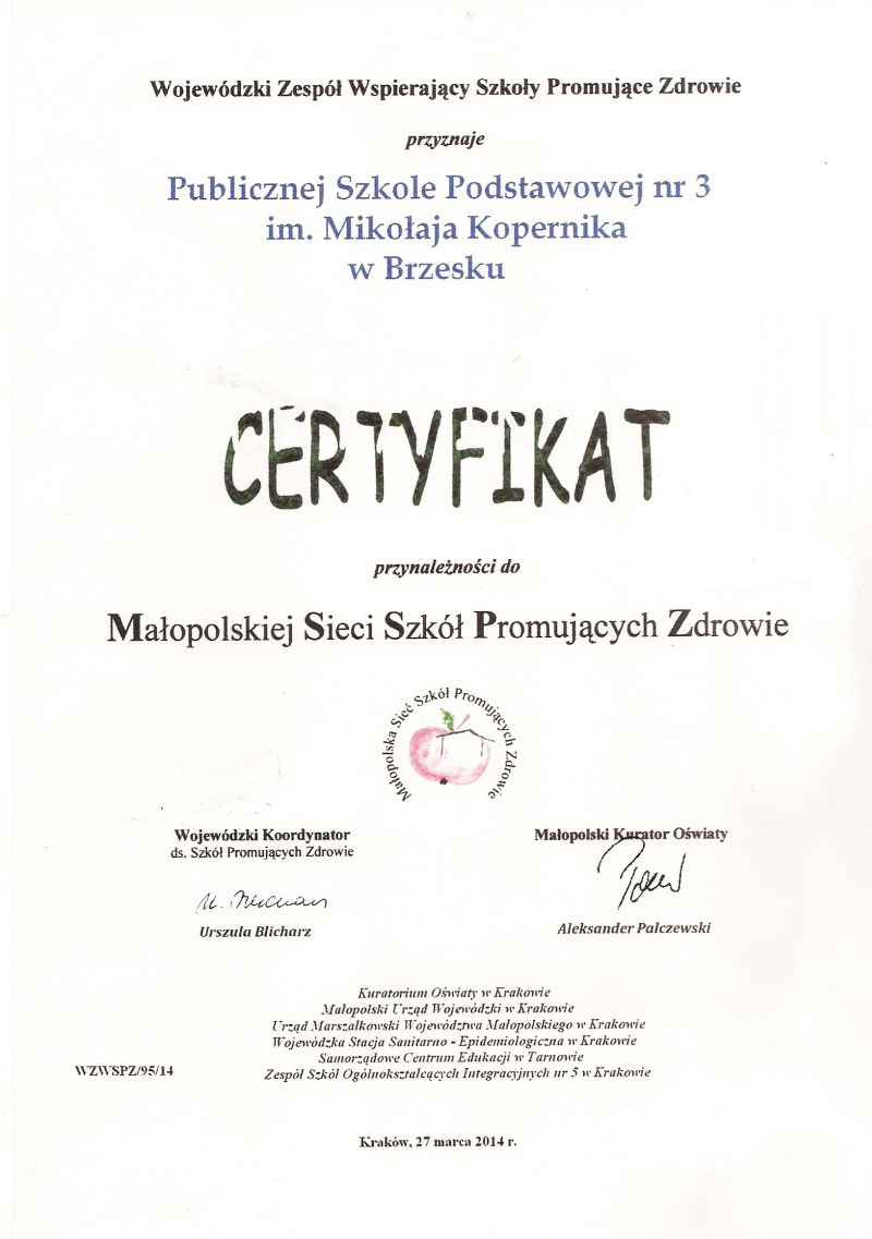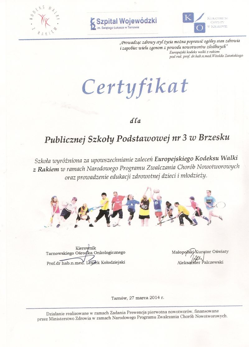 W czwartek 27 marca 2014r. dyrektor Dorota Wójcik wraz z koordynatorem Komisji ds. działań Szkoły Promującej Zdrowie w Publicznej Szkole Podstawowej Nr 3 w Brzesku, Jadwigą Grocholską wzięły udział w wojewódzkiej konferencji Upowszechnianie Zaleceń Europejskiego Kodeksu Walki z Rakiem – prezentacja dobrych praktyk, zorganizowanej przez Kuratorium Oświaty w Krakowie - Delegatura w Tarnowie, Wojewódzki Szpital im. Św. Łukasza w Tarnowie i Tarnowski Ośrodek Onkologiczny. Celem konferencji było upowszechnianie działań, jakie szkoły podejmują na rzecz promocji zdrowego stylu życia oraz wręczenie certyfikatów i podziękowań wyróżnionym placówkom.