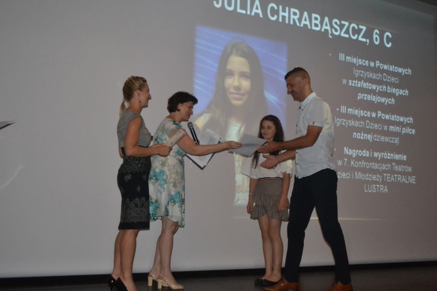 W czasie uroczystości zaprezentowało się także szkolne koło teatralne „Miszmasz”, wystawiając nagrodzoną w przeglądzie teatralnym inscenizację pt. „Kaja i Gerda”. Na zakończenie, dyrektor i przewodnicząca rady rodziców Agnieszka Mastalska-Sowa złożyły gratulacje uczniom, którzy uzyskali na koniec roku szkolnego najwyższe średnie ocen.