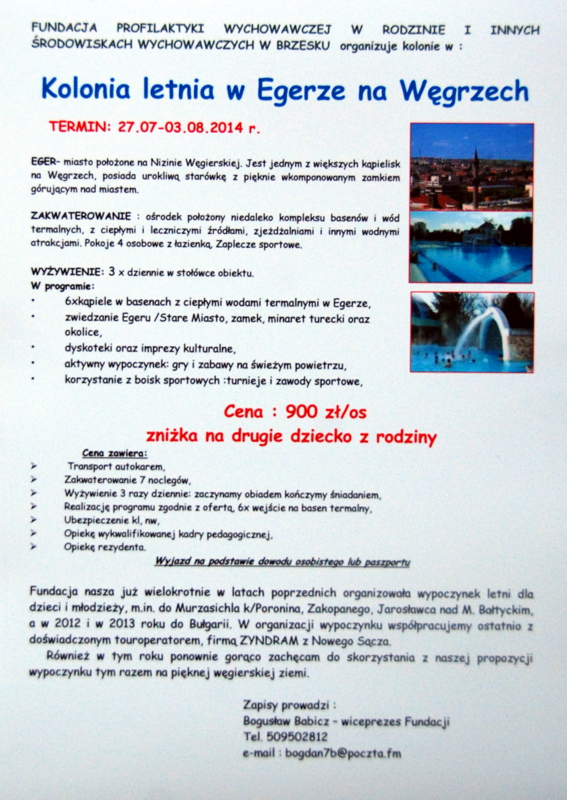 Fundacja Profilaktyki Wychowawczej w Rodzinie i Innych Środowiskach Wychowawczych w Brzesku organizuje kolonie letnią w Egerze, mieście położonym na Nizinie Węgierskiej w terminie 27.07- 03.08.2014 r. Szczegóły w załączniku.