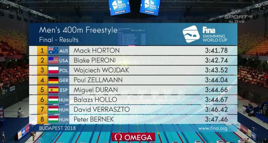 Wojciech Wojdak rywalizował w konkurencji 400 m stylem dowolnym z mistrzem olimpijskim Mackiem Hortonem na czele. Polak niemal przez cały wyścig płynął na trzeciej pozycji i miejsce to utrzymał do samego końca, notując czas 3:43.52. Wygrał utytułowany Australijczyk (3:41.78), a dzięki znakomitemu finiszowi drugą lokatę wywalczył Blake Pieroni.