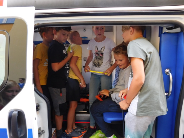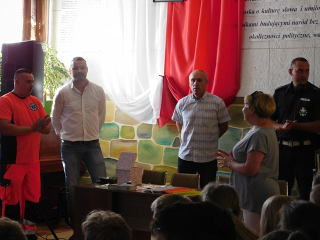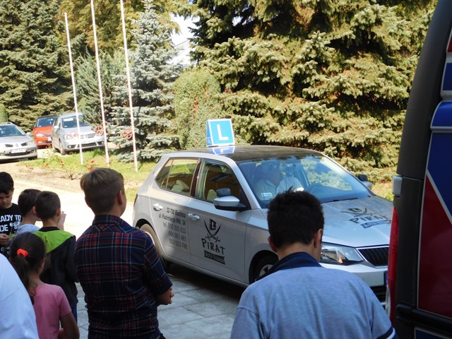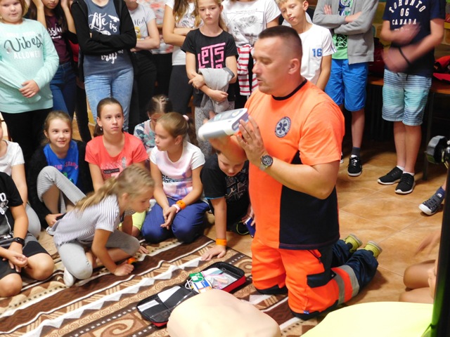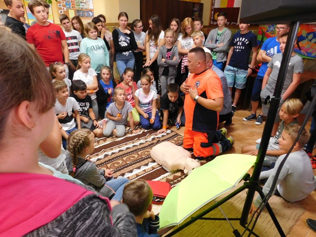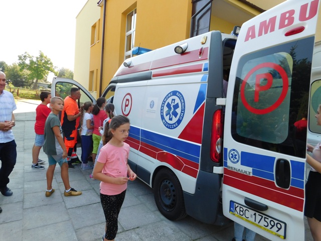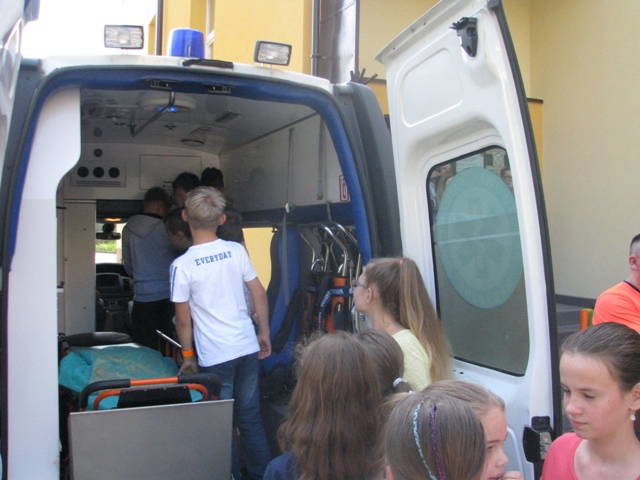 Ratownik medyczny udzielił pokazu pierwszej pomocy. Zaprezentował dzieciom, w jaki sposób wykonać resuscytację krążeniowo-oddechową. Uczył także, jak należy prawidłowo korzystać z defibrylatora (AED), zaś śmiałkowie mogli spróbować swych sił w ratowaniu osoby zadławionej. Ratownik zaprezentował ponadto przygotowanie poszkodowanego do transportu w karetce. Na koniec wszyscy chętni mieli możliwość obejrzenia wnętrza karetki pogotowia. Niektórzy zasiedli nawet za jej kierownicą. Wyjątkowo atrakcyjną niespodziankę przygotował pan Grzegorz Urbaś, który umożliwił wybranym szczęśliwcom ich pierwszą jazdę w roli kierującego samochodem służącym na co dzień do szkolenia kierowców. Jako pierwsza swych sił spróbowała dyrektor szkoły.