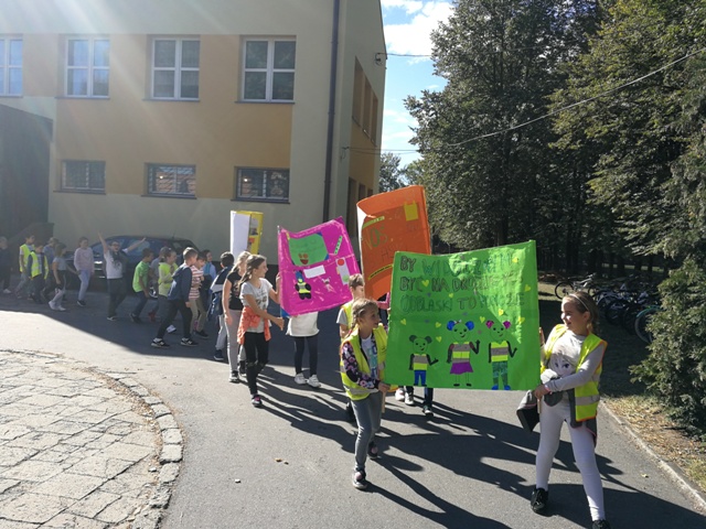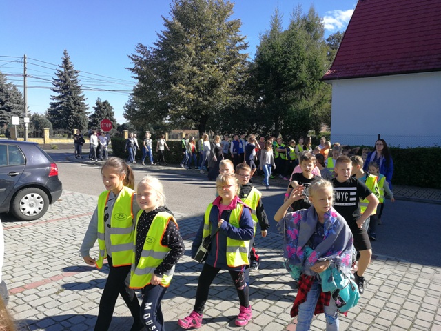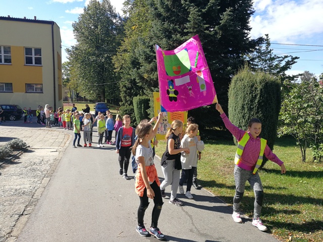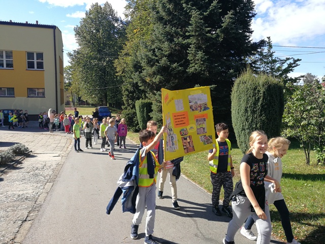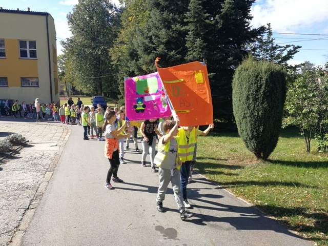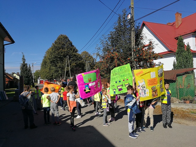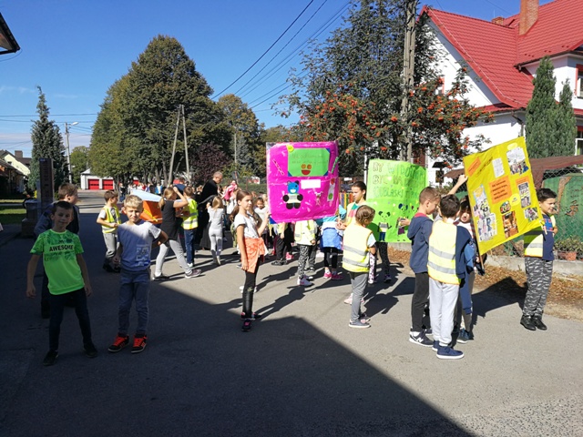 Kolejnym działaniem było zorganizowanie happeningu odblaskowego, podczas którego uczniowie wraz z nauczycielami przemaszerowali ulicami Szczepanowa, niosąc transparenty z hasłami zachęcającymi do używania elementów odblaskowych. Na szczęście w ostatnich latach noszenie odblasków staje się coraz bardziej popularne, jednak wciąż zdarzają się osoby, które poruszają się bez takiej ochrony. Jesienną porą, gdy dni stają się coraz krótsze, często w ubraniach ciemnego koloru piesi poza terenem zabudowanym są praktycznie niewidoczni dla kierowców. To, że pieszy widzi światła samochodu niekoniecznie oznacza, że sam jest widziany. Warto o tym pamiętać.