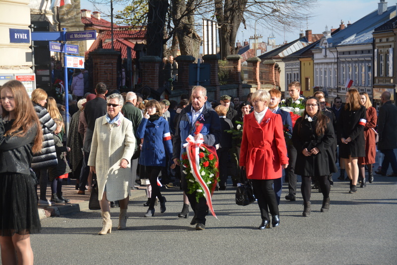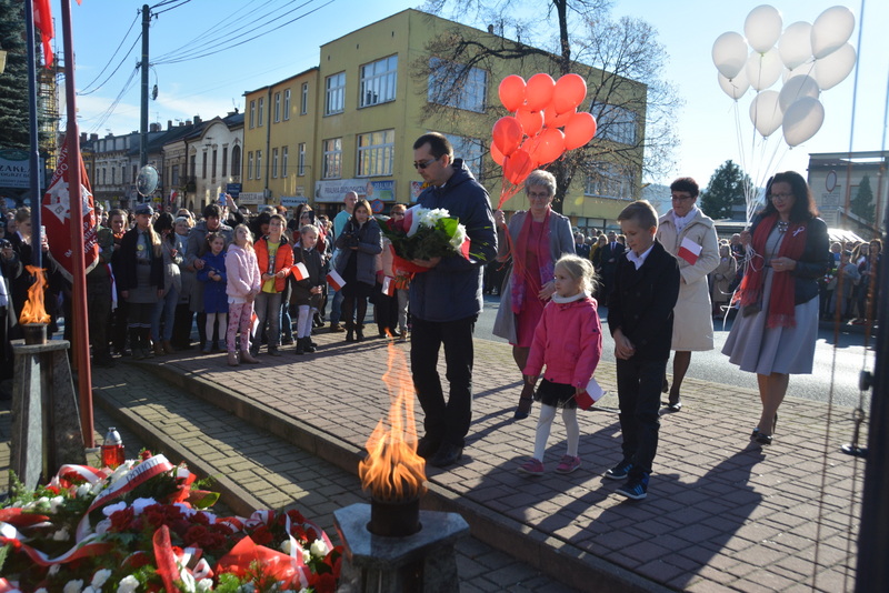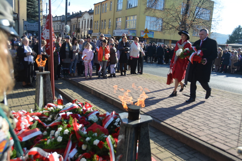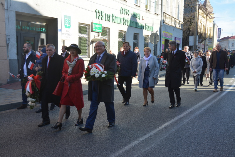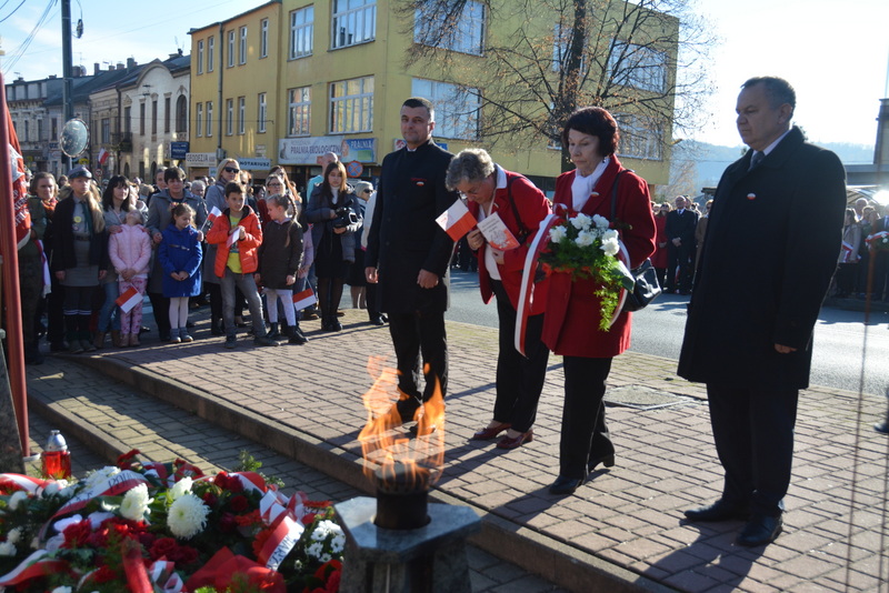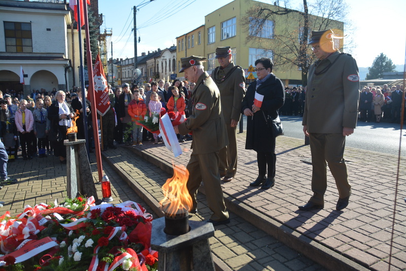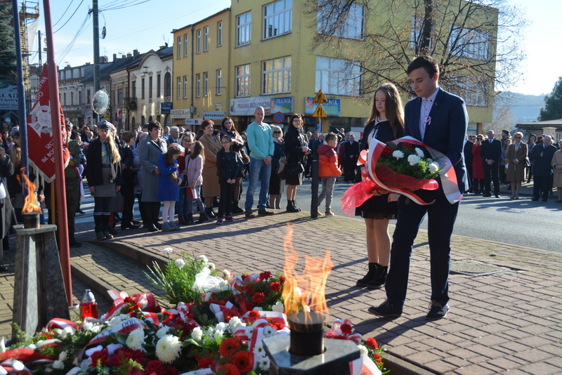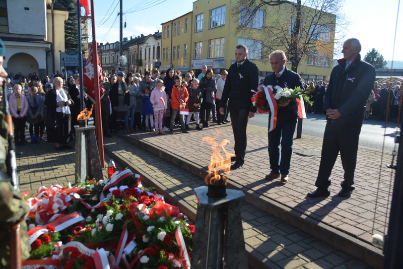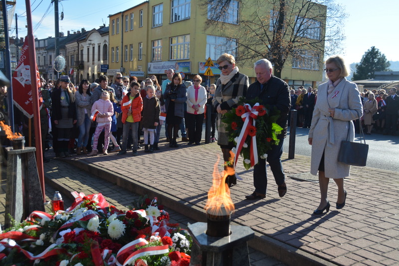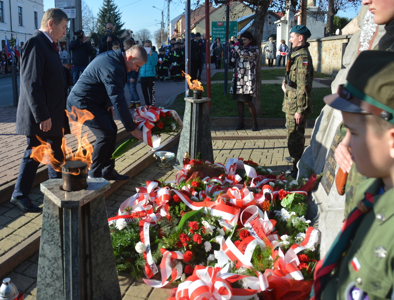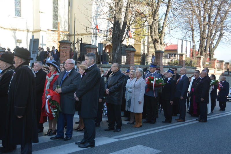 Po mszy jej uczestnicy przeszli pod Pomnik Nieznanego Żołnierza, gdzie składali kwiaty. W imieniu mieszkańców gminy biało-czerwoną wiązankę złożyli burmistrz Grzegorz Wawryka z małżonką, wiceburmistrzem Jerzym Tyrkielem, sekretarzem Stanisławem Sułkiem. Kwiaty złożyli też burmistrz elekt Tomasz Latocha w asyście nowowybranych radnych, przewodniczący Rady Miejskiej, Krzysztof Ojczyk z radnymi, posłanka Józefa Szczurek-Żelazko, europoseł Edward Czesak, radni miejscy i powiatowi, delegacje policji, straży pożarnej, przedstawiciele Światowego Związku Żołnierzy Armii Krajowej, księża dekanatu brzeskiego, Jednostka Strzelecka 5029, przedstawiciele Ligi Obrony Kraju, delegacje OSP, Dziecięce Drużyny Pożarnicze z Jadownik i Poręby Spytkowskiej, Związku Harcerstwa Polskiego, Towarzystwa Gimnastycznego „Sokół”. Kwiaty pod pomnikiem złożyły także delegacie partii politycznych, związków zawodowych, zakładów pracy, organizacji pozarządowych, spółek miejskich oraz szkół.