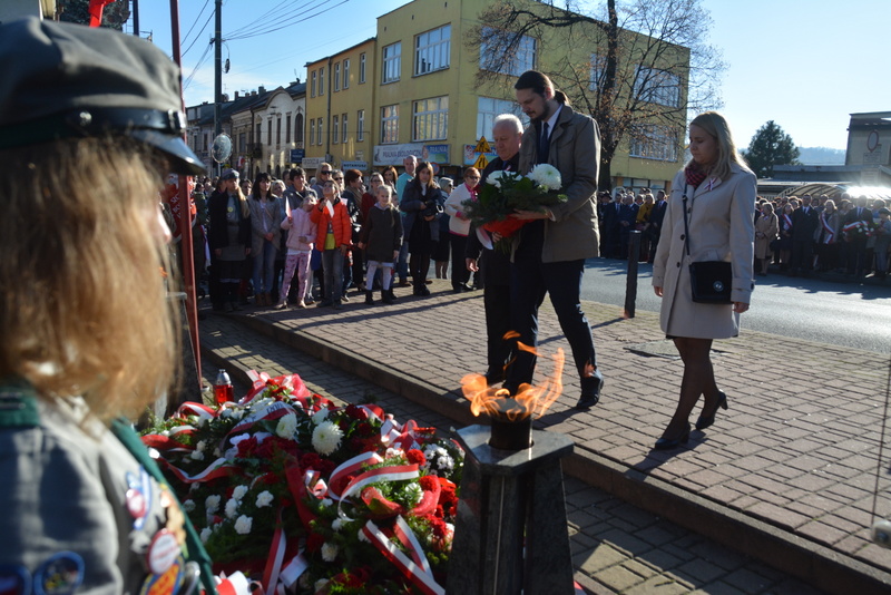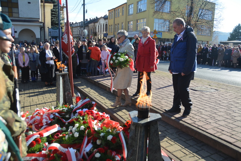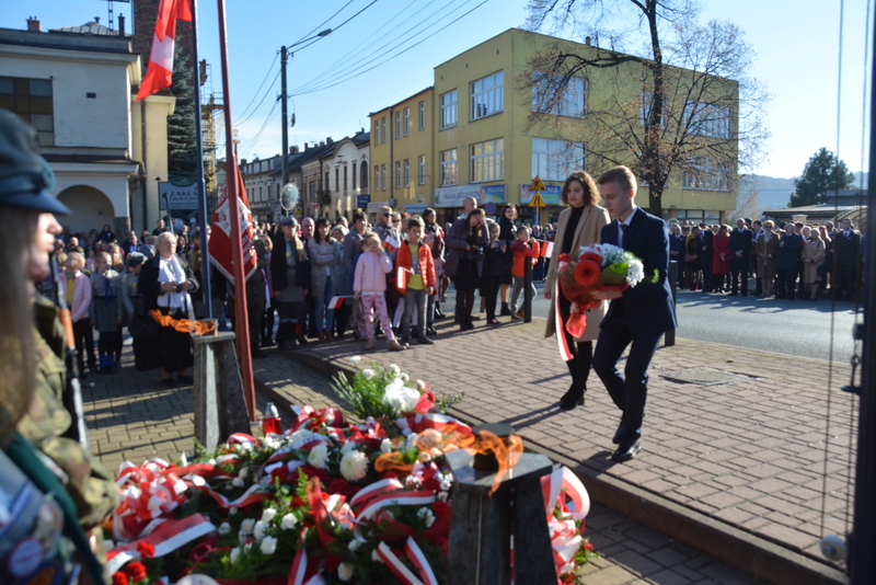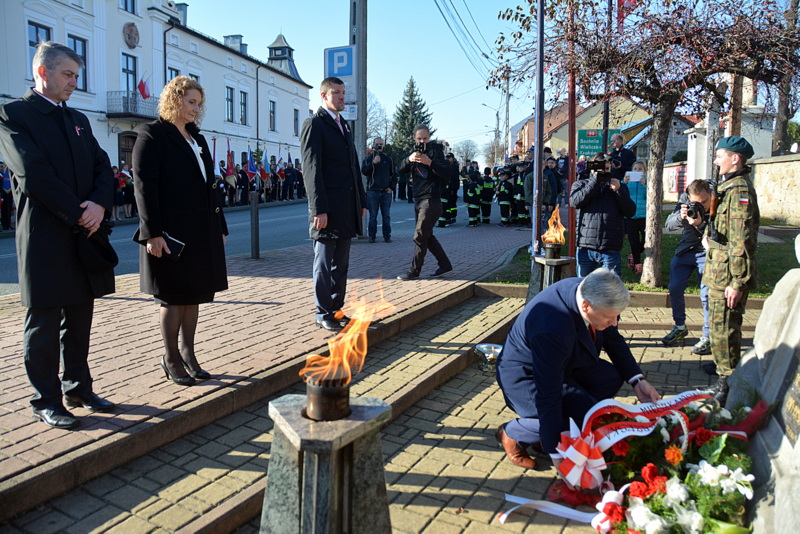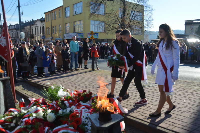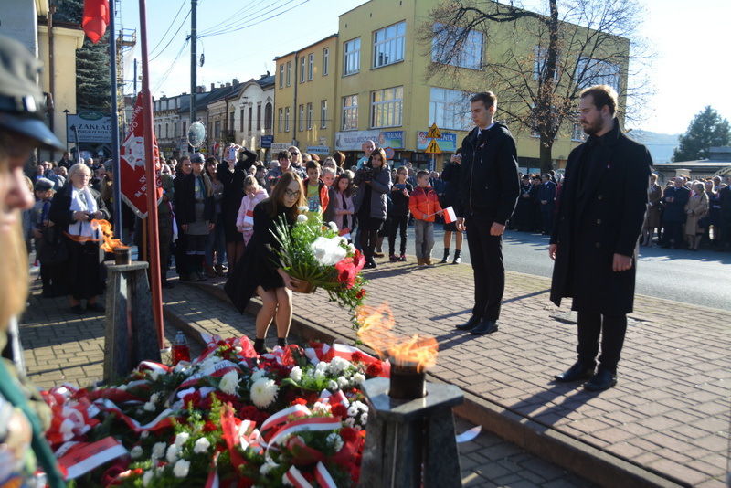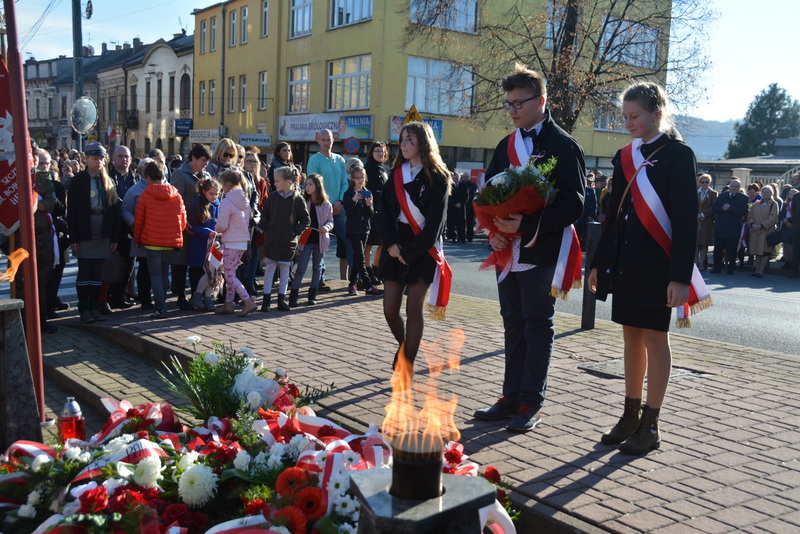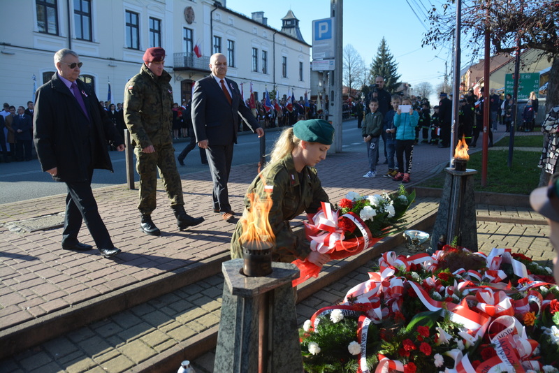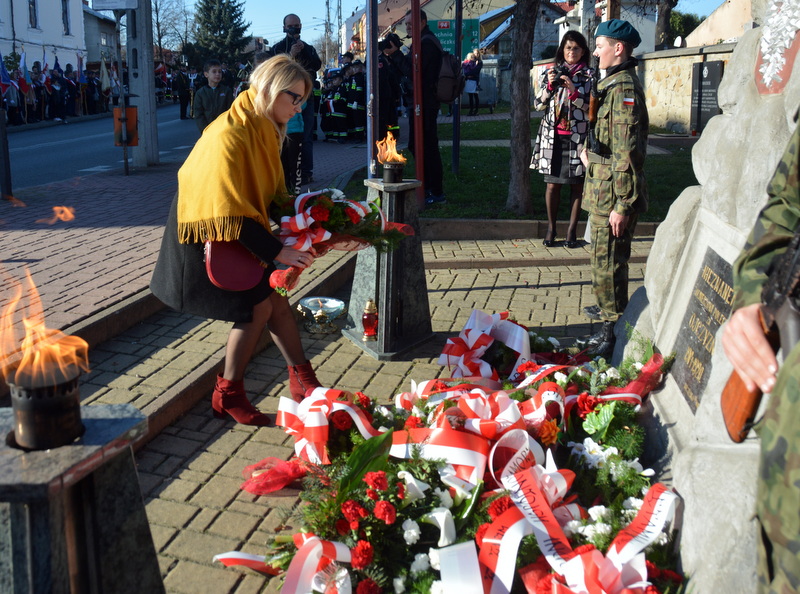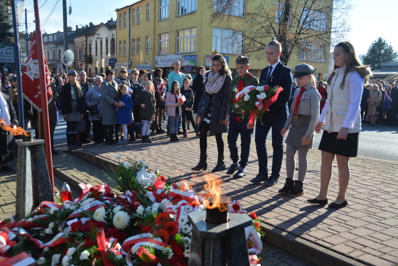 Po mszy jej uczestnicy przeszli pod Pomnik Nieznanego Żołnierza, gdzie składali kwiaty. W imieniu mieszkańców gminy biało-czerwoną wiązankę złożyli burmistrz Grzegorz Wawryka z małżonką, wiceburmistrzem Jerzym Tyrkielem, sekretarzem Stanisławem Sułkiem. Kwiaty złożyli też burmistrz elekt Tomasz Latocha w asyście nowowybranych radnych, przewodniczący Rady Miejskiej, Krzysztof Ojczyk z radnymi, posłanka Józefa Szczurek-Żelazko, europoseł Edward Czesak, radni miejscy i powiatowi, delegacje policji, straży pożarnej, przedstawiciele Światowego Związku Żołnierzy Armii Krajowej, księża dekanatu brzeskiego, Jednostka Strzelecka 5029, przedstawiciele Ligi Obrony Kraju, delegacje OSP, Dziecięce Drużyny Pożarnicze z Jadownik i Poręby Spytkowskiej, Związku Harcerstwa Polskiego, Towarzystwa Gimnastycznego „Sokół”. Kwiaty pod pomnikiem złożyły także delegacie partii politycznych, związków zawodowych, zakładów pracy, organizacji pozarządowych, spółek miejskich oraz szkół.