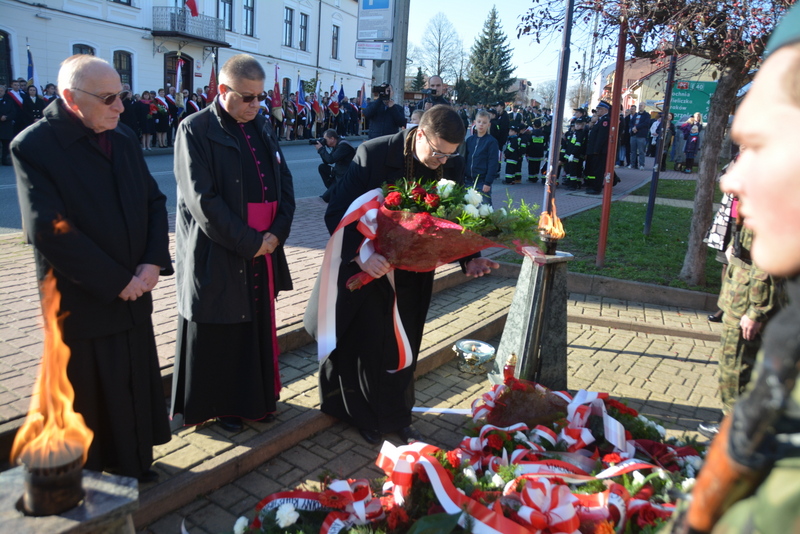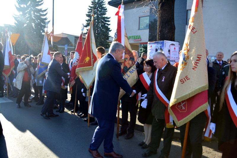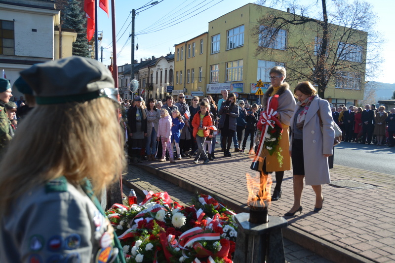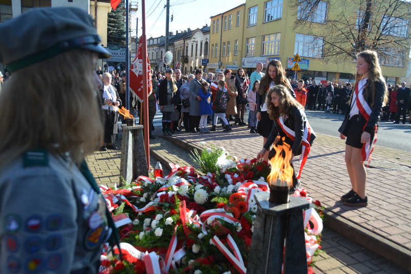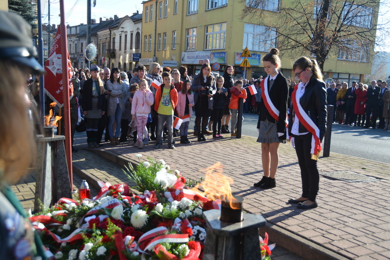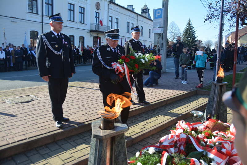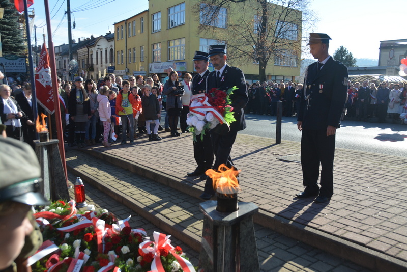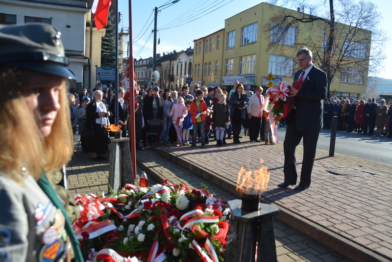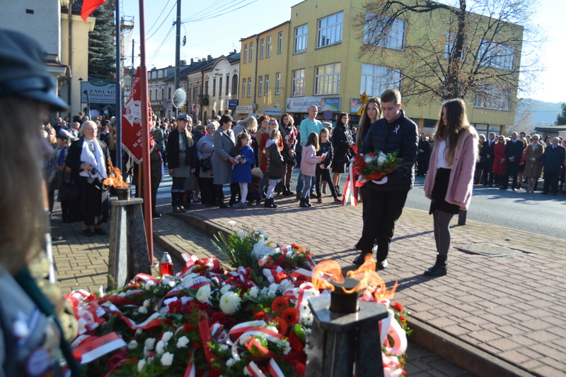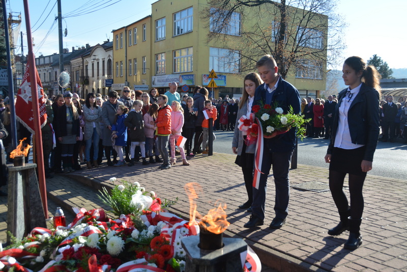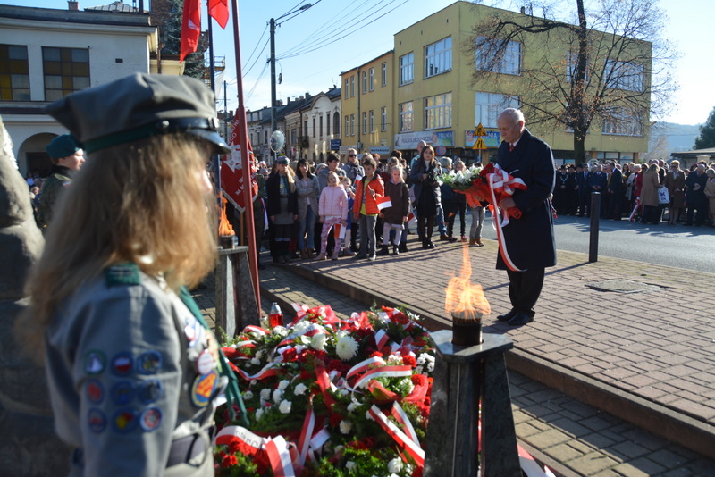 Po mszy jej uczestnicy przeszli pod Pomnik Nieznanego Żołnierza, gdzie składali kwiaty. W imieniu mieszkańców gminy biało-czerwoną wiązankę złożyli burmistrz Grzegorz Wawryka z małżonką, wiceburmistrzem Jerzym Tyrkielem, sekretarzem Stanisławem Sułkiem. Kwiaty złożyli też burmistrz elekt Tomasz Latocha w asyście nowowybranych radnych, przewodniczący Rady Miejskiej, Krzysztof Ojczyk z radnymi, posłanka Józefa Szczurek-Żelazko, europoseł Edward Czesak, radni miejscy i powiatowi, delegacje policji, straży pożarnej, przedstawiciele Światowego Związku Żołnierzy Armii Krajowej, księża dekanatu brzeskiego, Jednostka Strzelecka 5029, przedstawiciele Ligi Obrony Kraju, delegacje OSP, Dziecięce Drużyny Pożarnicze z Jadownik i Poręby Spytkowskiej, Związku Harcerstwa Polskiego, Towarzystwa Gimnastycznego „Sokół”. Kwiaty pod pomnikiem złożyły także delegacie partii politycznych, związków zawodowych, zakładów pracy, organizacji pozarządowych, spółek miejskich oraz szkół.