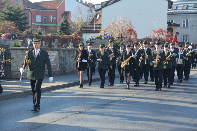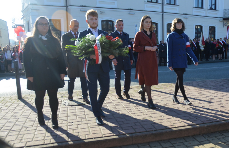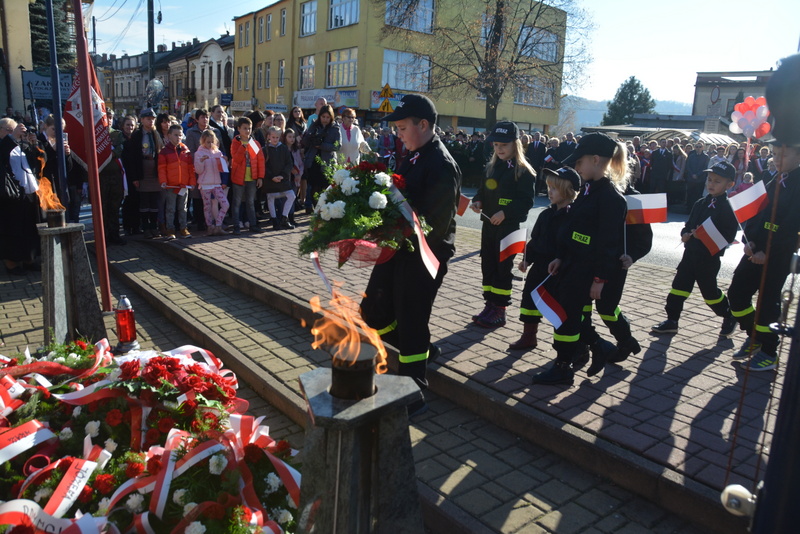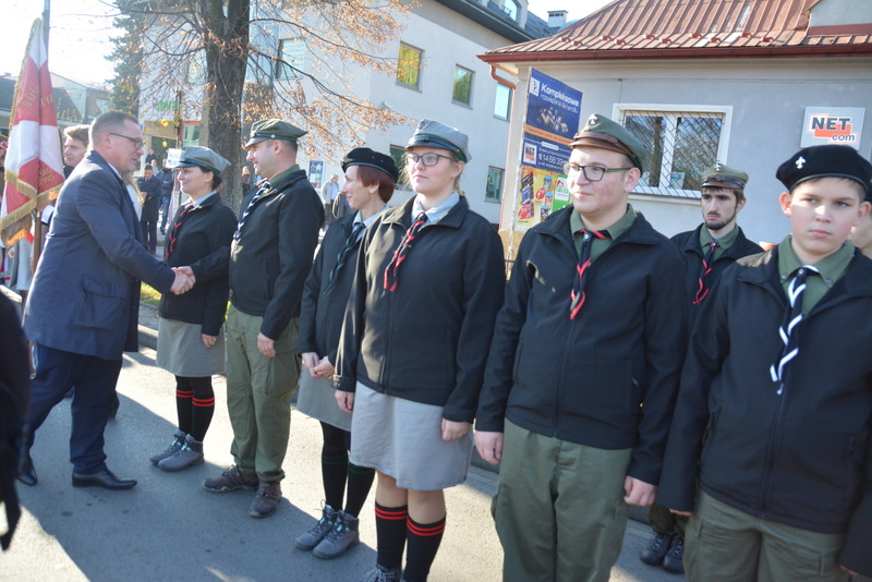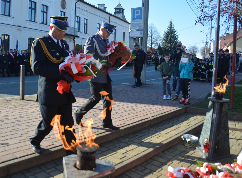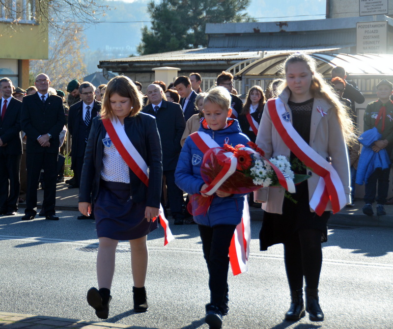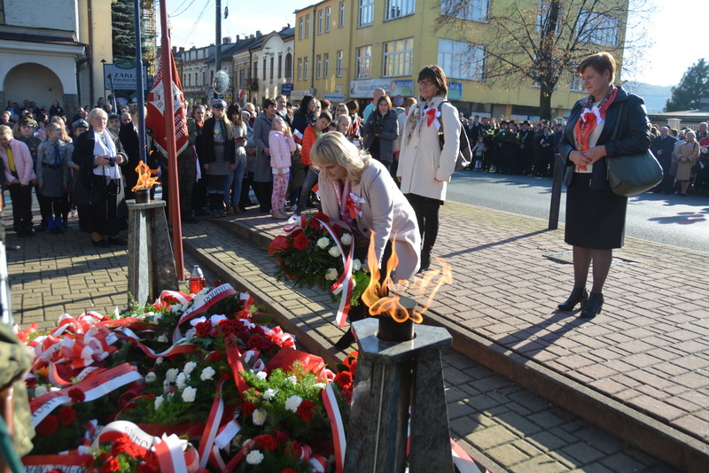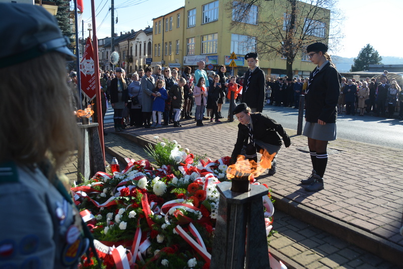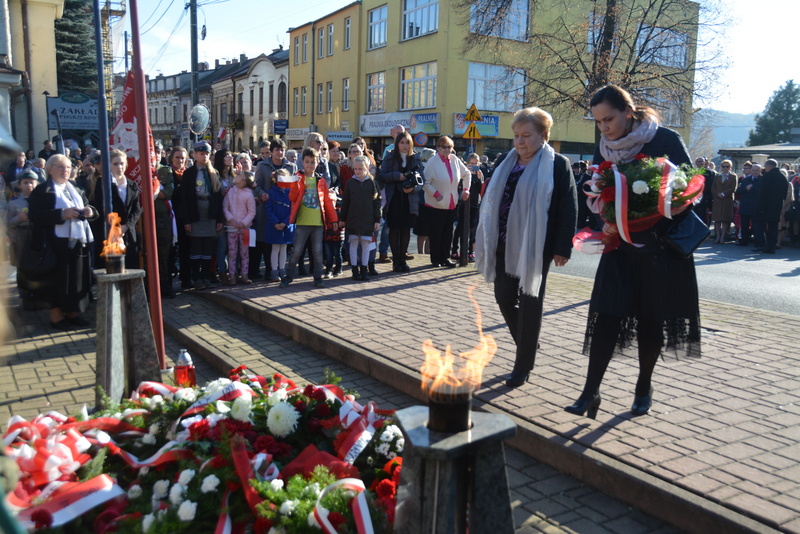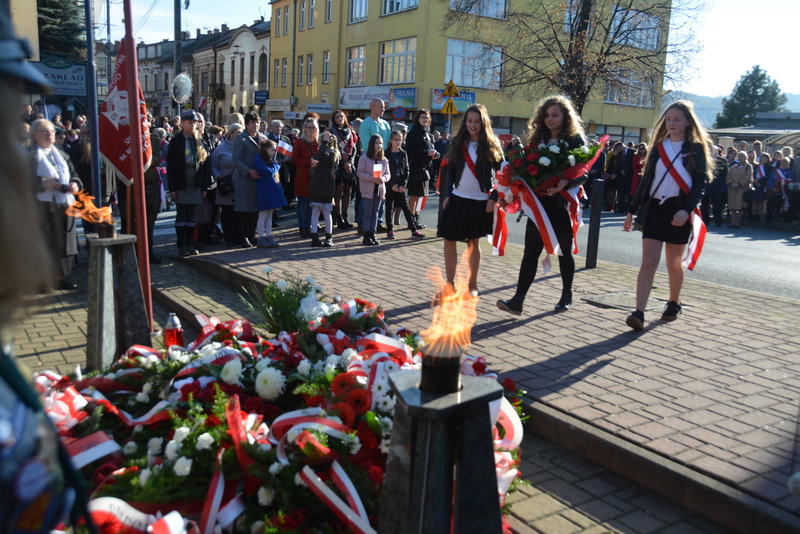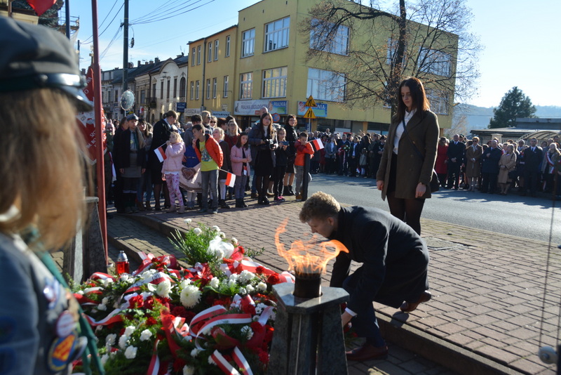 Po mszy jej uczestnicy przeszli pod Pomnik Nieznanego Żołnierza, gdzie składali kwiaty. W imieniu mieszkańców gminy biało-czerwoną wiązankę złożyli burmistrz Grzegorz Wawryka z małżonką, wiceburmistrzem Jerzym Tyrkielem, sekretarzem Stanisławem Sułkiem. Kwiaty złożyli też burmistrz elekt Tomasz Latocha w asyście nowowybranych radnych, przewodniczący Rady Miejskiej, Krzysztof Ojczyk z radnymi, posłanka Józefa Szczurek-Żelazko, europoseł Edward Czesak, radni miejscy i powiatowi, delegacje policji, straży pożarnej, przedstawiciele Światowego Związku Żołnierzy Armii Krajowej, księża dekanatu brzeskiego, Jednostka Strzelecka 5029, przedstawiciele Ligi Obrony Kraju, delegacje OSP, Dziecięce Drużyny Pożarnicze z Jadownik i Poręby Spytkowskiej, Związku Harcerstwa Polskiego, Towarzystwa Gimnastycznego „Sokół”. Kwiaty pod pomnikiem złożyły także delegacie partii politycznych, związków zawodowych, zakładów pracy, organizacji pozarządowych, spółek miejskich oraz szkół.