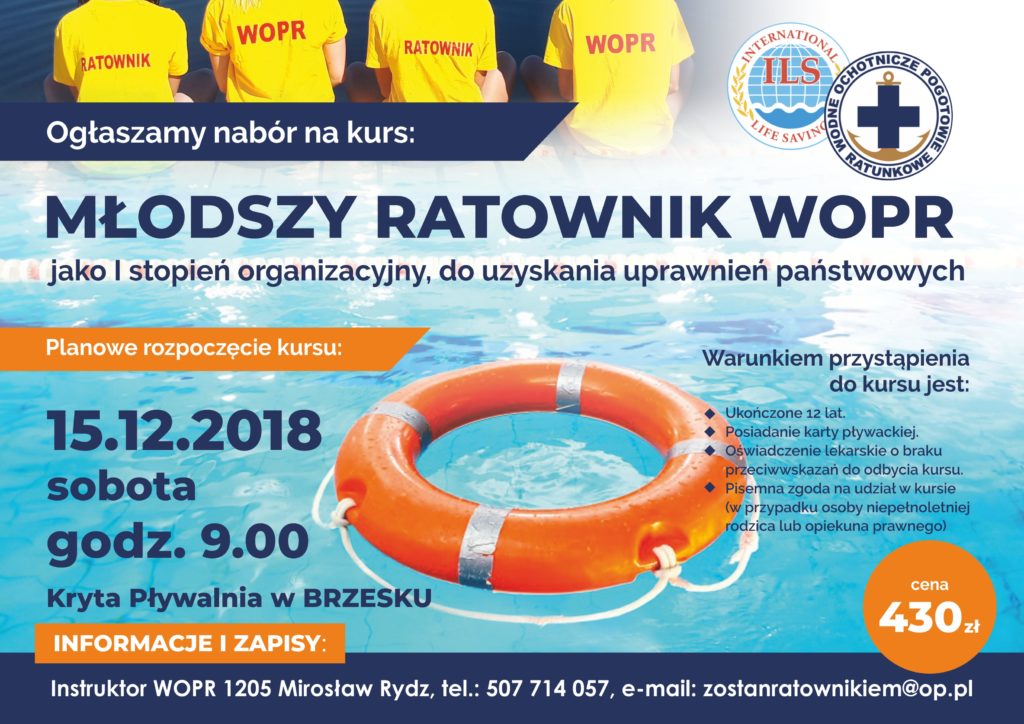 Brzeski Ośrodek Sportu i Rekreacji zaprasza na kurs młodszego ratownika WOPR. Oferta programowa kursu przeznaczona jest dla młodzieży szkolnej w wieku od 12 lat i osób dorosłych. Szkolenie jest pierwszym elementem edukacji z zakresu technik ratownictwa wodnego i ma na celu zachęcić i przygotować do uczestnictwa w szkoleniu ratownika wodnego, zgodnie z rozporządzeniem ministra spraw wewnętrznych z dnia 21 czerwca 2012 r. w sprawie szkoleń w ratownictwie wodnym. Przedmioty i tematy zajęć dydaktycznych przewidzianych dla kursusą zgodnie z uchwałami Wodnego Ochotniczego Pogotowia Ratunkowego i wytycznymi International Life Saving Federation- organizacji wyznaczającej standardy wyszkolenia ratownika wodnego.Planowane rozpoczęcie kursu – 15 grudnia, o godzinie 9.00, w krytej pływalni. Chętni mogą się zapisywać do 13 grudnia pisząc na adres email: zostanratownikiem@op.pl