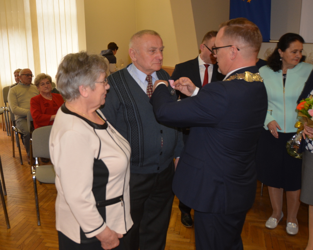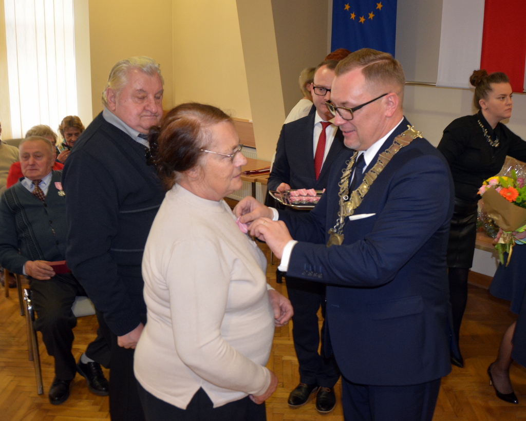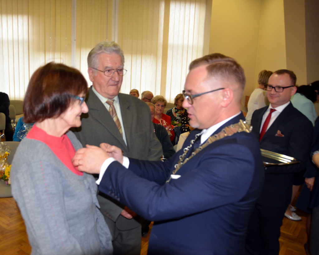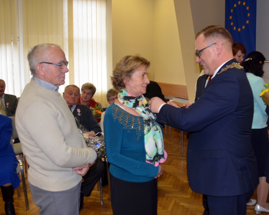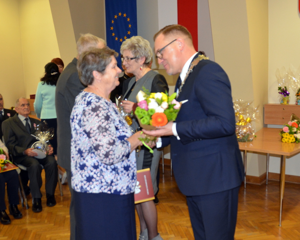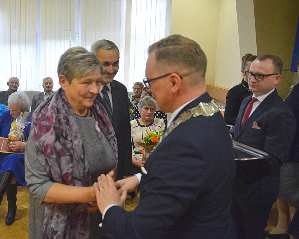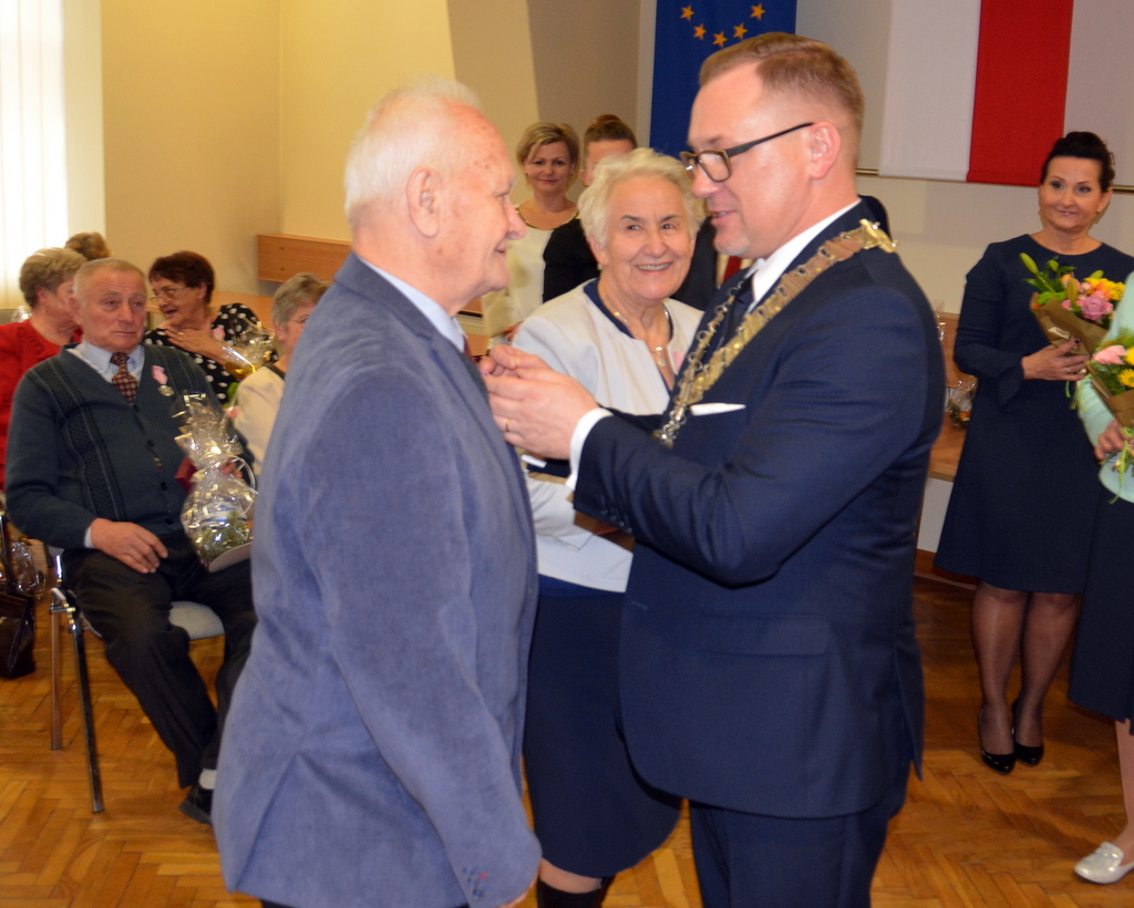 -Niełatwo jest wyrazić słowami nasz podziw i szacunek dla wspólnej, 50-letniej drogi dwojga ludzi, którzy mimo trudności i różnicy charakterów idą razem przez życie, dając świadectwo, że miłość przezwycięża wszystkie przeszkody i trudności. Przyznany przez Prezydenta Rzeczypospolitej Polskiej medal ma szczególne znaczenie, otrzymuje go dwoje ludzi, których wspólne rodzinne życie jest powodem do dumy i radości dla najbliższych, a także wzorem i przykładem wierności – mówił w czasie uroczystości burmistrz Tomasz Latocha. Jubilatom złożył życzenia zdrowia, pogody ducha oraz kolejnych lat przeżytych w spokoju i radości. Skromną uroczystość uświetnił występ uczniów ze szkoły muzycznej.