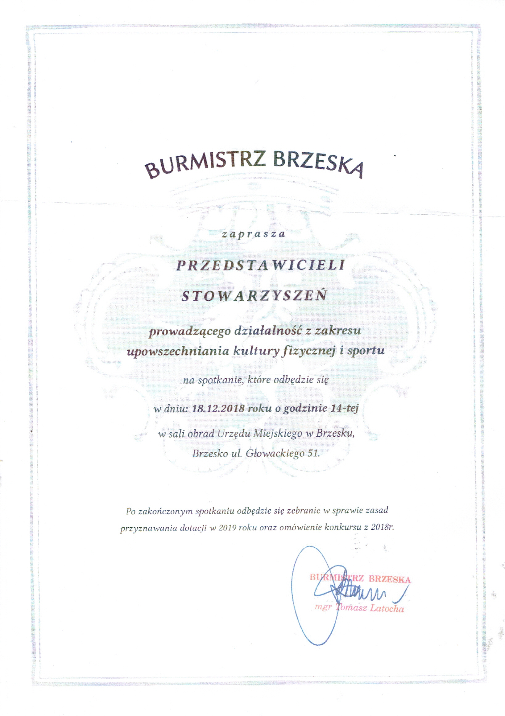 18 grudnia o godz. 14-tej w sali obrad Urzędu Miejskiego w Brzesku odbędzie się spotkanie przedstawicieli stowarzyszeń prowadzących działalność z zakresu upowszechniania kultury fizycznej i sportu, na które zaprasza burmistrz Brzeska, Tomasz Latocha. Po spotkaniu odbędzie się zebranie w sprawie zasad przyznawania dotacji w 2019 roku oraz omówienie konkursu z 2018 roku.