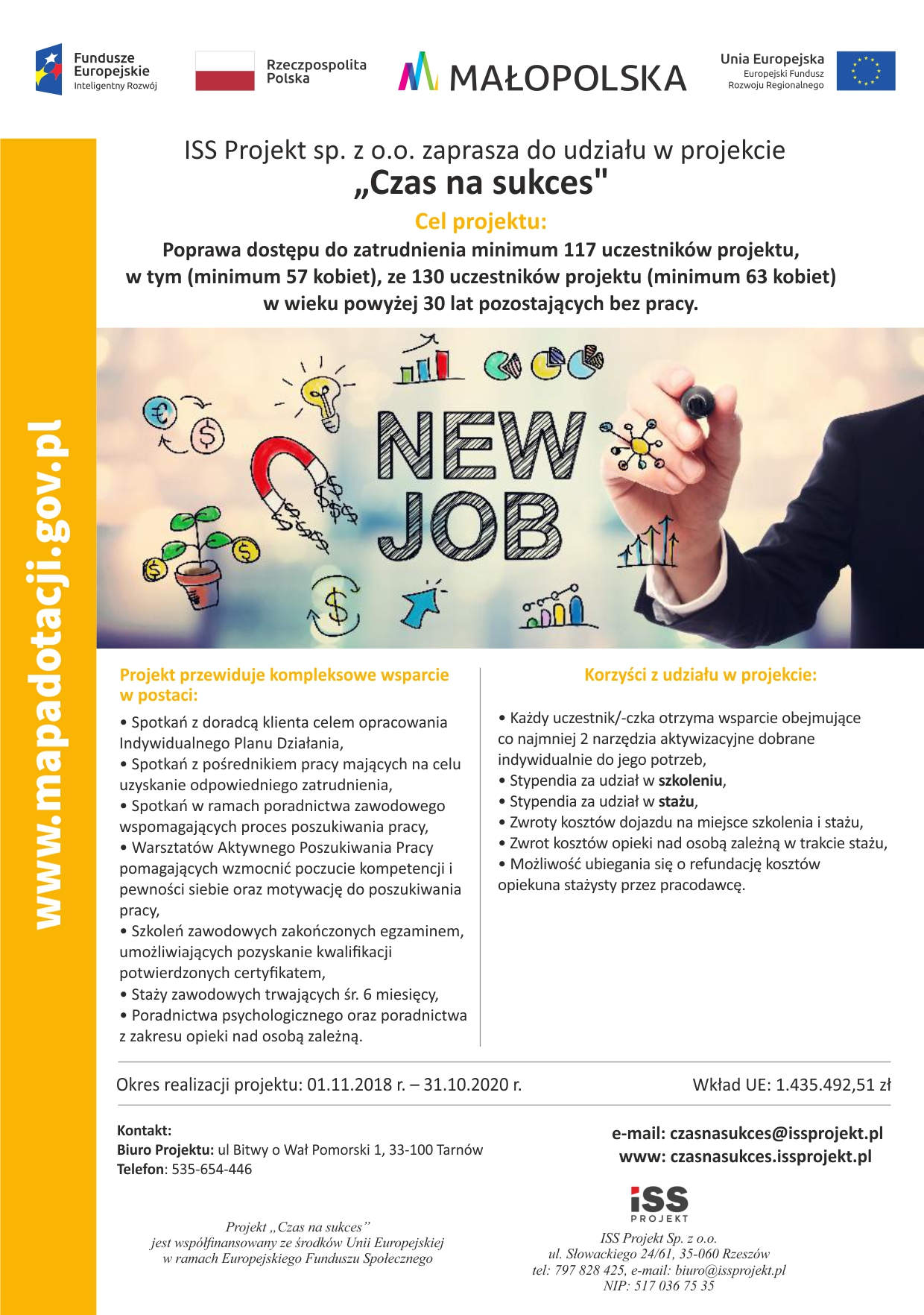 Trwa I tura rekrutacji do projektu „Czas na sukces”, która zakończy się 21 grudnia 2018 roku. Jest on skierowany do osób w wieku 30 lat i więcej pozostających bez pracy, w tym długotrwale bezrobotne, zamieszkujące w rozumieniu przepisów Kodeksu Cywilnego na obszarze województwa małopolskiego - miasto Tarnów, powiaty: tarnowski, brzeski, dąbrowski. Do udziału zapraszamy także osoby z niepełnosprawnością, osoby o niskich kwalifikacjach, które w ramach kursów zawodowych oraz przygotowania zawodowego, mogą podnieść swoje kwalifikacje.