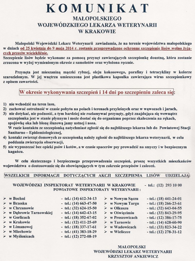 Powiatowy Lekarz Weterynarii w Brzesku informuje, że w dniach od 25 kwietnia do 9 maja na terenie całego województwa małopolskiego zostanie przeprowadzona akcja ochronnego szczepienia lisów wolno żyjących przeciwko wściekliźnie. Szczegółowe informacje podane są w załączonym komunikacie Małopolskiego Wojewódzkiego Lekarza Weterynarii w Krakowie, wraz ze wskazówkami dla mieszkańców terenów na których zostaną wyłożone immunoprzynęty, do zwalczania wścieklizny u lisów.
