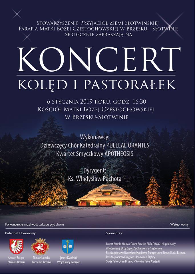 Stowarzyszenie Przyjaciół Ziemi Słotwińskiej oraz parafia Matki Bożej Częstochowskiej w Brzesku-Słotwinie zapraszają na koncert kolęd i pastorałek w wykonaniu jednego z najlepszych młodzieżowych chórów europejskich – Dziewczęcego Chóru Katedralnego „Puellae Orantes” z Tarnowa przy akompaniamencie kwartetu smyczkowego Apotheosis z Katowic. To niezwykłe wydarzenie doskonale wpisuje się w radosne świętowanie czasu Bożego Narodzenia i uatrakcyjnia ofertę kulturalną kierowaną do mieszkańców Brzeska i regionu. Koncert odbędzie się w niedzielę, 6 stycznia 2019 roku, w kościele Matki Bożej Częstochowskiej, o godzinie 16.30. Wstęp na koncert jest bezpłatny.