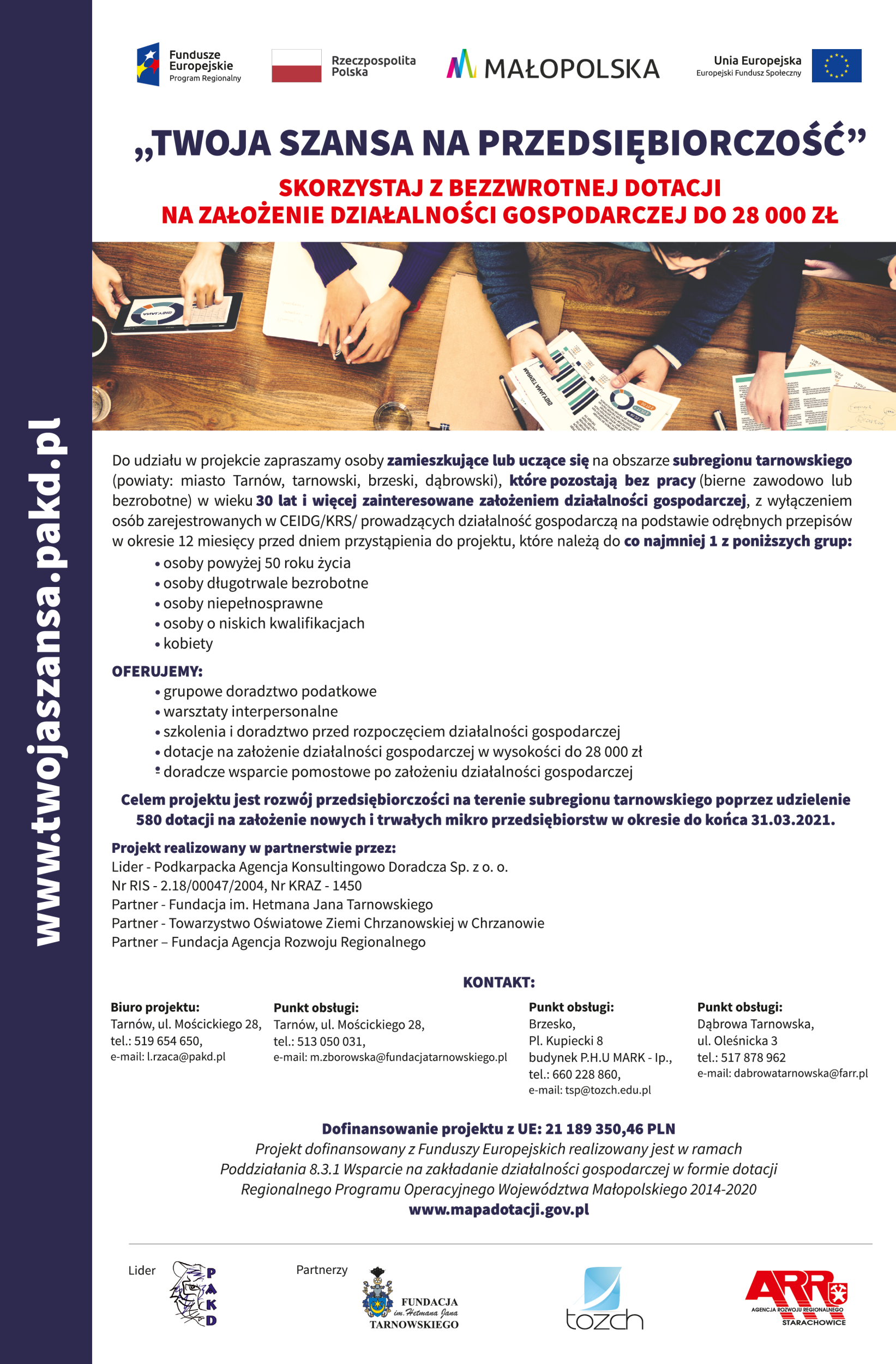 Szczegółowe informacje na temat rekrutacji i uczestnictwa w projekcie oraz dane kontaktowe dostępne na stronie projektu www.twojaszansa.pakd.plDofinansowanie projektu z UE: 21 189 350,46 PLN. Projekt realizowany jest w ramach Poddziałania 8.3.1 Wsparcie na zakładanie działalności gospodarczej w formie dotacji Regionalnego Programu Operacyjnego Województwa Małopolskiego 2014-2020.
