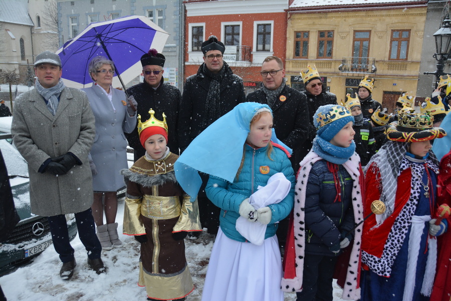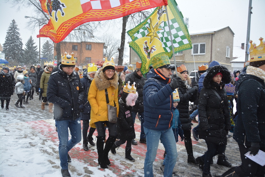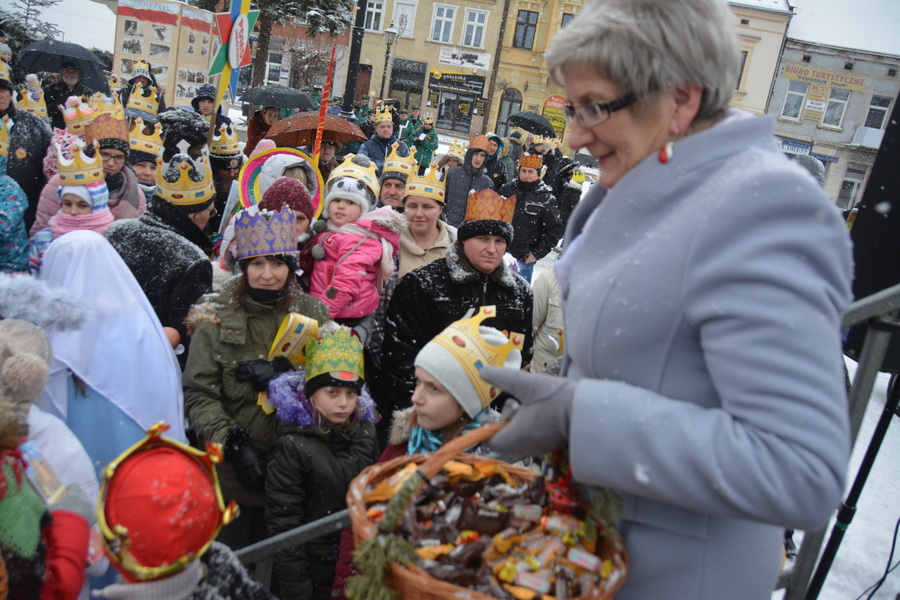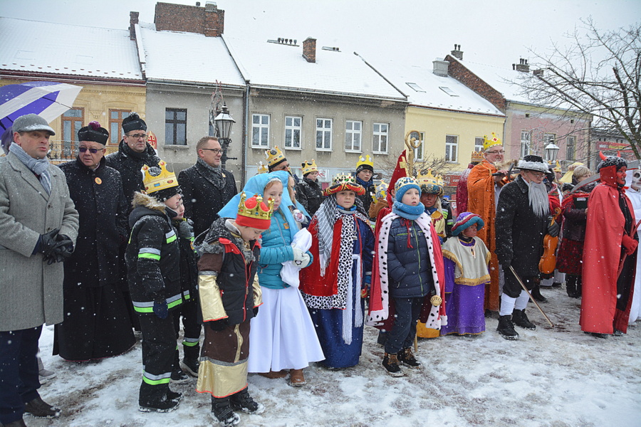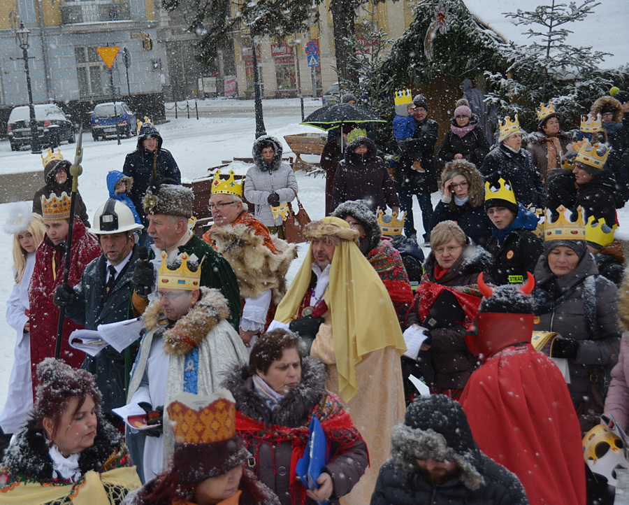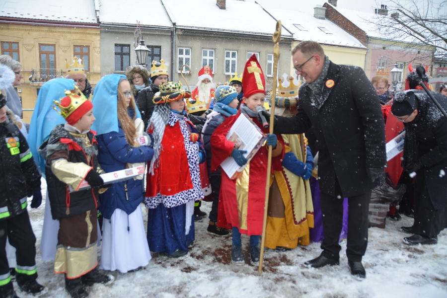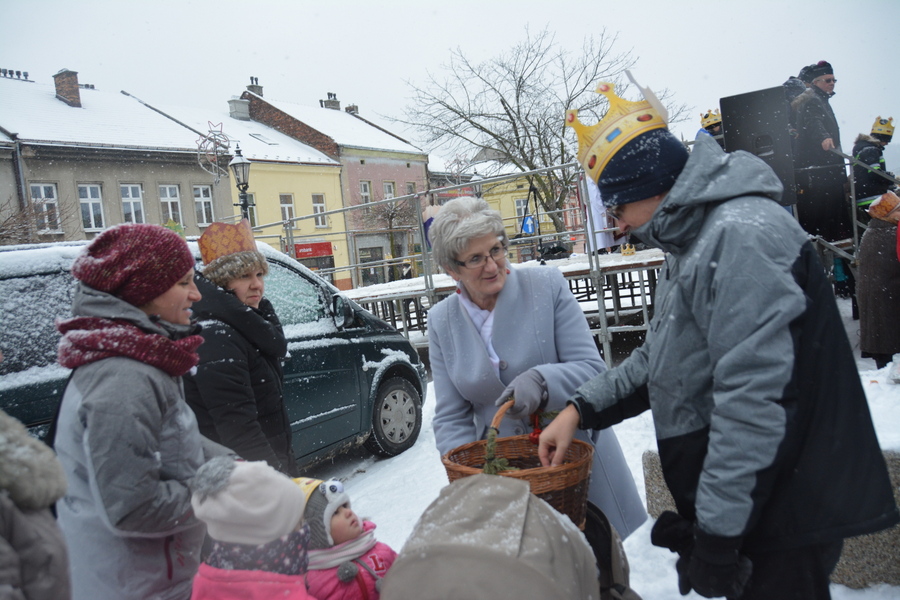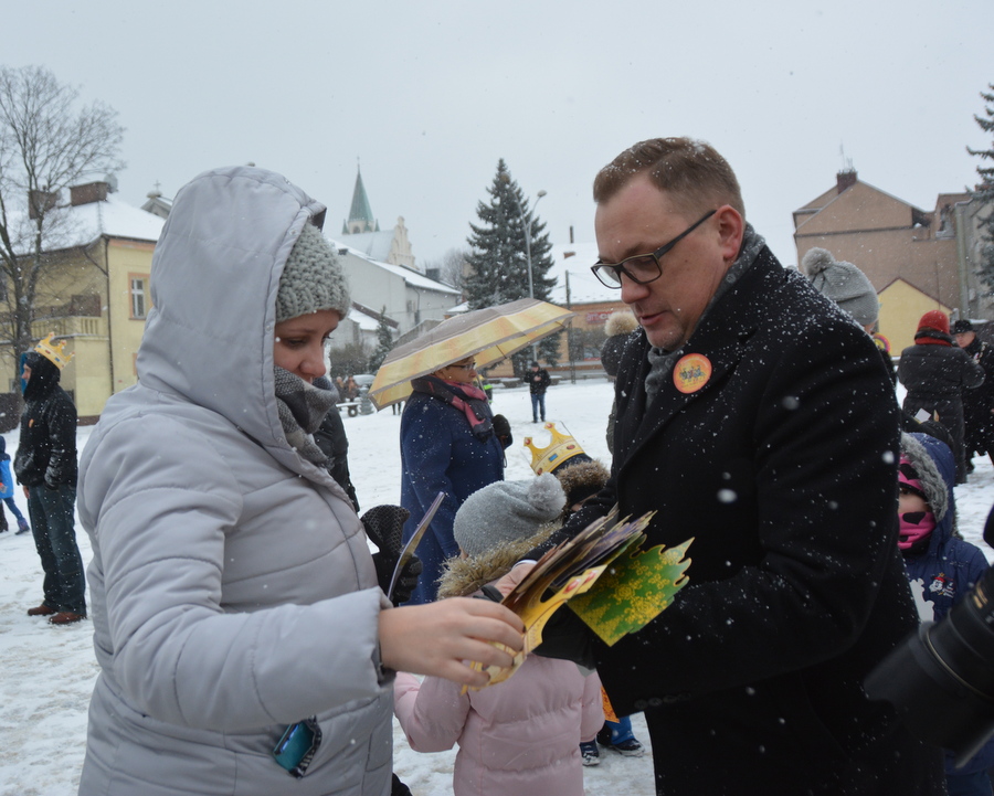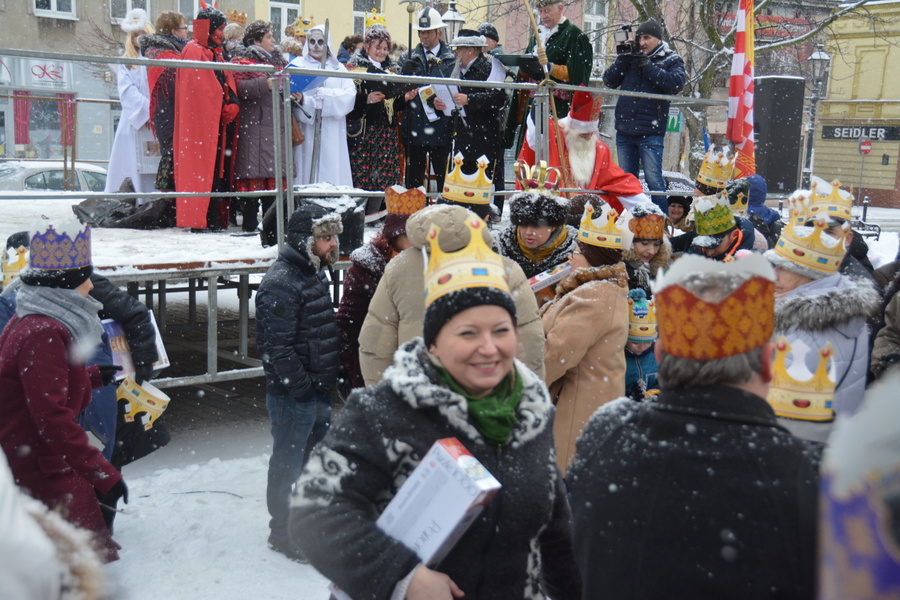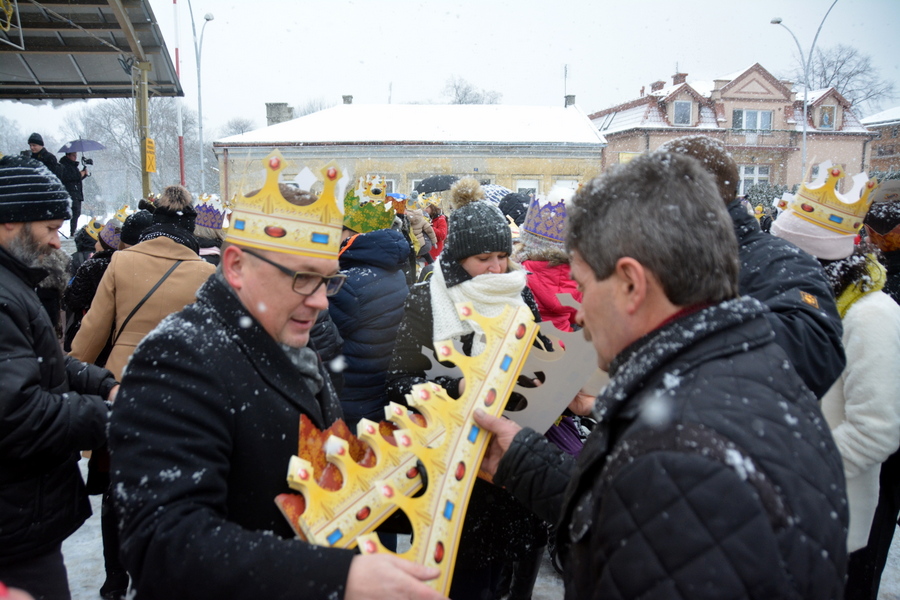 Już kilkanaście minut przed wymarszem na Plac Kazimierza tłumnie przybywali mieszkańcy, których burmistrz Tomasz Latocha oraz przewodnicząca rady miejskiej, Maria Kądziołka i miejscy radni obdarowywali koronami, śpiewnikami i pamiątkowymi naklejkami z symbolami Święta Trzech Króli, a ksiądz prałat Józef Drabik wraz z proboszczem parafii Miłosierdzia Bożego, prałatem Wojciechem Wernerem udzielili wszystkim błogosławieństwa.