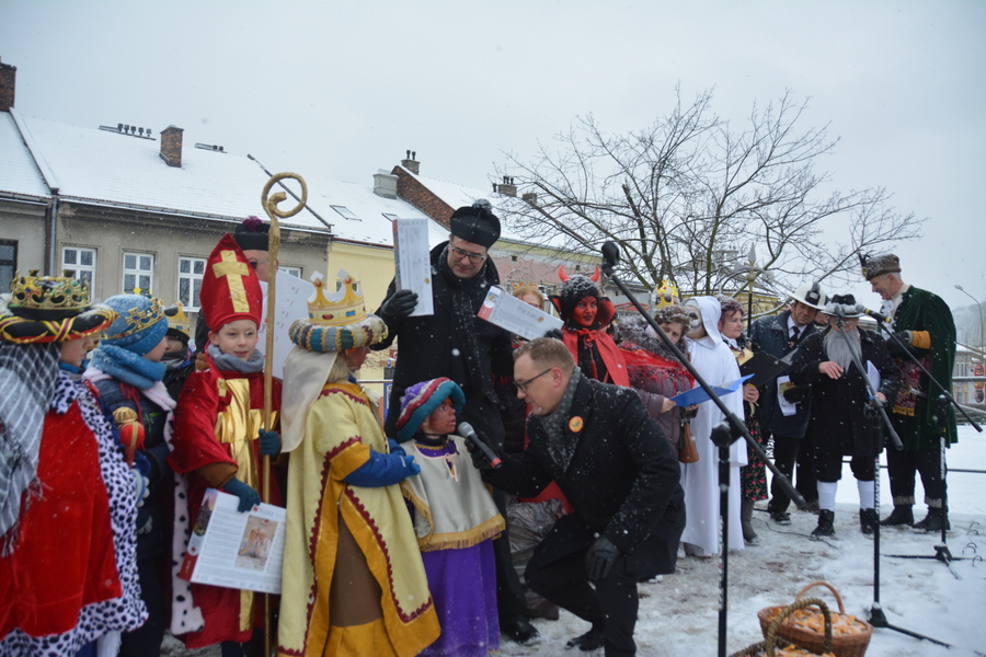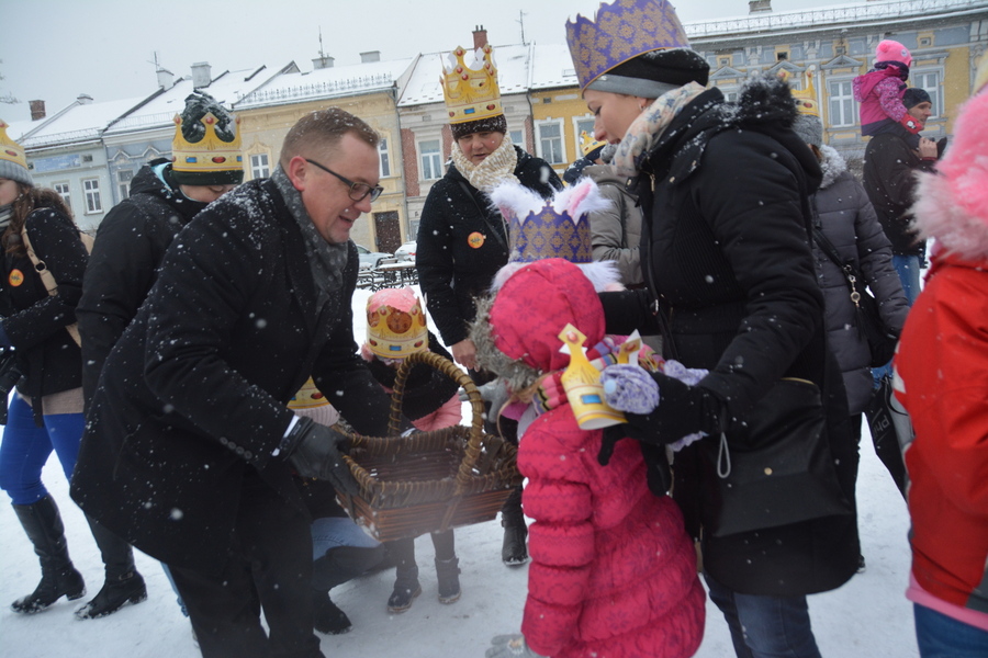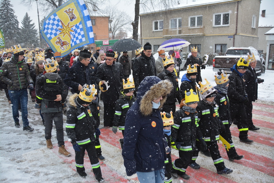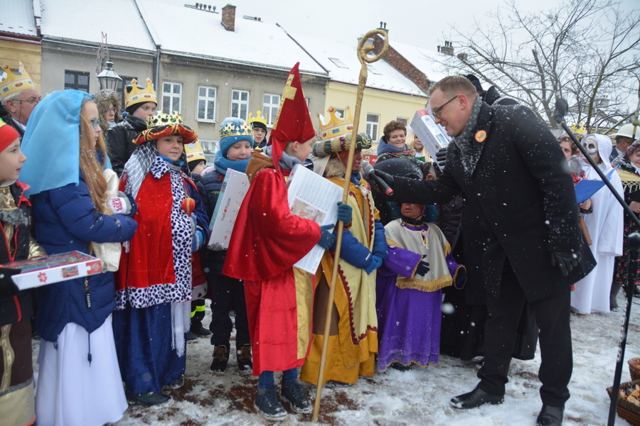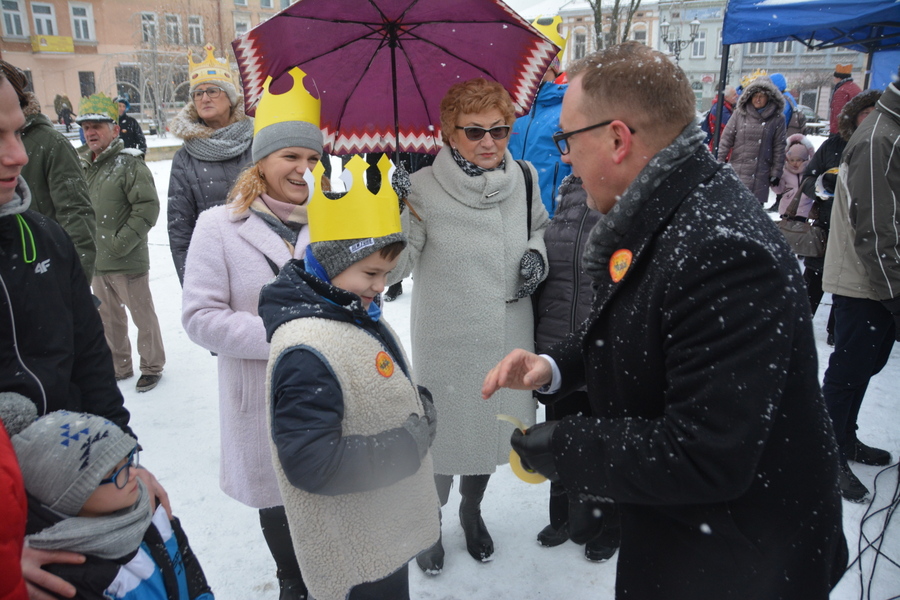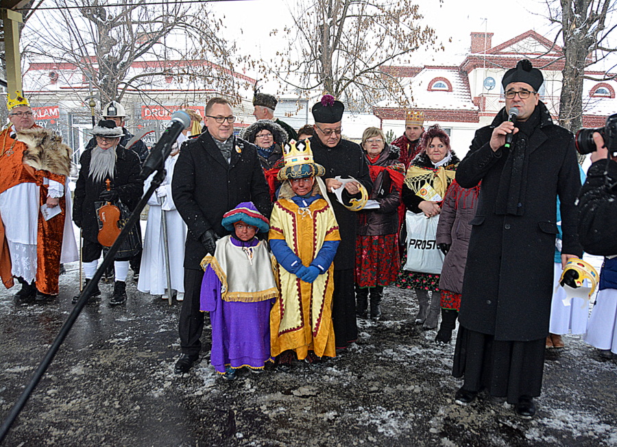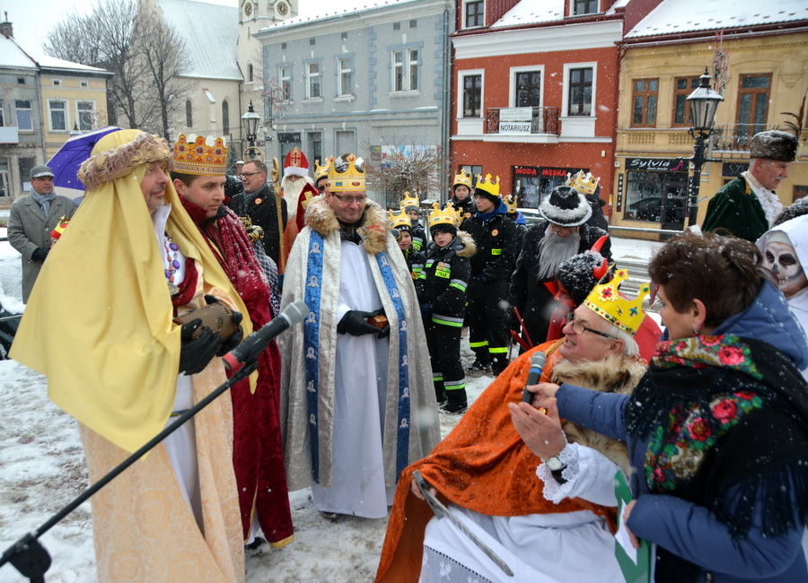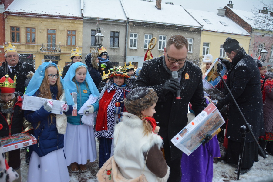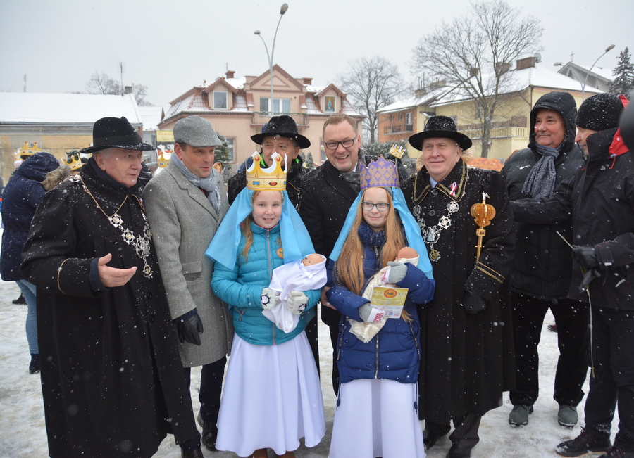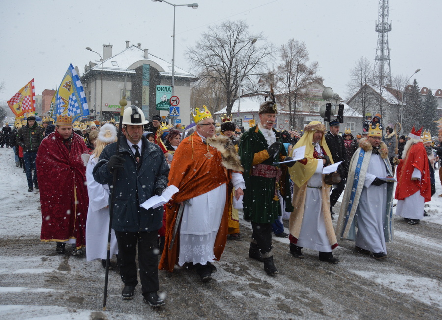 Już kilkanaście minut przed wymarszem na Plac Kazimierza tłumnie przybywali mieszkańcy, których burmistrz Tomasz Latocha oraz przewodnicząca rady miejskiej, Maria Kądziołka i miejscy radni obdarowywali koronami, śpiewnikami i pamiątkowymi naklejkami z symbolami Święta Trzech Króli, a ksiądz prałat Józef Drabik wraz z proboszczem parafii Miłosierdzia Bożego, prałatem Wojciechem Wernerem udzielili wszystkim błogosławieństwa.