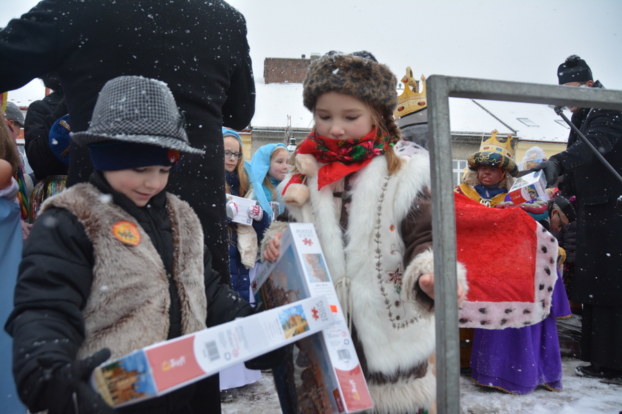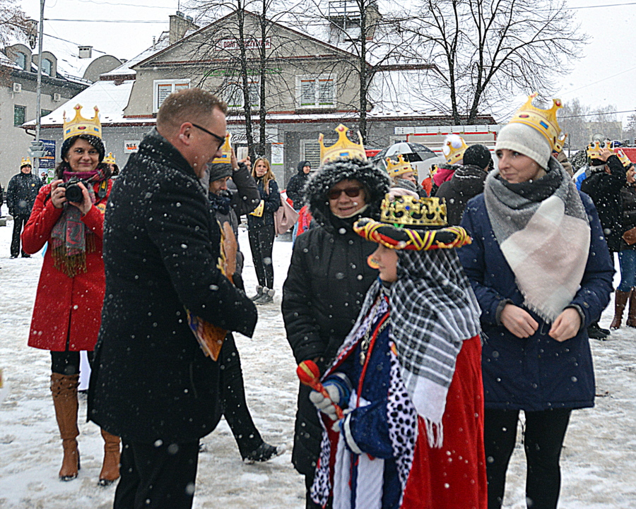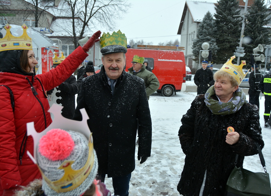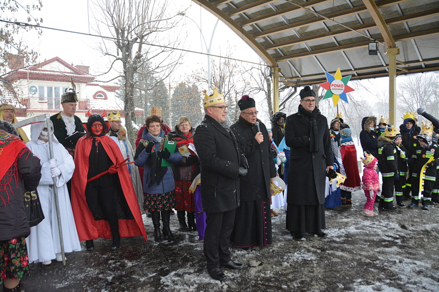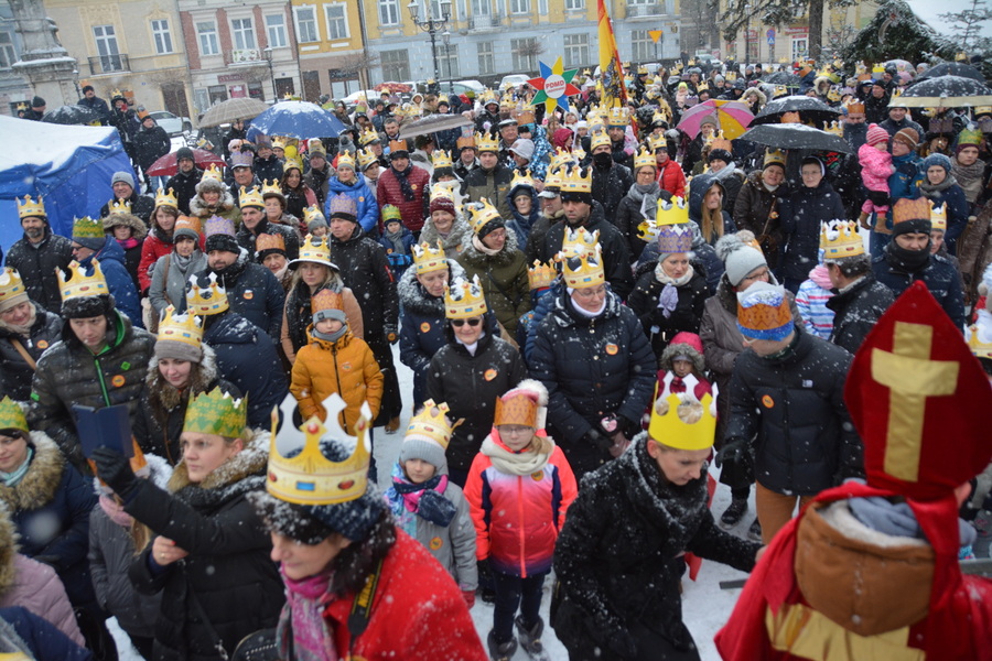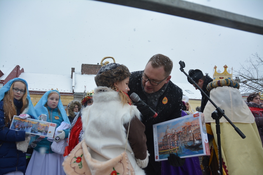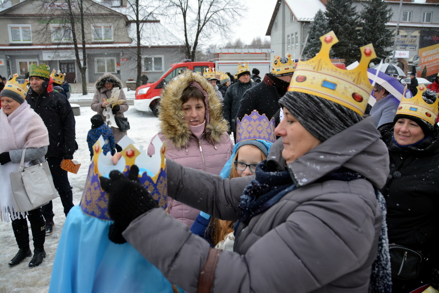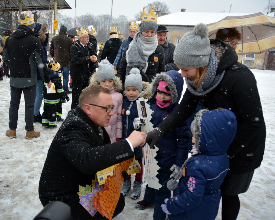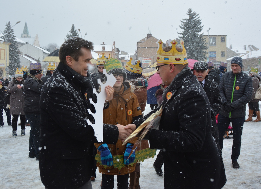 Już kilkanaście minut przed wymarszem na Plac Kazimierza tłumnie przybywali mieszkańcy, których burmistrz Tomasz Latocha oraz przewodnicząca rady miejskiej, Maria Kądziołka i miejscy radni obdarowywali koronami, śpiewnikami i pamiątkowymi naklejkami z symbolami Święta Trzech Króli, a ksiądz prałat Józef Drabik wraz z proboszczem parafii Miłosierdzia Bożego, prałatem Wojciechem Wernerem udzielili wszystkim błogosławieństwa.