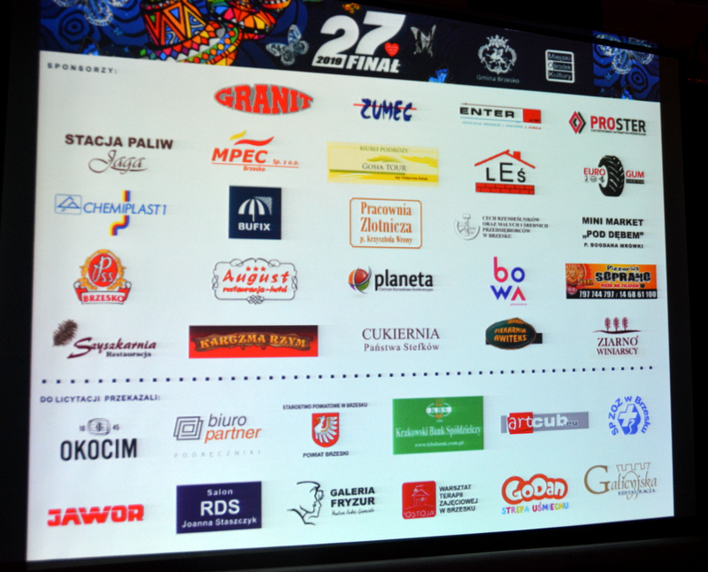 Sponsorami brzeskiego finały WOŚP byli MPEC, firma Granit, firma Proster, Chemiplast, Mini Market pod Dębem, zakład instalacyjno-montażowy Enter, hotel August, zakład urządzeń mechanicznych Zumec, firma Euro-Gum, biuro ubezpieczeniowe Bufix, stacja paliw - hotel JAGA, biuro podróży Gosia Tour, PSS Społem – restauracja Pawilon, przedsiębiorstwo budowlano-handlowo-transportowe LEŚ, Centrum Rozrywkowo - Konferencyjne Planeta, Drukarnia BOWA p. Dziedziców, Pracownia Złotnicza Krzysztofa Wrony, Pizzeria Soprano, Restauracja Szyszkarnia, Karczma Rzym, Cukiernia Czudeccy - Małgorzata Stefek, Piekarnia Ziarno Winiarscy, Piekarnia Awiteks i Cech Rzemieślników oraz Małych i Średnich Przedsiębiorców w Brzesku.