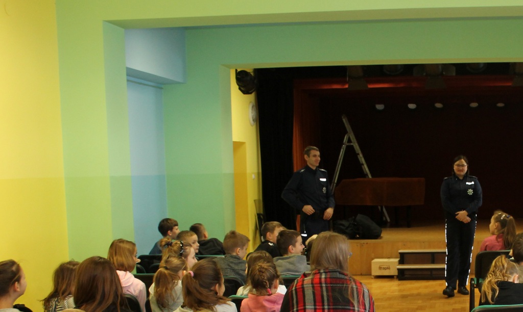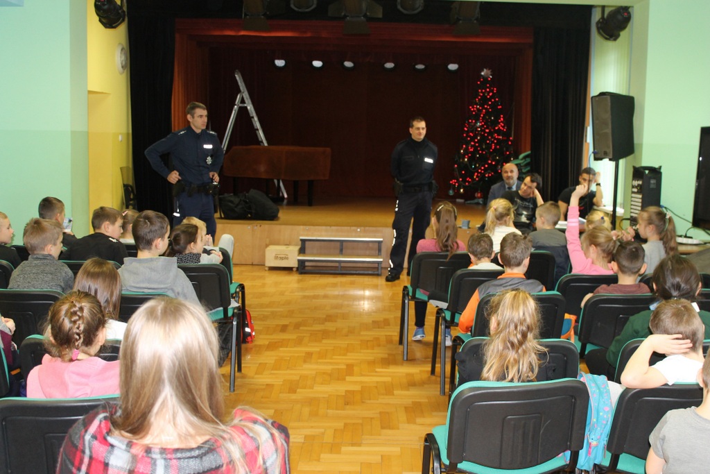 Jedno z takich spotkań odbyło się w Dębińskim Centrum Kultury. Dzieci przysłuchiwały się prelekcji przygotowanej przez dzielnicowych oraz st. sierż. Monikę Lis z Zespołu ds. Profilaktyki Społecznej, Nieletnich i Patologii. Policjanci przypomnieli o zasadach bezpiecznego poruszania się po drogach i o tym, jak ważne jest korzystanie z odblasków. Przestrzegali również przed zabawą na zamarzniętych akwenach wodnych. Funkcjonariusze udzielili dzieciom wskazówek jak zachować się w kontakcie z nieznajomym, a także poruszyli tematy związane z zagrożeniami w sieci. Najmłodsi z zaciekawieniem słuchali rad i aktywnie uczestniczyli w spotkaniu.
