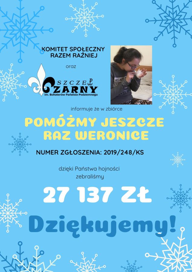 W ten sposób Szczep Czarny im. Bohaterów Państwa Podziemnego po raz czwarty w ciągu ostatnich 12 miesięcy wesprze dziewczynkę swoją zbiórką. Poprzednio były to kwoty dużo niższe: w marcu 2018 r. - 3000 złotych, w maju 2018 r. - 6000 złotych, a we wrześniu 2018 r. - 12.000 złotych. W sumie, w wyniku wszystkich czterech zbiórek zuchy i harcerze z Jadownik, Sterkowca i Szczepanowa zrzeszeni w największym środowisku harcerskim w powiecie brzeskim, czyli Szczepie Czarnym im. Bohaterów Państwa Podziemnego wsparli Weronikę kwotą ponad 48 tysięcy złotych!