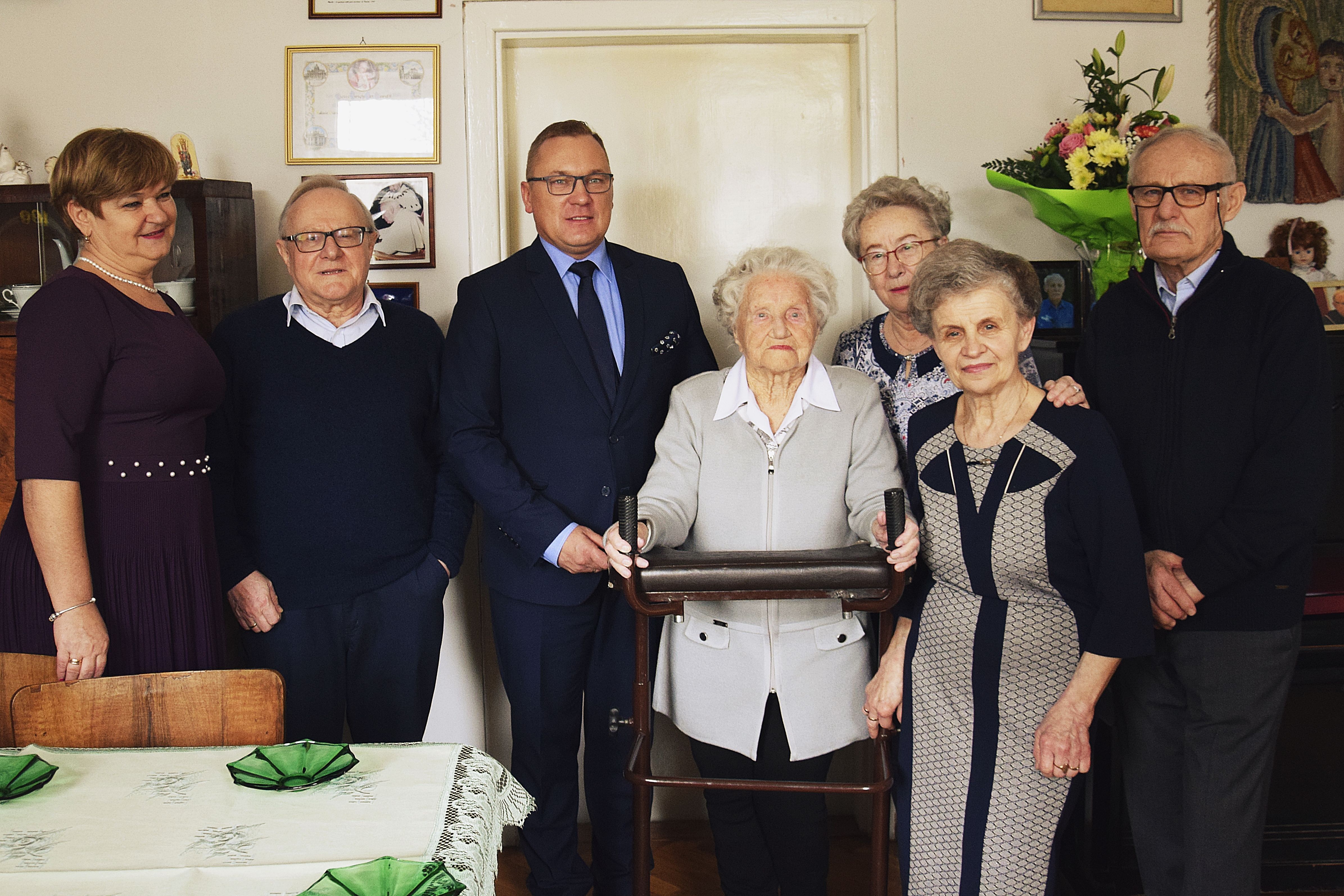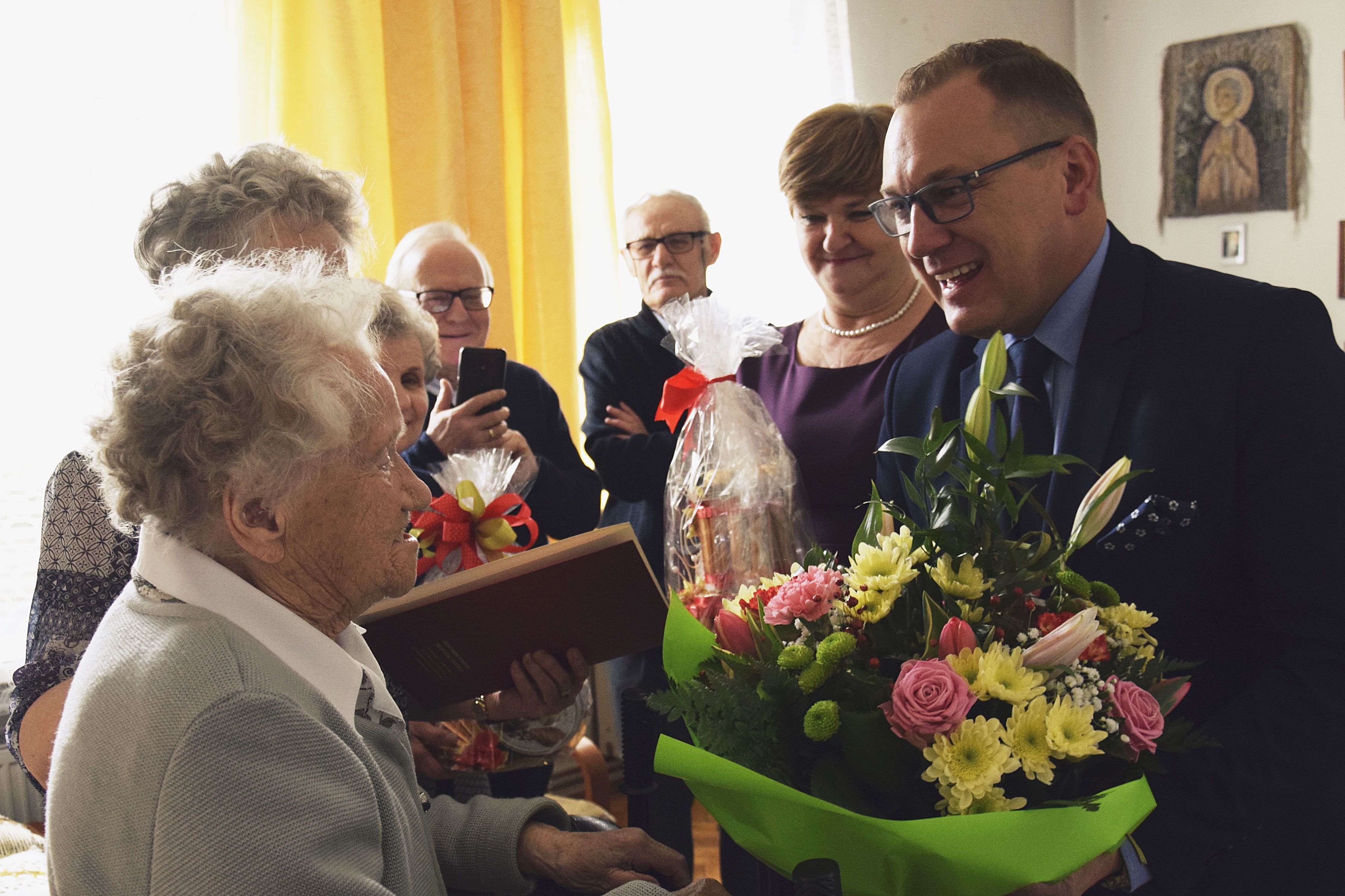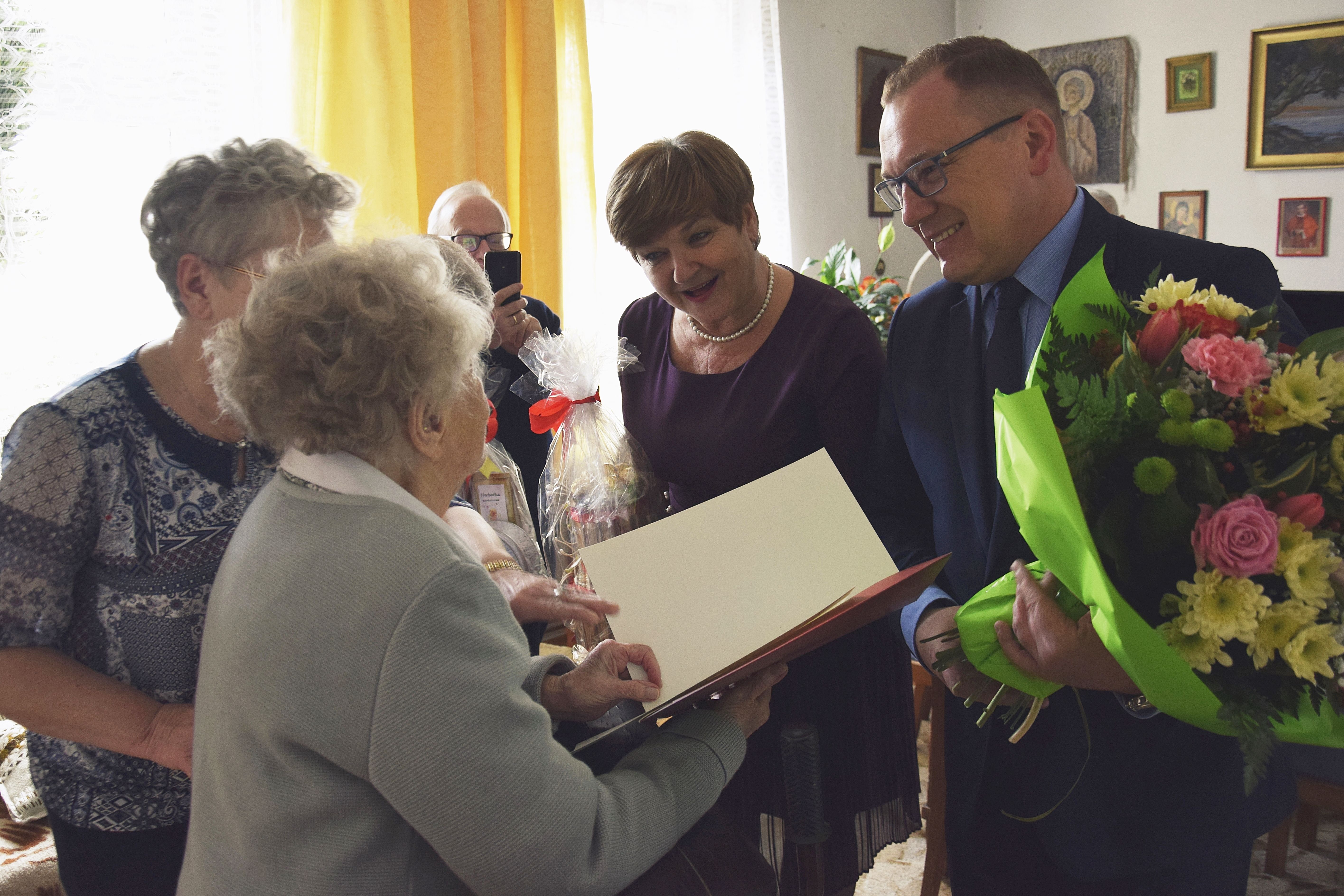 Pani Halina Biernat z Brzeska świętowała 102. urodziny, wizytę Jubilatce złożyli radna Maria Kucia, szefowa Urzędu Stanu Cywilnego Aleksandra Fijałkowska oraz burmistrz Tomasz Latocha, który składał Pani Halinie życzenia oraz wręczył okolicznościowy list i kwiaty.