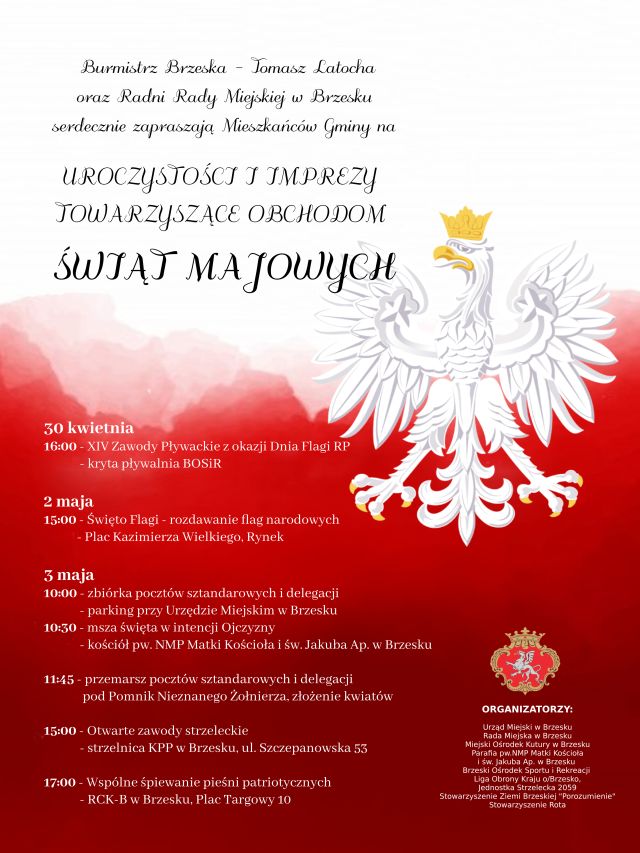 Burmistrz Tomasz Latocha oraz radni Rady Miejskiej w Brzesku zapraszają mieszkańców gminy na uroczystości i imprezy przygotowane z okazji świąt majowych.30 kwietnia, o godzinie 16.00 w brzeskiej pływalni rozpoczną się XIV Zawody Pływackie z okazji Dnia Flagi RP;