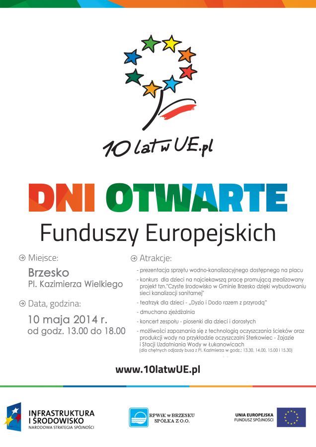 10 maja w Brzesku, przy Placu Kazimierza Wielkiego, z okazji 10. rocznicy przystąpienia do Unii Europejskiej odbędzie się dzień otwarty w Rejonowym Przedsiębiorstwie Wodociągów i Kanalizacji. Organizatorzy przygotowali dla widzów wiele atrakcji. Plac Kazimierza Wielkiego zamieni się w ekspozycje sprzętu wodno-kanalizacyjnego, dzieci będą mogły brać udział w konkursie na najciekawszą pracę promującą projekt „Czyste środowisko w gminie Brzesko dzięki wybudowaniu sieci kanalizacji sanitarnej”. Dla maluchów przygotowano także przedstawienie teatralne „Dyzio i Dodo razem z przyrodą”.Chętni będą mogli pojechać do oczyszczalni ścieków w Sterkowcu i do stacji uzdatniania wody w Łukanowicach, gdzie zapoznają się z najnowszymi technologiami.Szczegółowy program imprezy na plakacie.