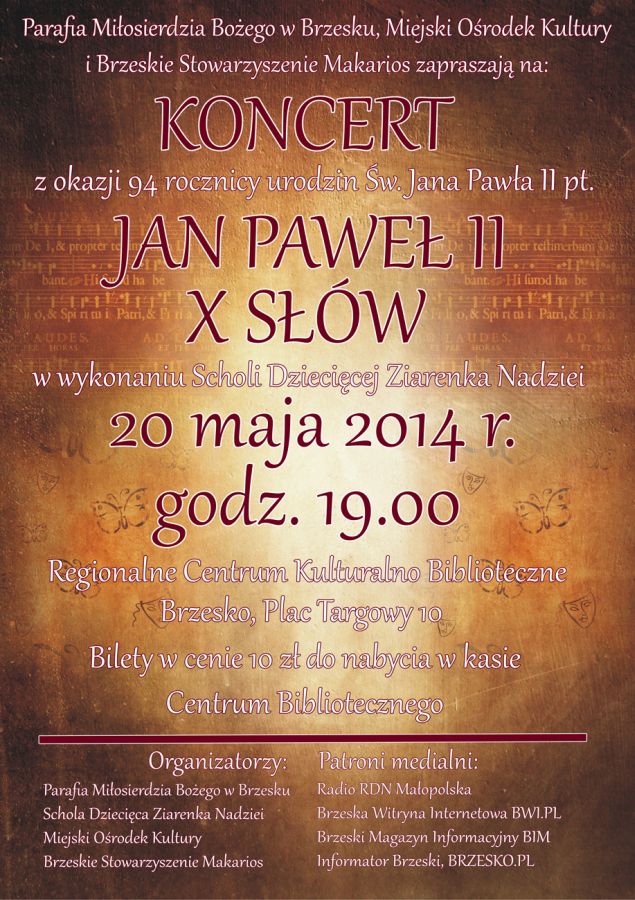Za nami kanonizacja Jana Pawła II, wielkie święto wiary i radości, szczególnie dla nas Polaków. A teraz nadal trwamy w wielkim dziękczynieniu i pamięci o świętym papieżu wyrażanym na wiele sposobów: poprzez modlitwę, różnorodne uroczystości, spotkania, spektakle, koncerty...Włączając się w to wielkie dziękczynienie parafia pw. Miłosierdzia Bożego w Brzesku, Miejski Ośrodek Kultury i Brzeskie Stowarzyszenie Makarios, a w sposób szczególni młodzi wykonawcy, czyli Parafialna Schola Dziecięca Ziarenka Nadziei gorąco zapraszają wszystkich do Regionalnego Centrum Kulturalno Bibliotecznego.