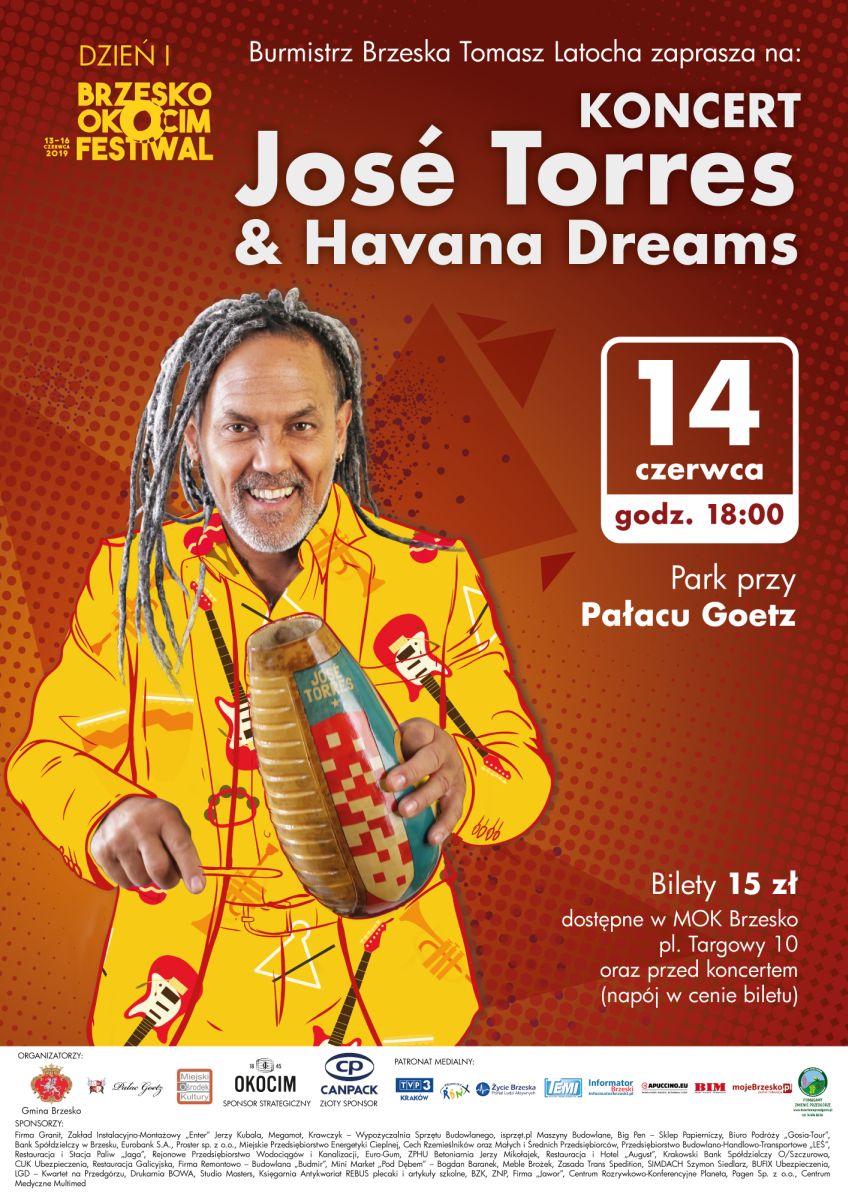 14 czerwca w parku przy pałacu Goetzów Okocimskich odbędzie się koncert Jose Torresa z zespołem Havana Dreams. Początek koncertu o godzinie 18.00.Jose Torres to pochodzący z Kuby artysta, wirtuoz instrumentów perkusyjnych od wielu lat mieszka w Polsce. Występując od ponad 25 lat na polskiej scenie muzycznej współpracował z wieloma gwiazdami estrady m.in. Marylą Rodowicz, Kayah, Ewą Bem, Urszulą, grupą Maanam, Ryszardem Rynkowskim, Stanisławem Soyką, Grzegorzem Ciechowskim, Raz Dwa Trzy, Mietkiem Szcześniakiem, Blue Cafe i wieloma innymi. Koncertował i nagrywał również z czołówką muzyków jazzowych - Tomaszem Stańko, Wojciechem Karolakiem, Zbigniewem Namysłowskim, Jarosławem Śmietaną, Leszkiem Możdżerem. Brał udział w ponad pięćdziesięciu nagraniach płytowych polskich wykonawców a także w nagraniach muzyki filmowej, m.in. "Krew i wino" z Jackiem Nicholsonem, "Bandyta", "Prawo ojca". Od ponad 25 lat zajmuje pierwsze miejsce w ankiecie na najpopularniejszego muzyka roku w kategorii "instrumenty perkusyjne", którą corocznie organizuje najstarsze i najbardziej renomowane czasopismo muzyczne "Jazz Forum".
