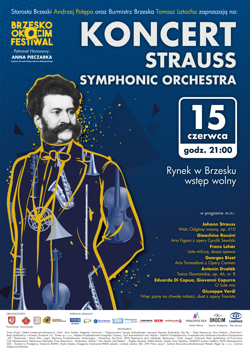 15 czerwcana brzeskim Rynku zagra Strauss Symphonic Orchestra, początek koncertu o godzinie 21.00. Widzowie koncertu wysłuchają utworów Johanna Strausa, Gioachino Rossiniego, Franza Lehara, Georga Bizeta, Antniego Dvoraka i Giuseppe Verdiego.