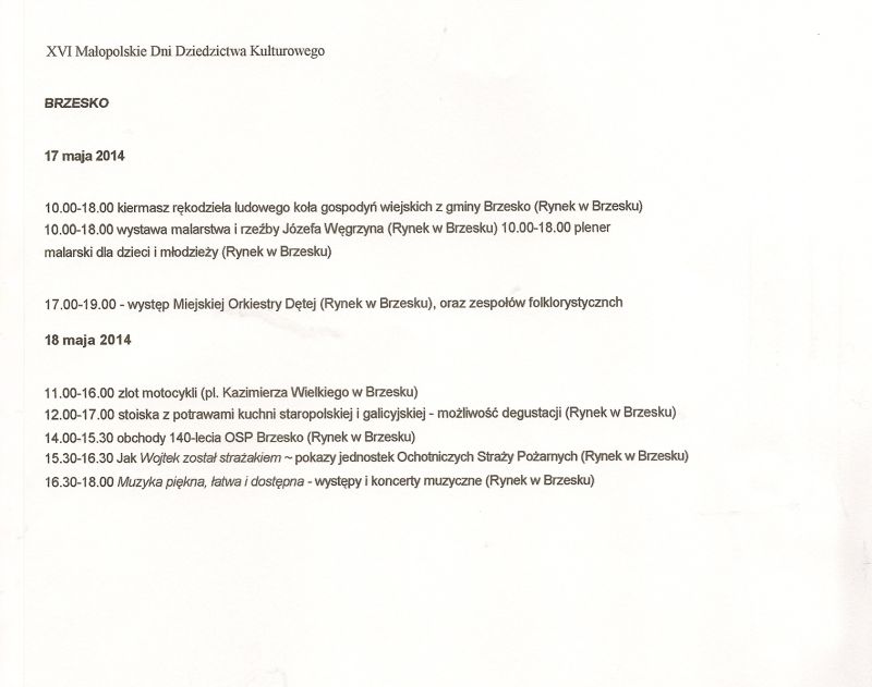 W ramach XVI Małopolskich Dni Dziedzictwa Kulturowego , w najbliższy weekend zaplanowano wiele imprez, które odbędą się na Placu Kazimierza Wielkiego oraz na brzeskim Rynku. Urząd Miejski w Brzesku we współpracy z Miejskim Ośrodkiem Kultury i motocyklistami z grupy „Brothers of the South” przygotował wiele ciekawych spotkań, pokazów, konkursów.