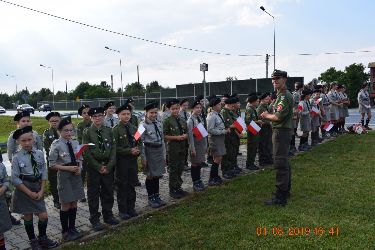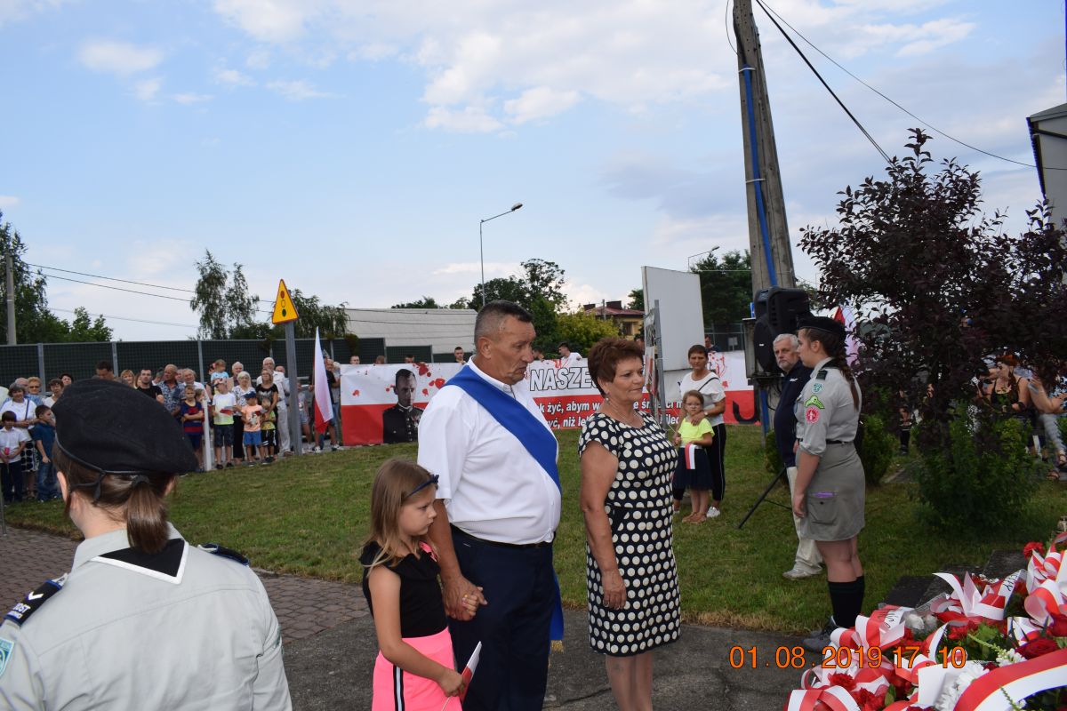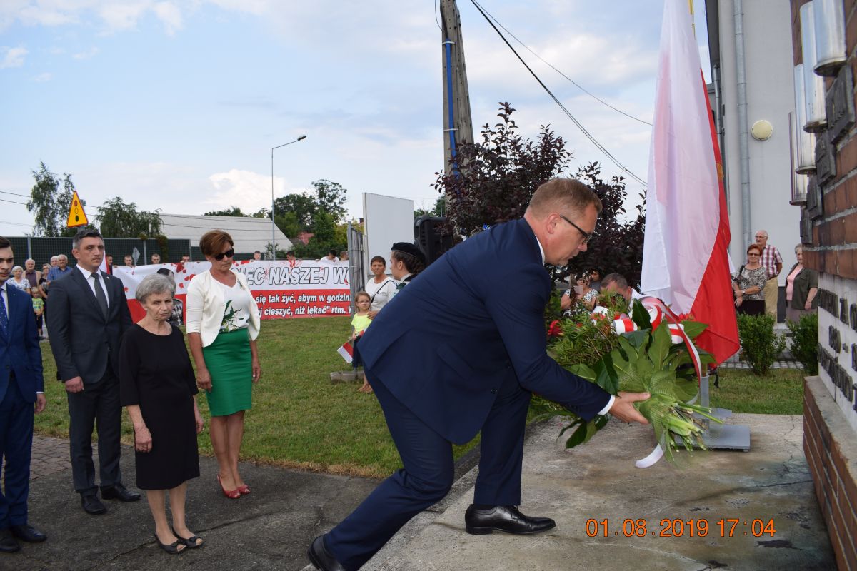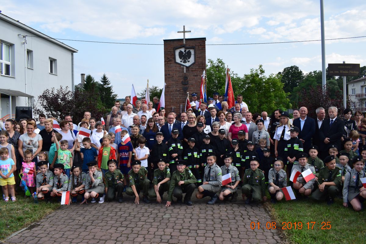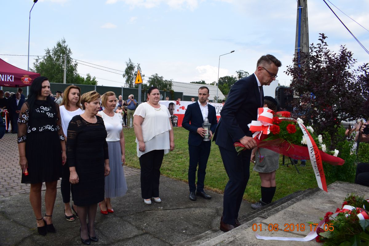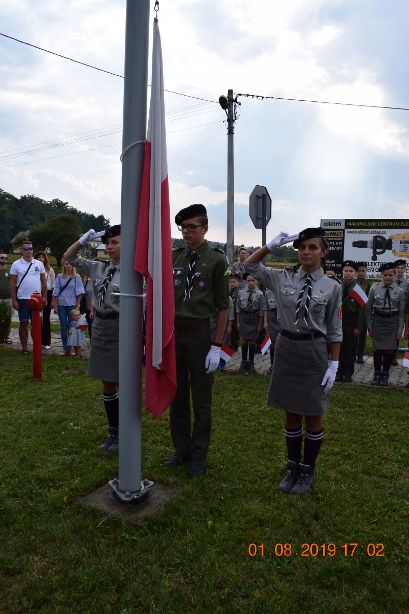 Punktualnie o godzinie 17.00 dźwięk syreny z remizy OSP przypomniał o godzinie rozpoczęcia tego wielkiego, heroicznego zrywu mieszkańców stolicy. Poczet flagowy harcerzy Szczepu Czarnego wciągnął biało-czerwoną flagę na maszt, a zgromadzeni uczestnicy uroczystości odśpiewali hymn Polski. Przedstawiciele przybyłych delegacji złożyli pod obeliskiem wiązanki kwiatów i zapalili znicze. Uczestnicy uroczystości mieli również możliwość obejrzenia w domu ludowym wystawy poświęconej Powstaniu Warszawskiemu.