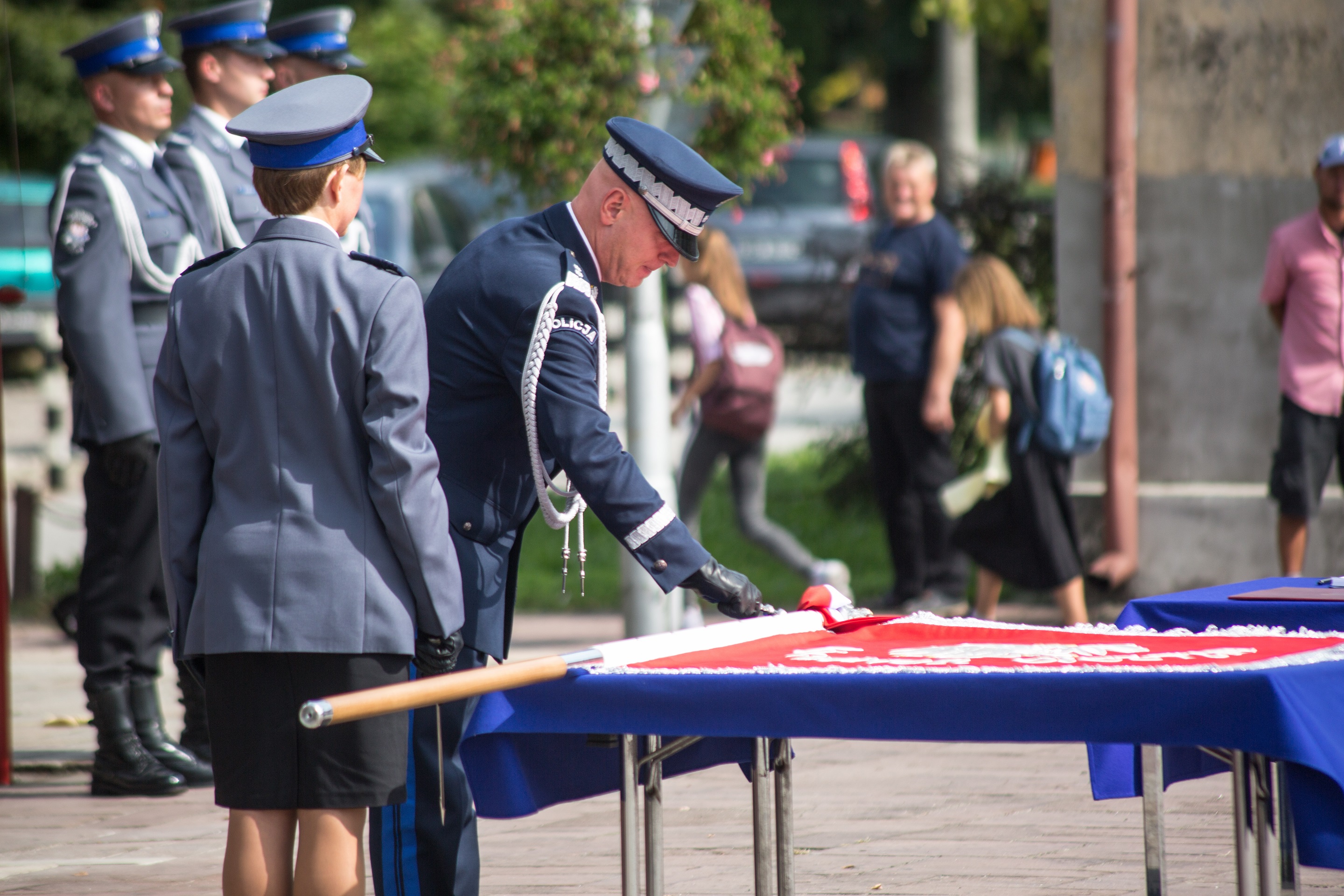 Oficjalnego przekazania sztandaru na ręce komendanta powiatowego policji w Brzesku, mł. insp. Bogusława Chmielarza dokonał komendant główny, gen. Jarosław Szymczyk, któremu towarzyszył przewodniczący Komitetu Honorowego Ufundowania Sztandaru dla KPP w Brzesku, Andrzej Potępa.Uroczyste wręczenie sztandaru poprzedziło symboliczne wbicie w drzewiec gwoździ honorowych. Gwóźdź pamiątkowy 100. rocznicy powstania policji państwowej wbiła wnuczka zamordowanego w Miednoje aspiranta policji, Antoniego Rusina – Krystyna Oktawiec. Złożono również podpisy w księdze pamiątkowej sztandaru.