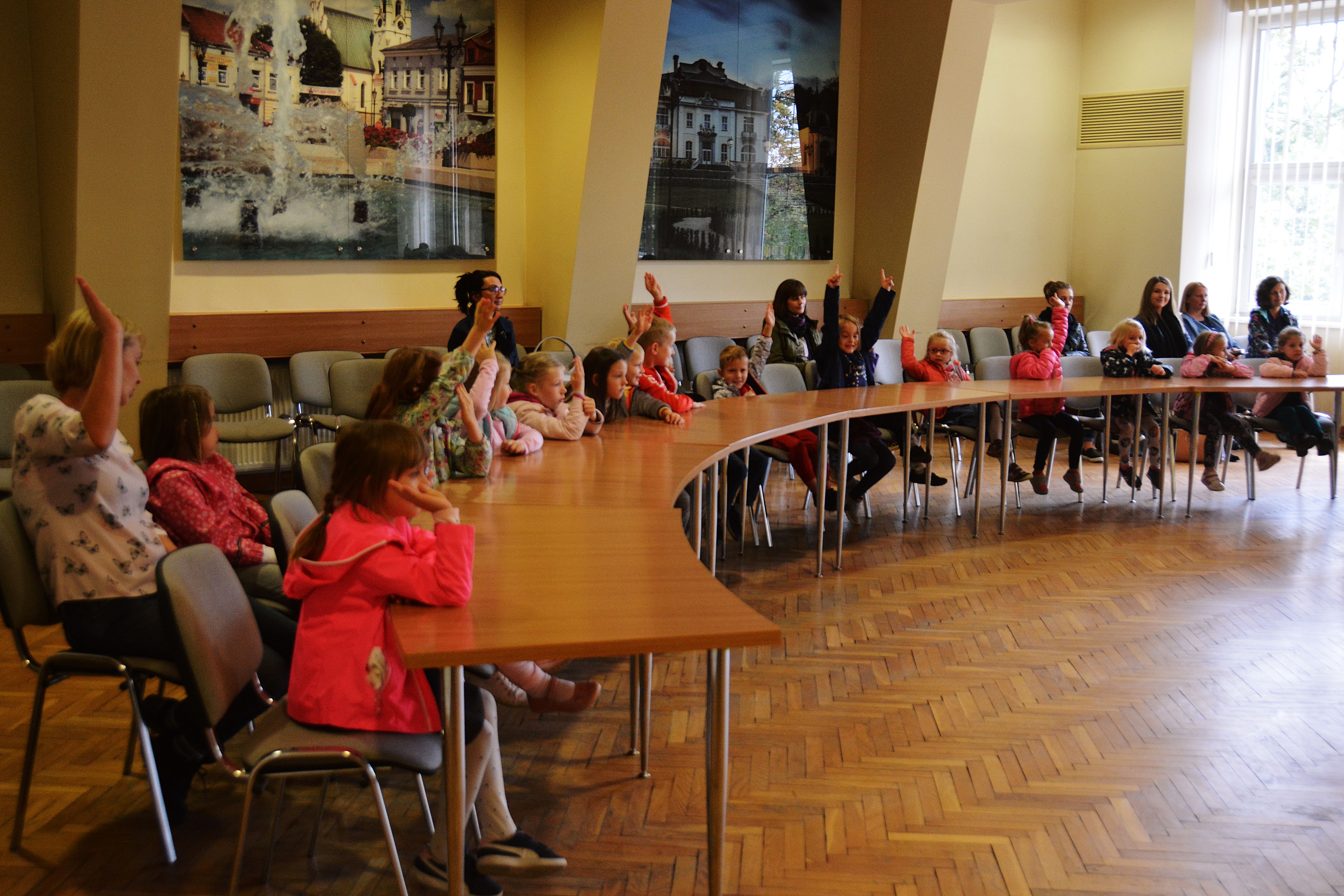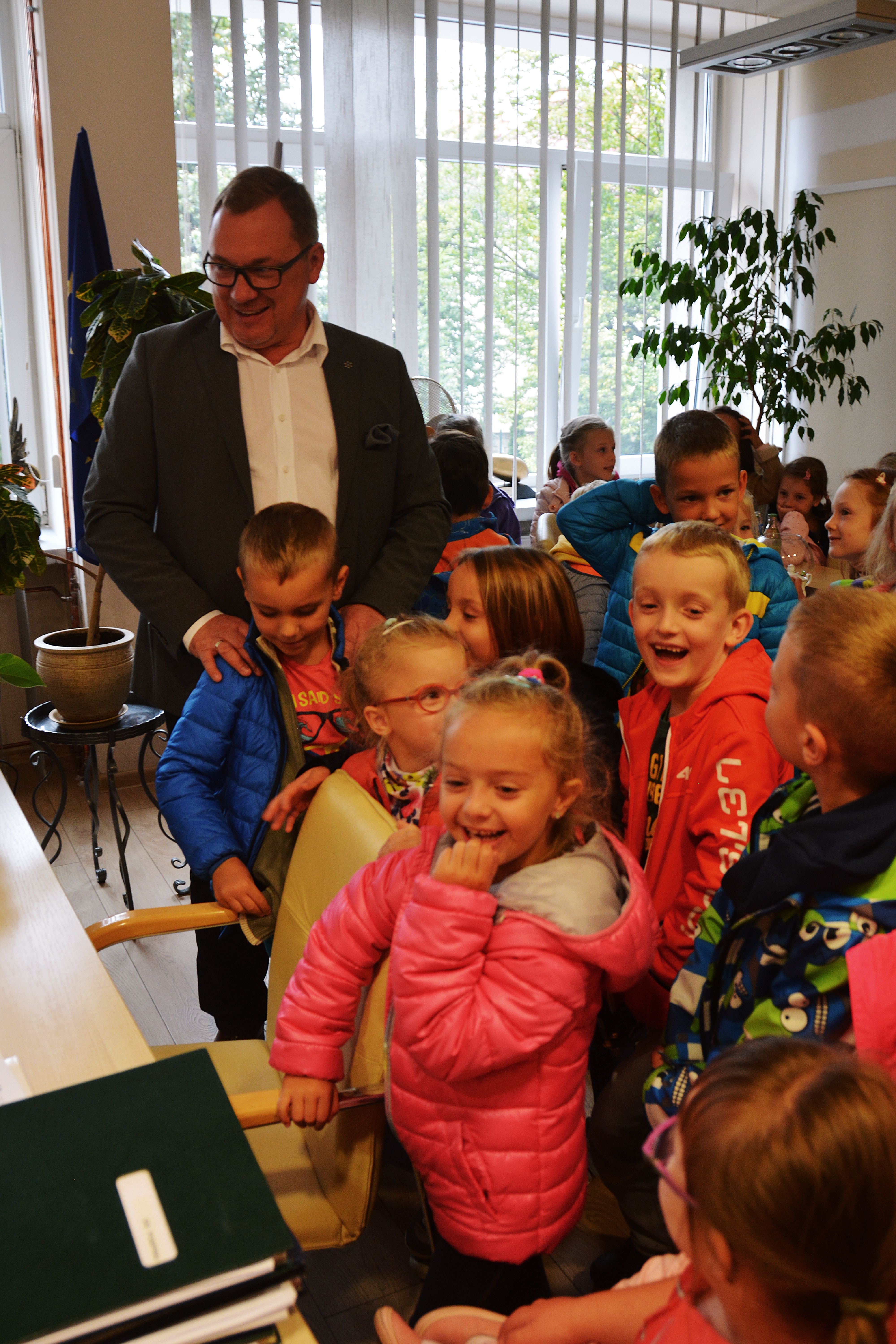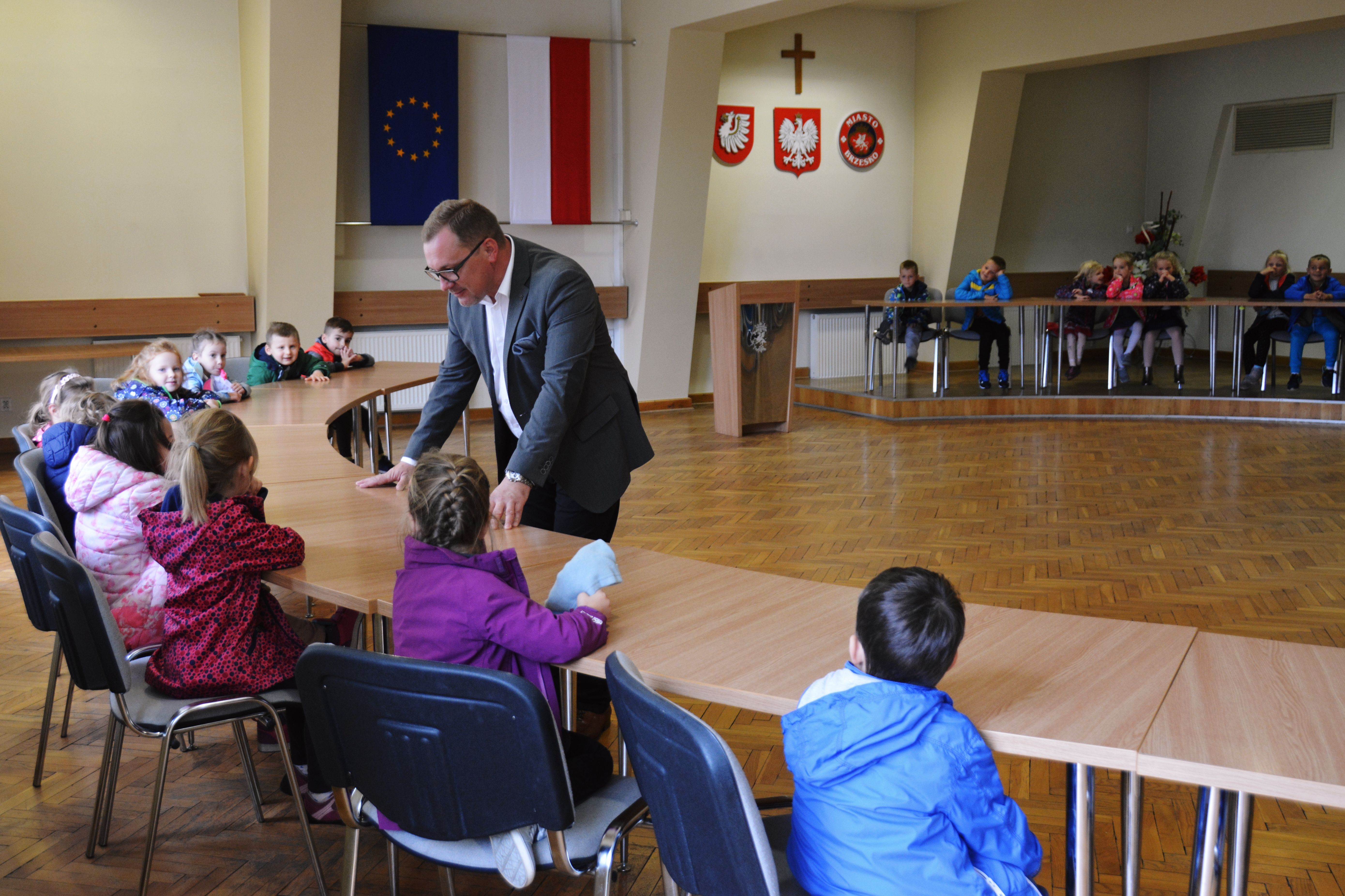 W sali obrad dzieci zajęły miejsca radnych, a Tomasz Latocha wyjaśniał, na czym polega ich praca i działalność. Na kończenie wizyty maluchy dostały słodycze i razem z burmistrzem pozowały do wspólnej fotografii.