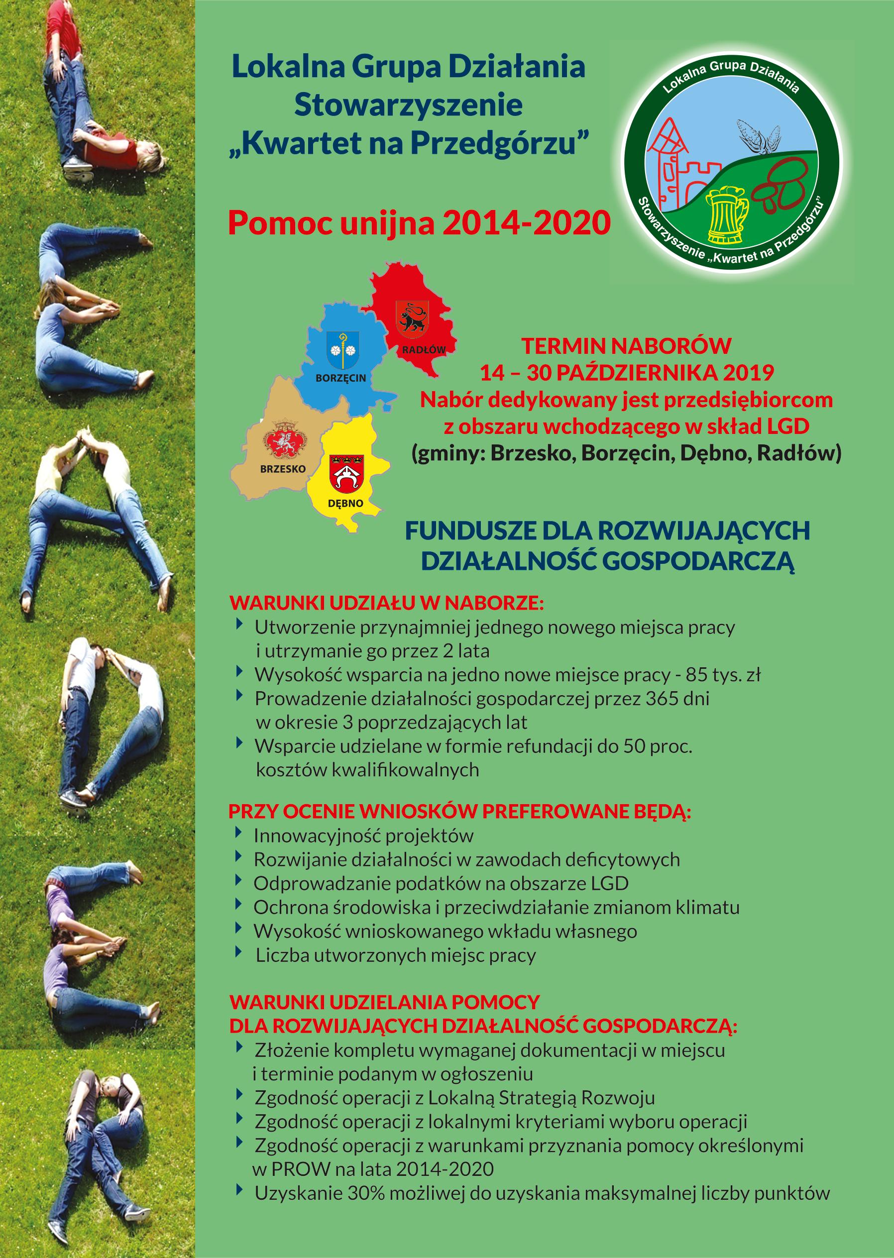 – W najbliższym naborze dla rozwijających działalność gospodarczą na naszym obszarze, czyli w gminach Brzesko, Borzęcin, Dębno i Radłów, beneficjenci będą mogli otrzymać maksymalną pomoc w wysokości około 125 tys. zł – informują w LGD. – To kwota, będąca 50-procentową refundacją kosztów realizowanej operacji, której realizację należy zaplanować w przyszłym roku, po podpisaniu stosownej umowy z Samorządem Województwa Małopolskiego. Dopiero wówczas, po spełnieniu wszelkich proceduralnych wymogów, można rozpoczynać realizację operacji. Na jej zakończenie i rozliczenie wnioskodawcy mają dwa lata.