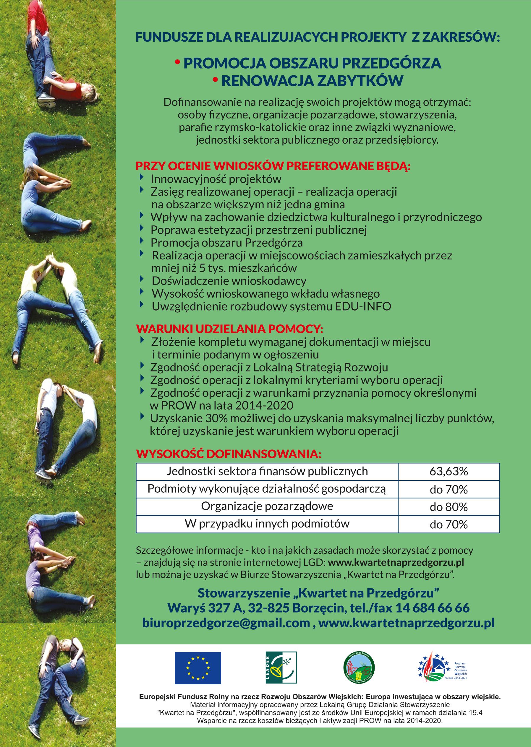 Europejski Fundusz Rolny na rzecz Rozwoju Obszarów Wiejskich: Europa inwestująca w obszary wiejskie. Publikacja opracowana przez Lokalną Grupę Działania Stowarzyszenie „Kwartet na Przedgórzu”, współfinansowana ze środków Unii Europejskiej w ramach działania 19.4 Wsparcie na rzecz kosztów bieżących i aktywizacji PROW na lata 2014-2020.