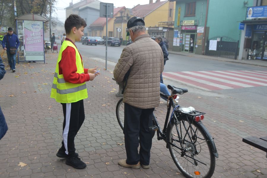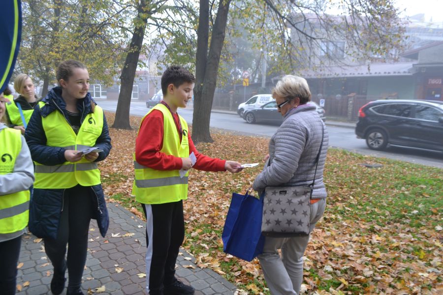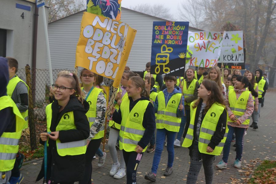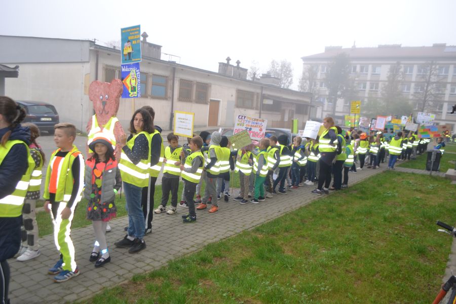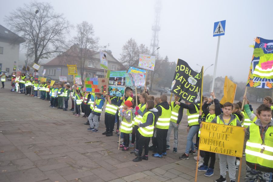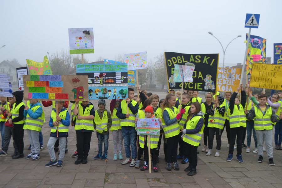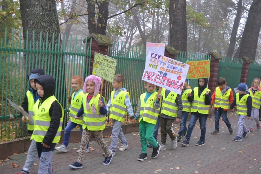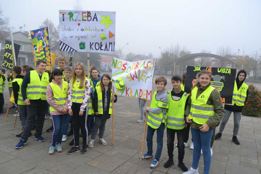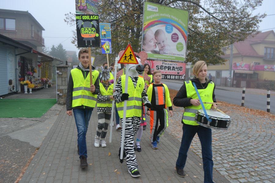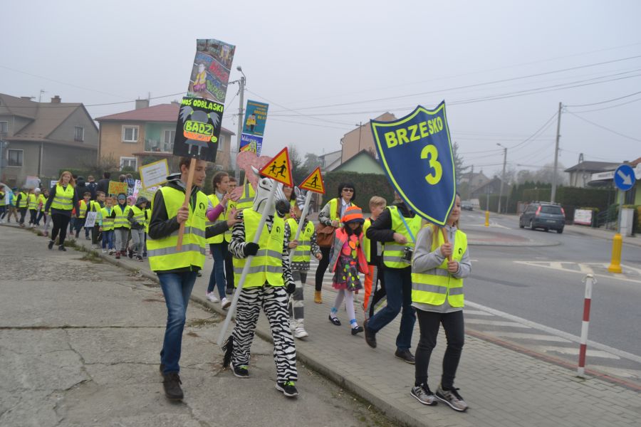 Na czele korowodu, przy odgłosie werbli, szła zebra w kamizelce odblaskowej, nasza szkolna maskotka BRD, która niosła znak informacyjny „Przejście dla pieszych”, zachęcając w ten sposób do przekraczania jezdni na pasach. Podczas marszu po mieście uczniowie głośno skandowali hasła wzywające do noszenia odblasków oraz rozdawali przygotowane przez siebie ulotki, w których apelowali o potrzebę korzystania z wyznaczonych przejść dla pieszych.
