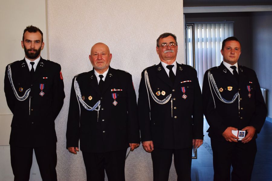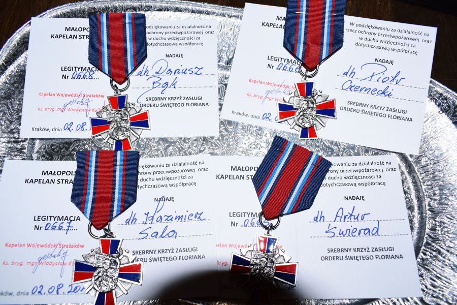 Po mszy, barwny korowód strażaków, gości wraz z pocztami sztandarowymi udał się do domu ludowego na dalszą część uroczystości. Sekretarz OSP Jadowniki dh Michał Loranty przypomniał zebranym gościom historię jednostki oraz odnowionego sztandaru. Burmistrz Brzeska Tomasz Latocha w swoim wystąpieniu pogratulował druhom znakomitych osiągnięć i wyszkolenia, podziękował za dbałość o historyczny sztandar. Wspomniał, że pod koniec roku jednostka wzbogaci się o nowy, średni wóz bojowy wart 800 tysięcy złotych. Następnie czterem strażakom jadownickiej OSP wręczono Srebrne Krzyże Zasługi Orderu św. Floriana. Odznaczeni zostali druhowie Dariusz Bąk, Piotr Czernecki, Kazimierz Sala oraz Artur Świerad.