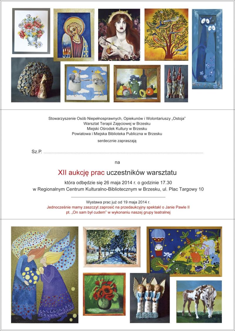 Warsztaty Terapii Zajęciowej zapraszają wszystkich zainteresowanych twórczością artystyczną podopiecznych, na wystawę przedaukcyjną. Wystawa prac potrwa od 16 do 26 maja 2014 r. w sali wystawowej Regionalnego Centrum Kulturalno-Bibliotecznego i zakończy się XII aukcją prac, która odbędzie się 26 maja 2014 r. o godz. 17.30.