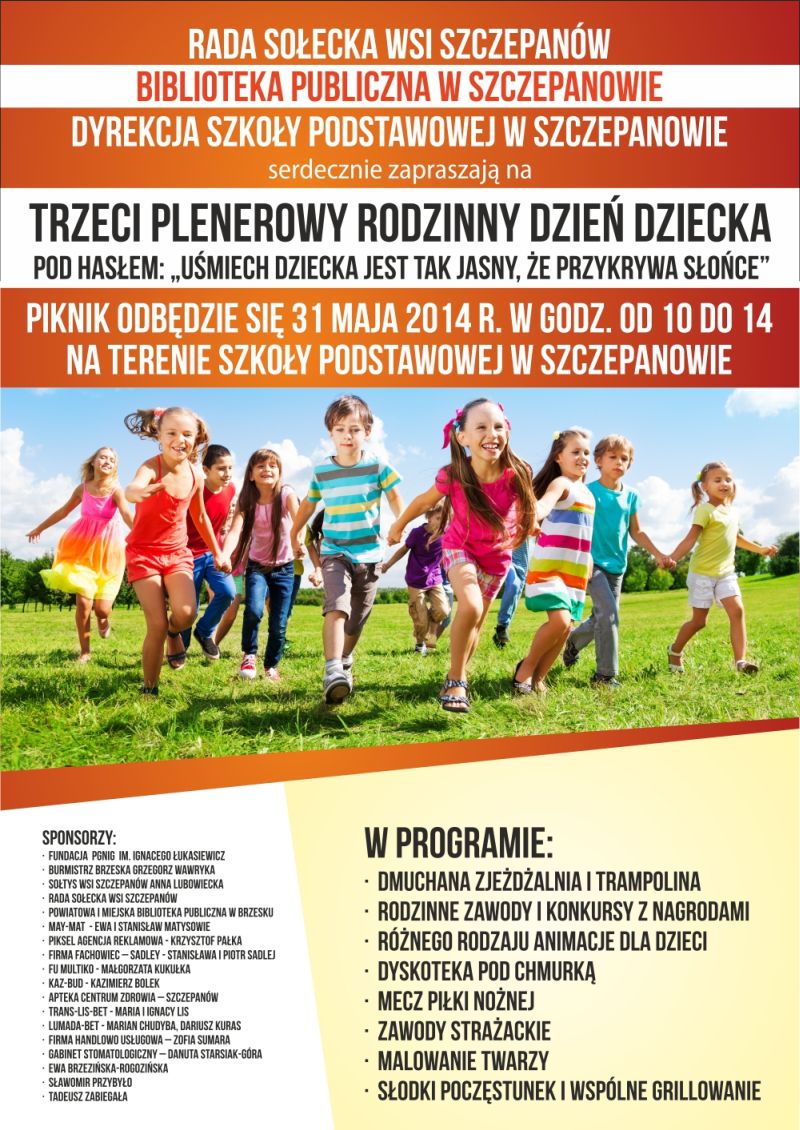 31 maja 2014 roku (sobota) w godzinach od 10.00 – 14.00 na terenie Publicznej Szkoły Podstawowej w Szczepanowie zorganizowany zostanie już po raz trzeci Plenerowy Rodzinny Dzień Dziecka, tym razem pod hasłem „Uśmiech dziecka jest tak jasny, że przykrywa słońce”. Organizatorzy imprezy: Rada Sołecka wsi Szczepanów, Filia Biblioteki Publicznej w Szczepanowie oraz Dyrekcja Publicznej Szkoły Podstawowej przygotowali bardzo ciekawy program, z którego będą mogli wybrać dla siebie coś ciekawego zarówno przedszkolaki, uczniowie, jak i całe rodziny.
