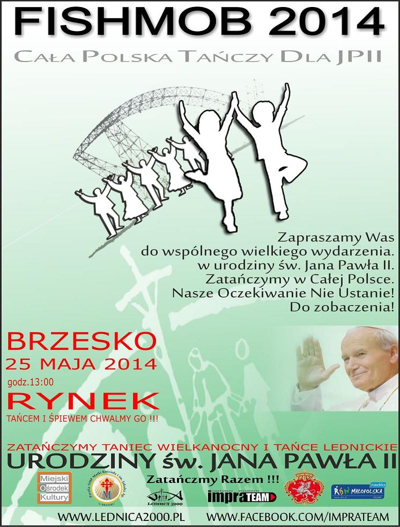 Brzesko zatańczy 25 maja (niedziela) o 13.00 na Rynku w Brzesku podczas trzeciej edycji tanecznego świętowania urodzin Św. Jana Pawła 2. Ta akcja jest częścią "Dni Kultury Chrześcijańskiej Maj 2014" odbywających się w parafii pw. NMP Matki Kościoła i św. Jakuba Ap. w Brzesku. Patronat nad imprezą objął Urząd Miejski w Brzesku, burmistrz Brzeska Grzegorz Wawryka. Organizatorzy zgłosili na Lednicy udział w akcji "Cała Polska Tańczy dla papieża" na tzw. FISHMOB. Są zgłoszeni na oficjalnej stronie Lednicy: http://www.lednica2000.pl/juz-3-edycja-fishmoba-cala-polska-tanczy-jpii/.