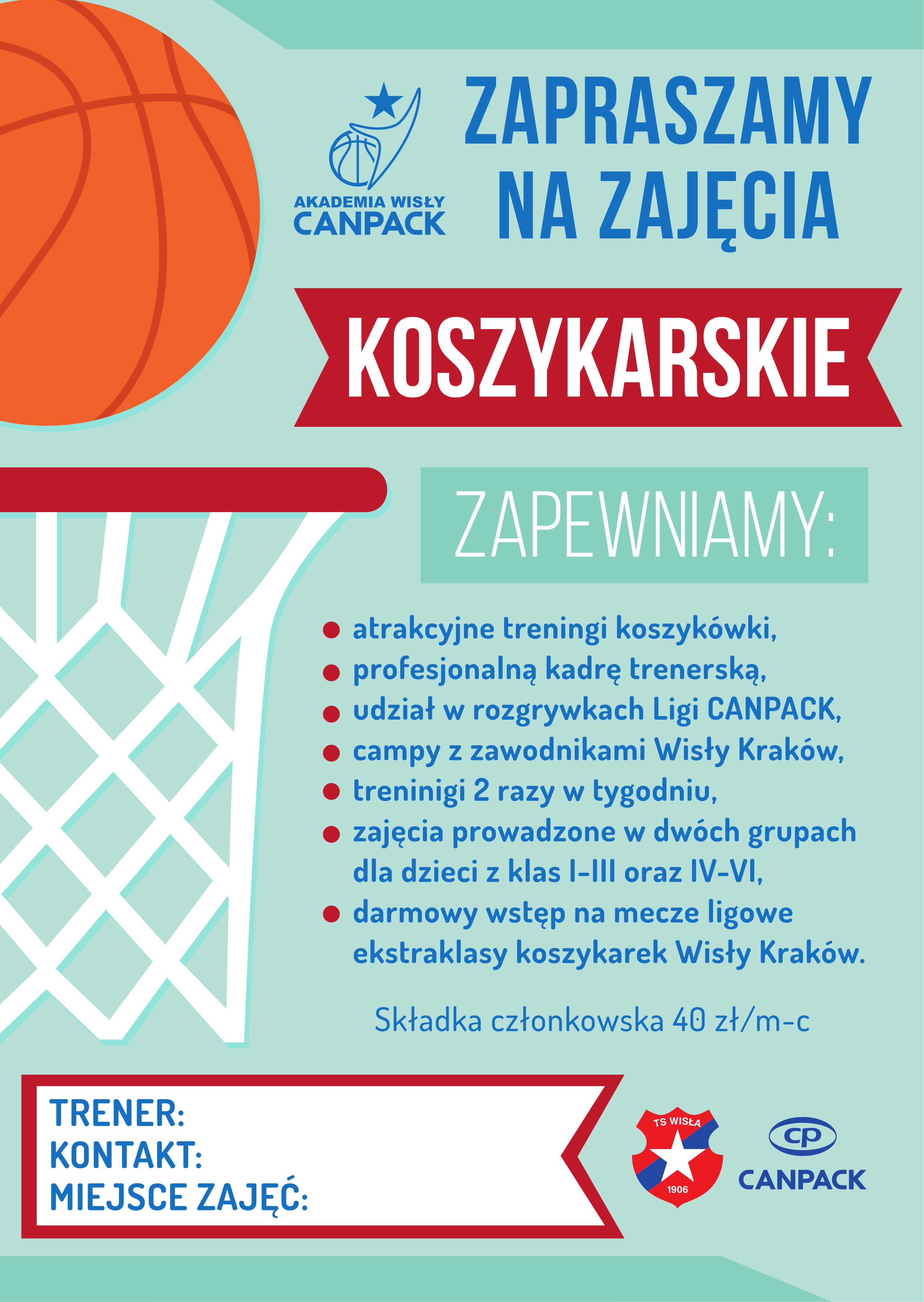 Akademia Wisły Can-Pack zapewnia:- atrakcyjne treningi koszykówki- profesjonalną kadrę trenerską- udział w rozgrywkach ligi Can-Pack- campy z zawodnikami Wisły Kraków- treningi dwa razy w tygodniu- zajęcia prowadzone w dwóch grupach (1-3 GOSiR Mokrzyska, 4-6 Brzesko)- darmowy wstęp na mecze ligowe ekstraklasy koszykarek Wisły Kraków.