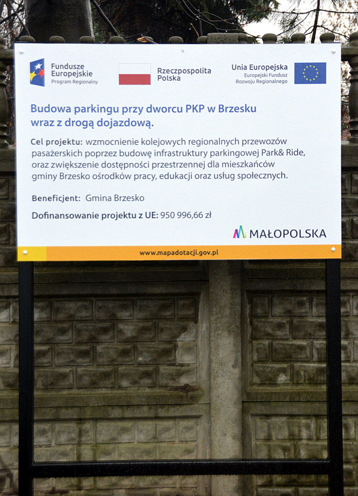 Budowa parkingu przy dworcu PKP w Brzesku objęła 158 miejsc postojowych, w tym 7 dla osób niepełnosprawnych. Łączna powierzchnia użytkowa wynosi 4.527 m2, w tym jezdnia drogi gminnej oraz miejsca postojowe. Nawierzchnie parkingu i dróg dojazdowych wykonano z betonu asfaltowego. Zamontowane zostało oświetlenie, monitoring i urządzenie do automatycznego liczenia pojazdów korzystających z parkingu. Można powiedzieć, że w obecnym kształcie realizuje on założenia parkingów „Parkuj i jedź” (park&ride), wychodząc naprzeciw oczekiwaniom mieszkańców, którzy mogą pozostawić swój samochód osobowy lub rower i udać się w dalszą podróż pociągiem.